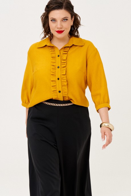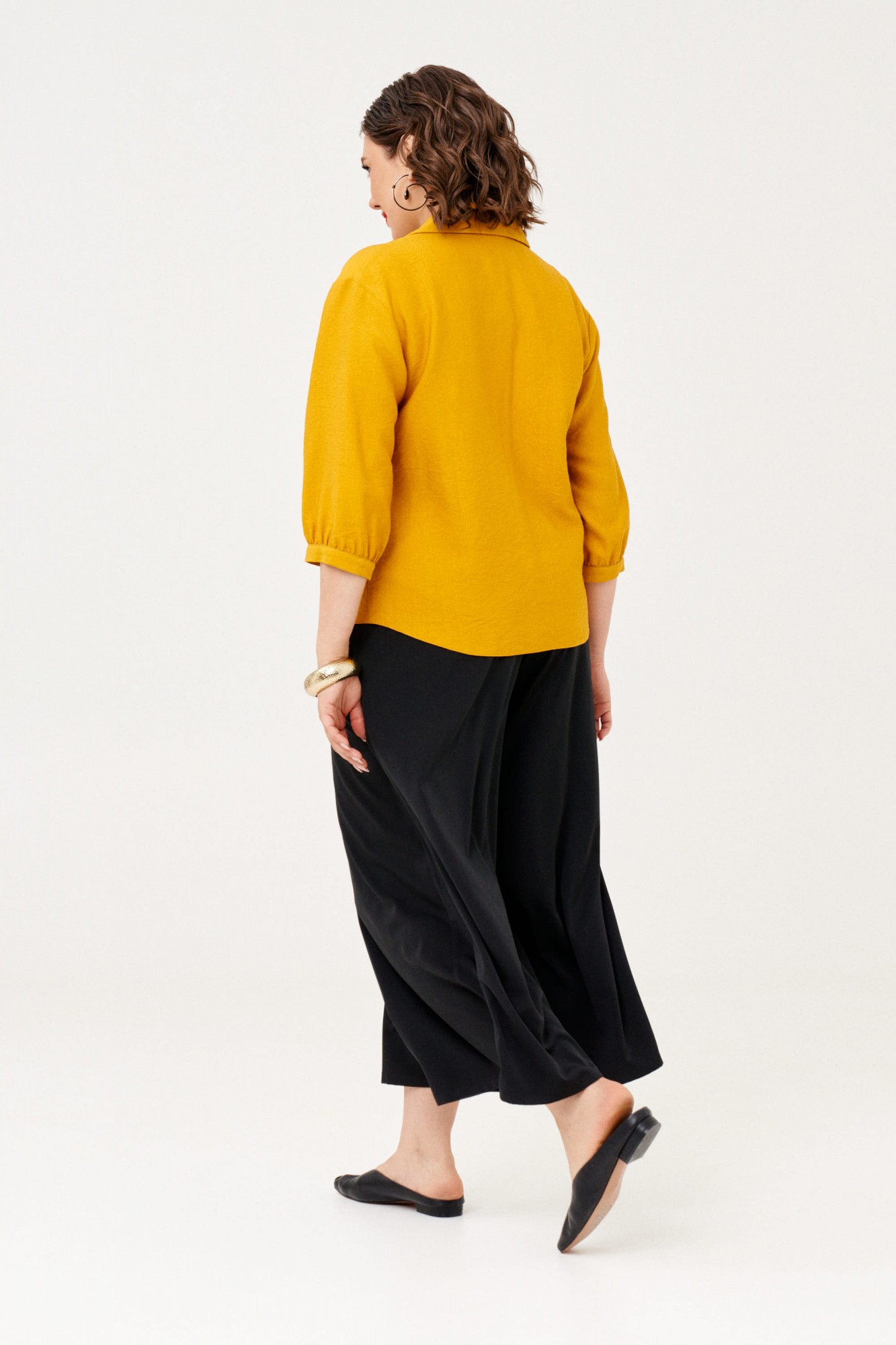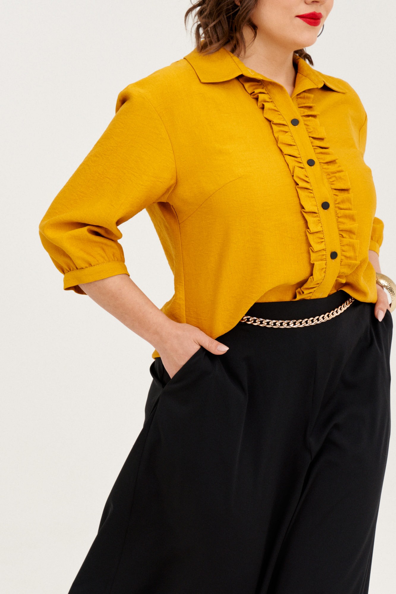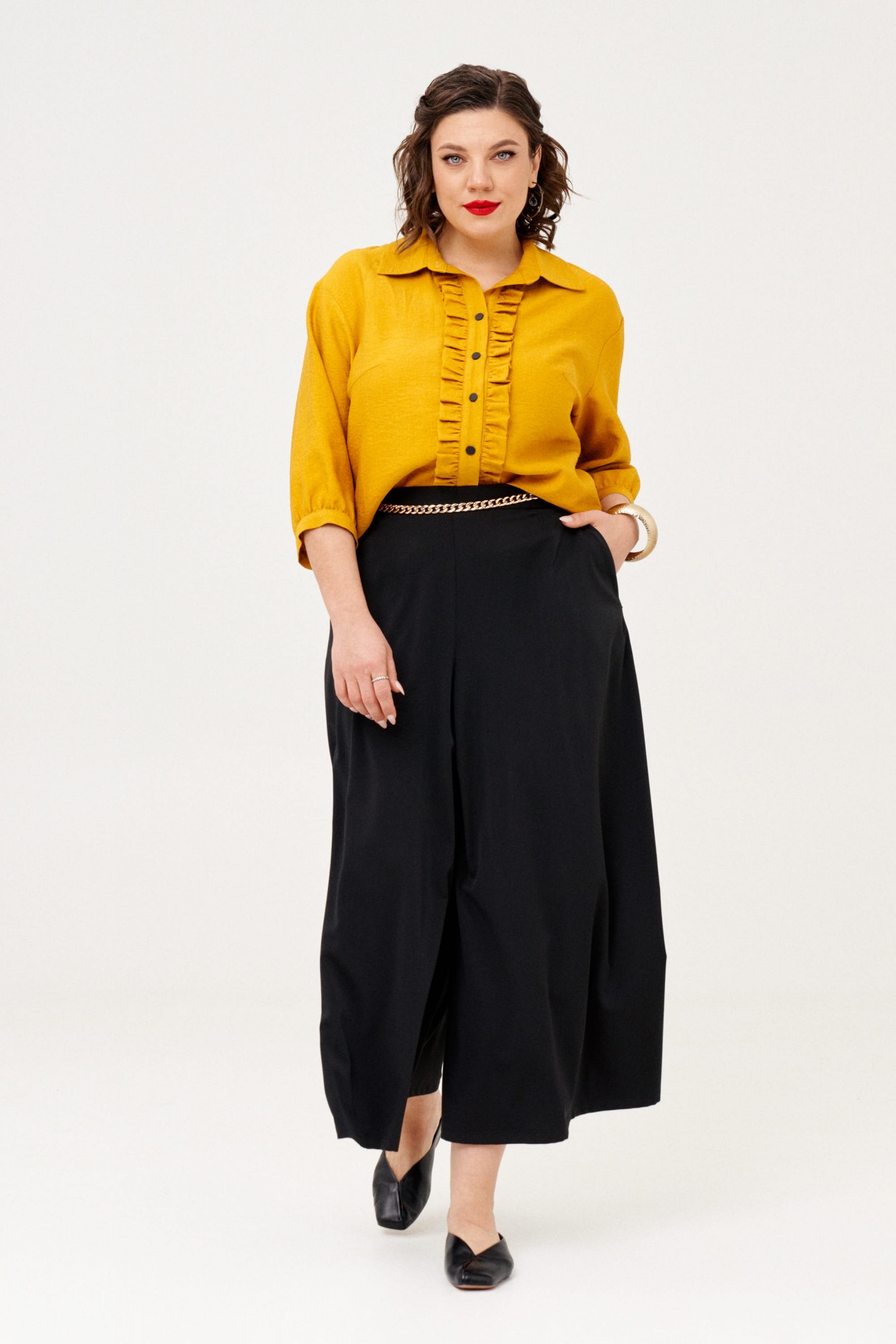 Эффектный женский комплект состоит из блузки и юбки-брюк. Блузка полуприлегающего силуэта со спущенной линией плеча. Рукав 3/4, свободный, заканчивается манжетой без застежки. По переду застежка планка на петли и пуговицы, рюша. Воротник на отрезной стойке. Низ блузки фигурной формы. Юбка-брюки расклешена от бедра. Пояс притачной, резинка застежка сбоку на потайную молнию. Внутренние карманы. Декоративное украшение по поясу(цепь).