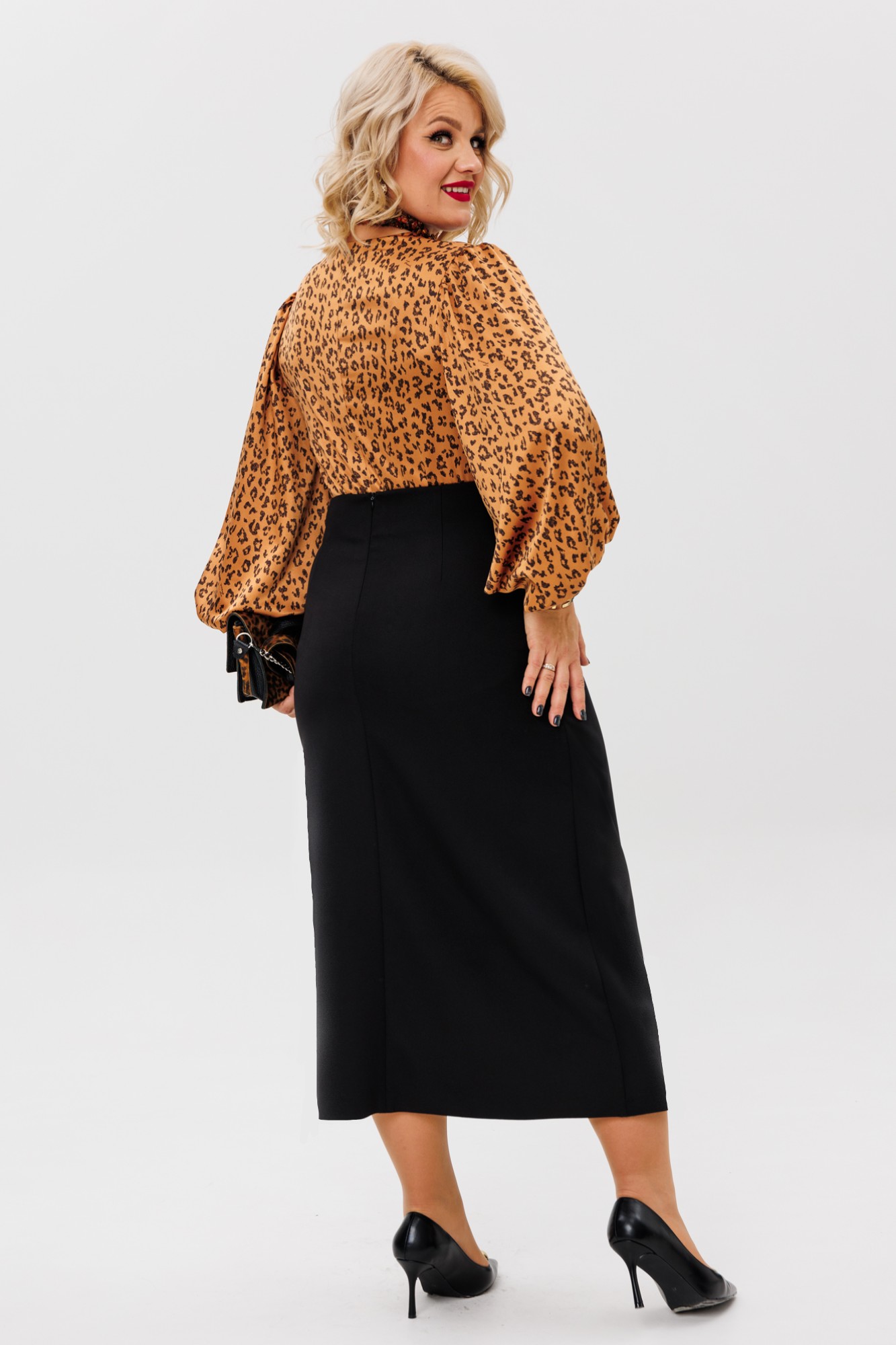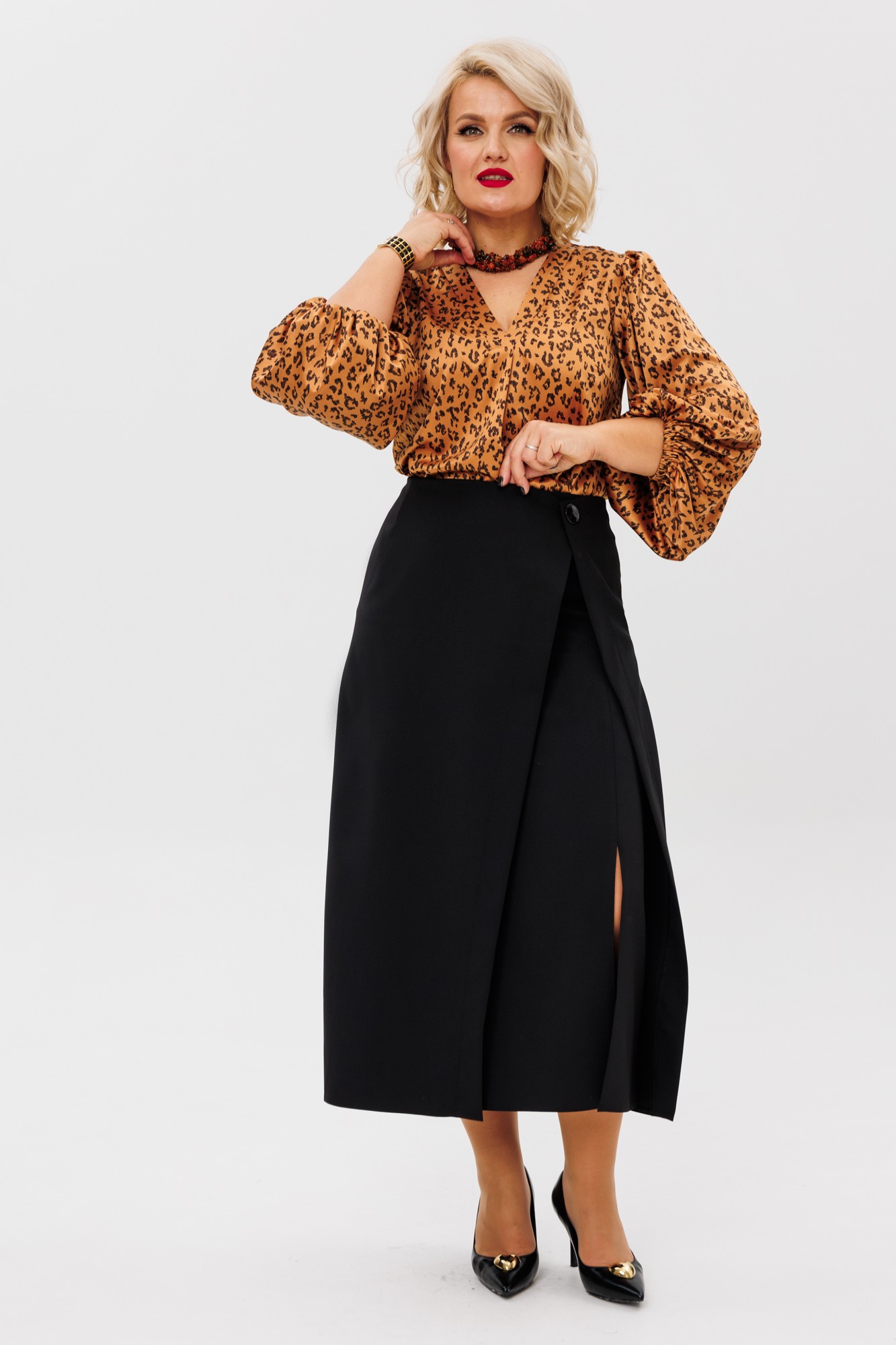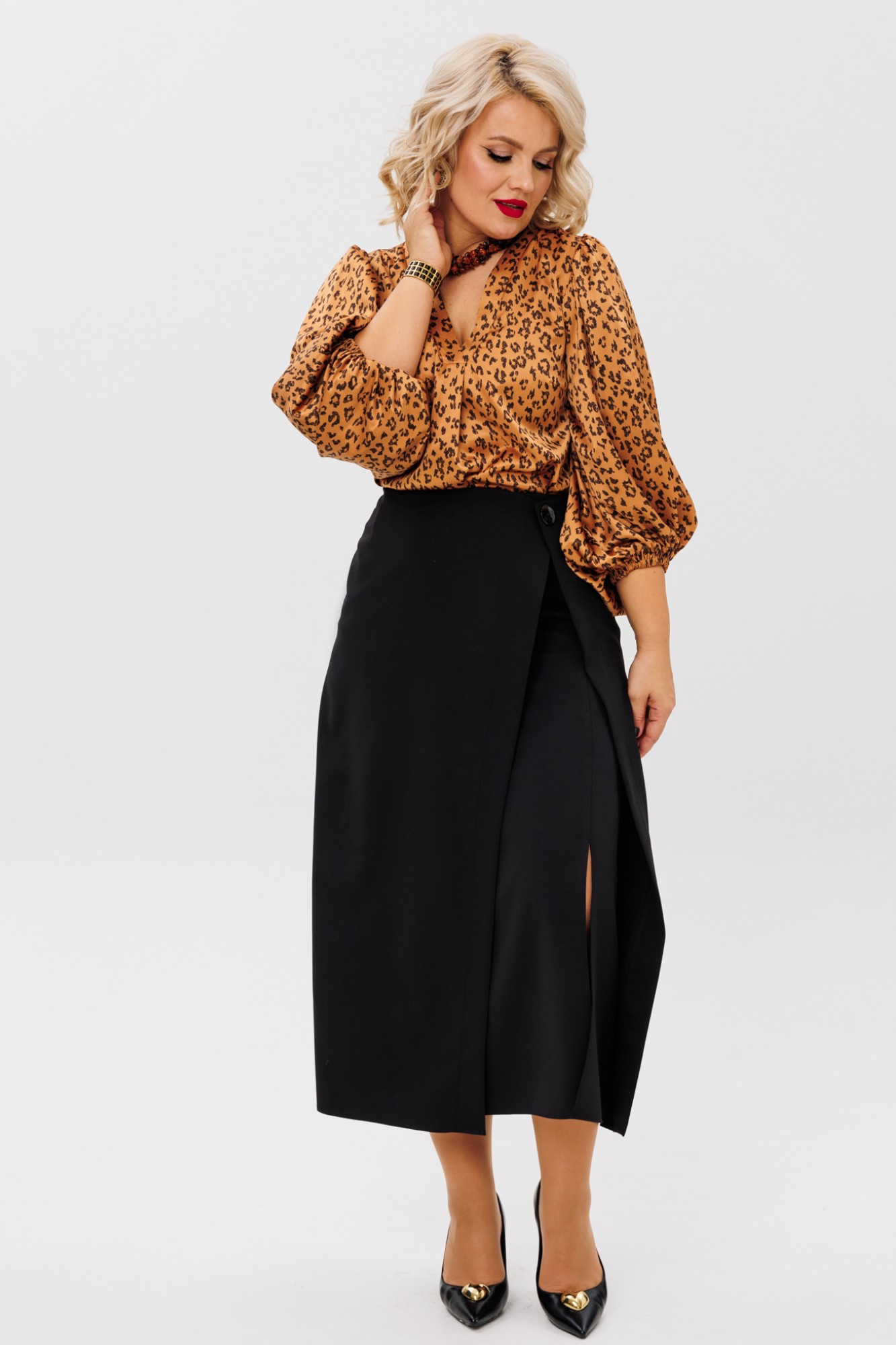 Бренд белорусской женской одежды Anastasia представляет комплект двойку. Комплект женский 2-х предметный (блузка, юбка) станет отличным дополнением к Вашему гардеробу. Подойдет для повседневной носки (работа, офис, прогулки) и на праздничный выход. Блузка из атласной ткани полуприлегающего силуэта. По полочке идет нагрудная выточка из бокового шва. Вырез V-образной формы с планками и складкой по центру. По спинке средний шов, рукав объёмный, по окату сборка. Низ рукава фигурный, на резинке. Юбка А-силуэта из текстильной ткани. Пояс на обтачке. По переду юбка двойная. Верхний слой: запах в виде косых подрезов, начинающихся от пояса; нижний слой с подрезом по линии колена, переходящим в разрез. В качестве декора пуговица. По спинке средний шов с молнией.