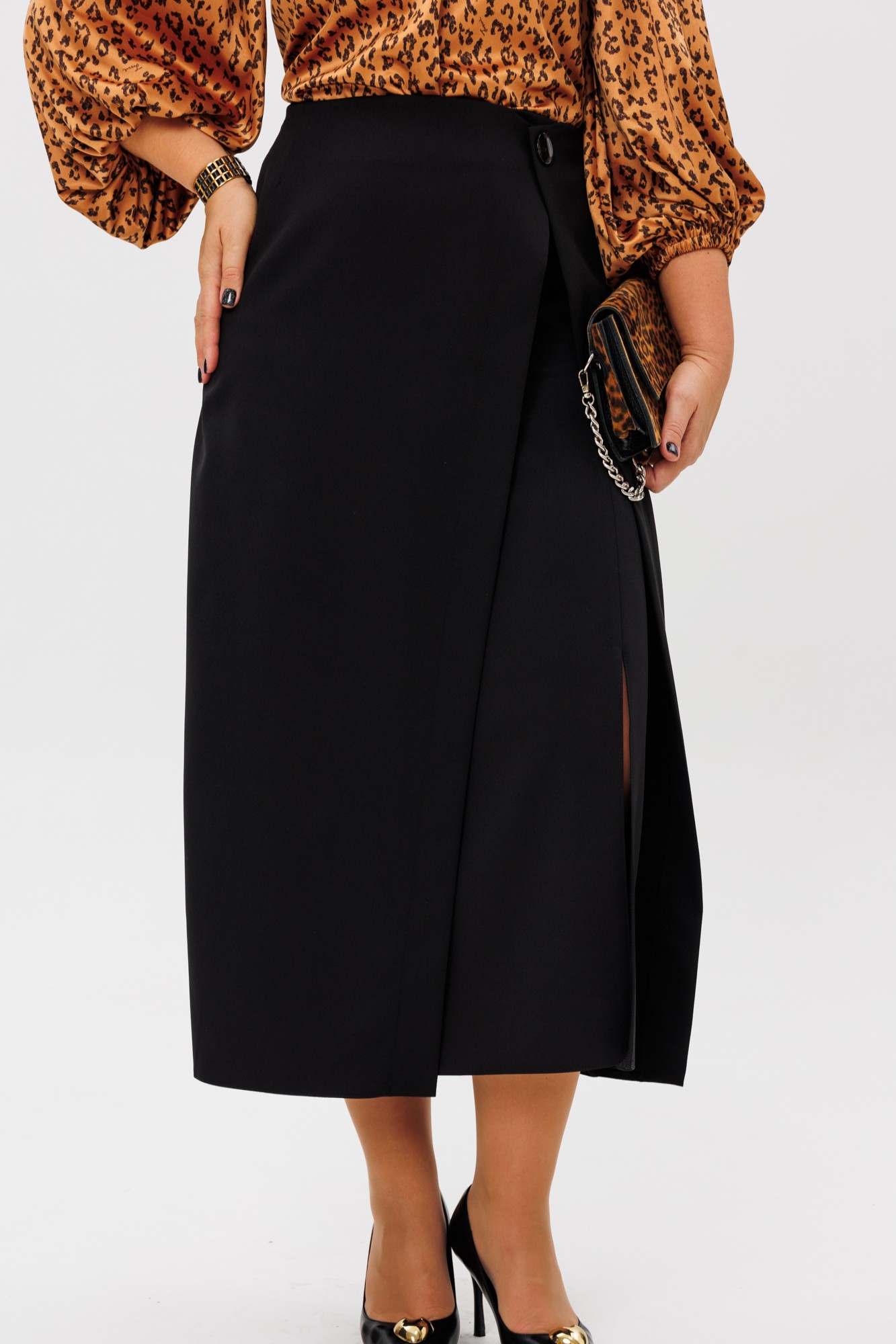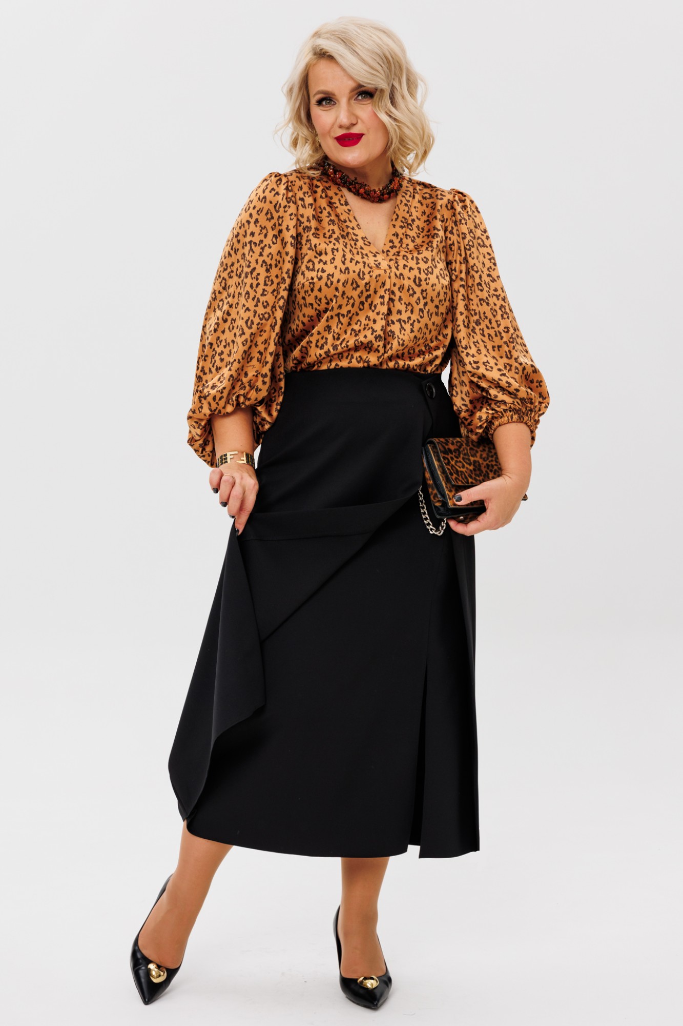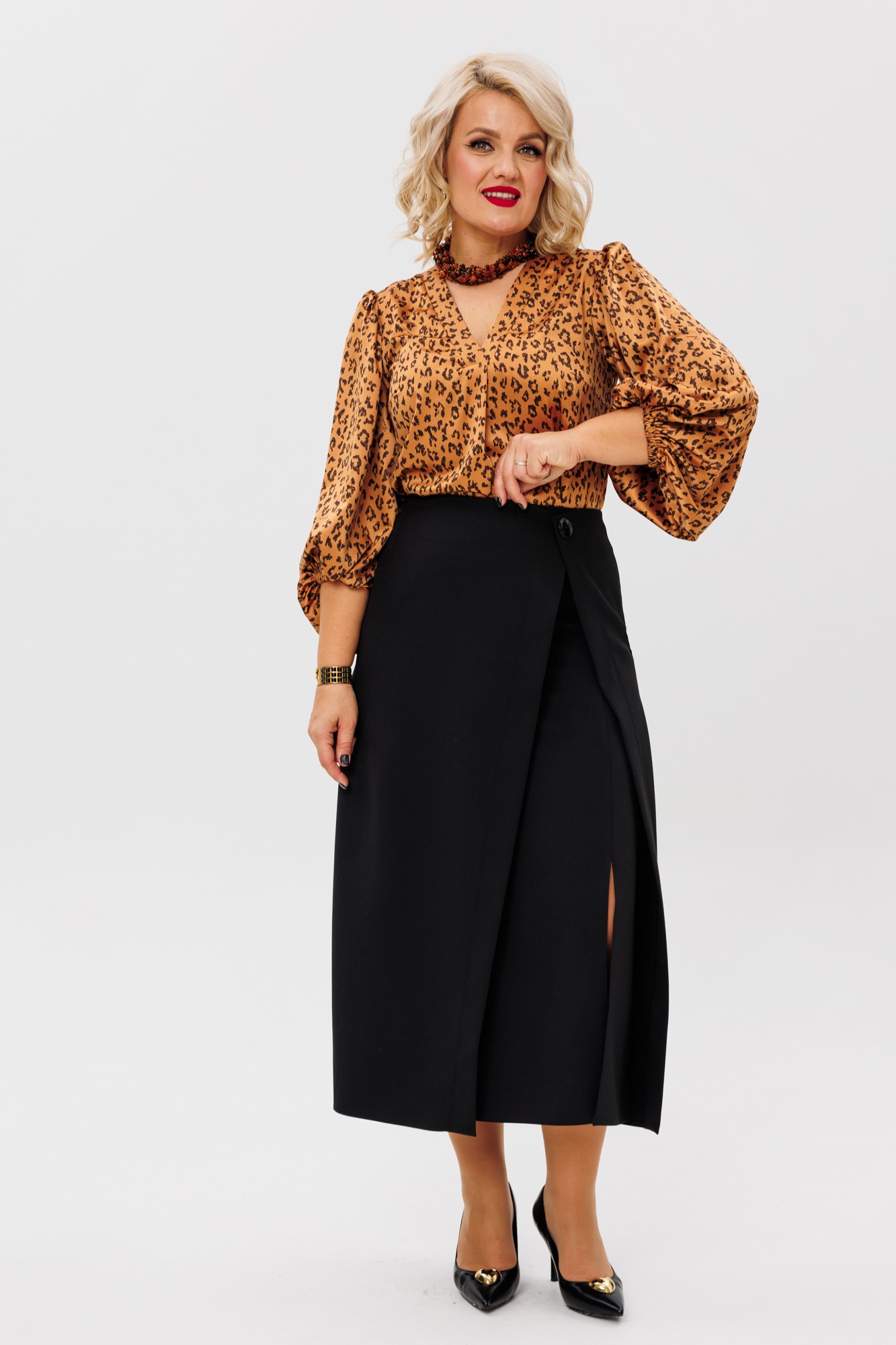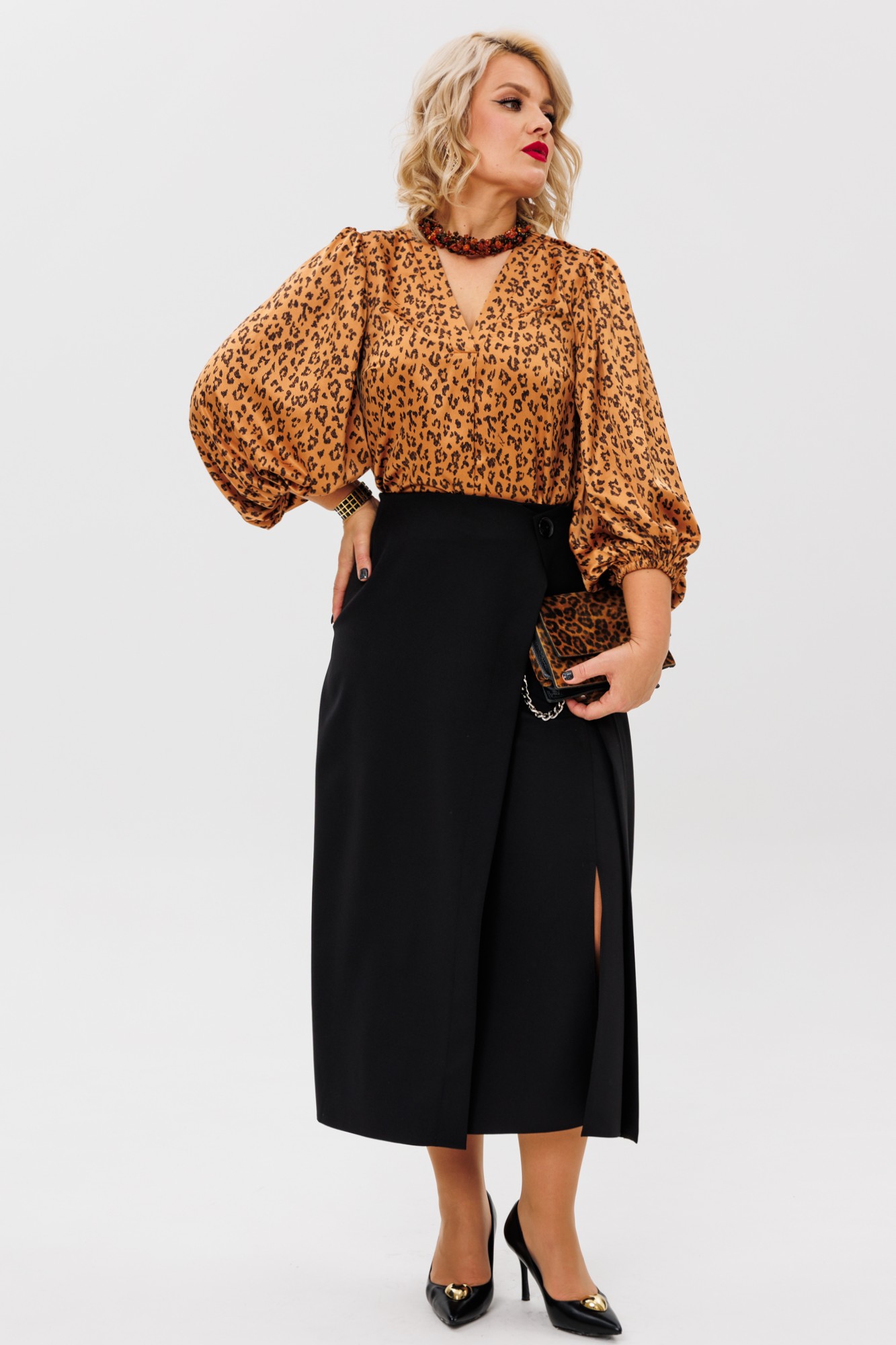 Бренд белорусской женской одежды Anastasia представляет комплект двойку. Комплект женский 2-х предметный (блузка, юбка) станет отличным дополнением к Вашему гардеробу. Подойдет для повседневной носки (работа, офис, прогулки) и на праздничный выход. Блузка из атласной ткани полуприлегающего силуэта. По полочке идет нагрудная выточка из бокового шва. Вырез V-образной формы с планками и складкой по центру. По спинке средний шов, рукав объёмный, по окату сборка. Низ рукава фигурный, на резинке. Юбка А-силуэта из текстильной ткани. Пояс на обтачке. По переду юбка двойная. Верхний слой: запах в виде косых подрезов, начинающихся от пояса; нижний слой с подрезом по линии колена, переходящим в разрез. В качестве декора пуговица. По спинке средний шов с молнией.