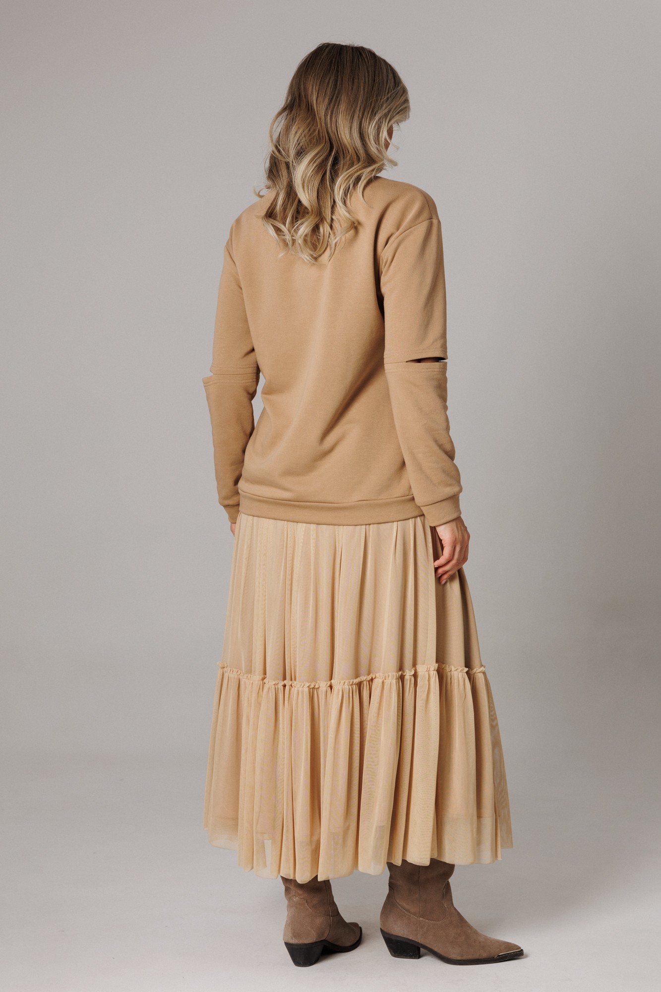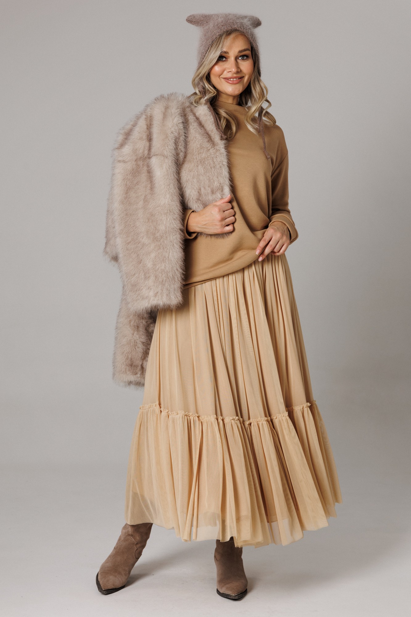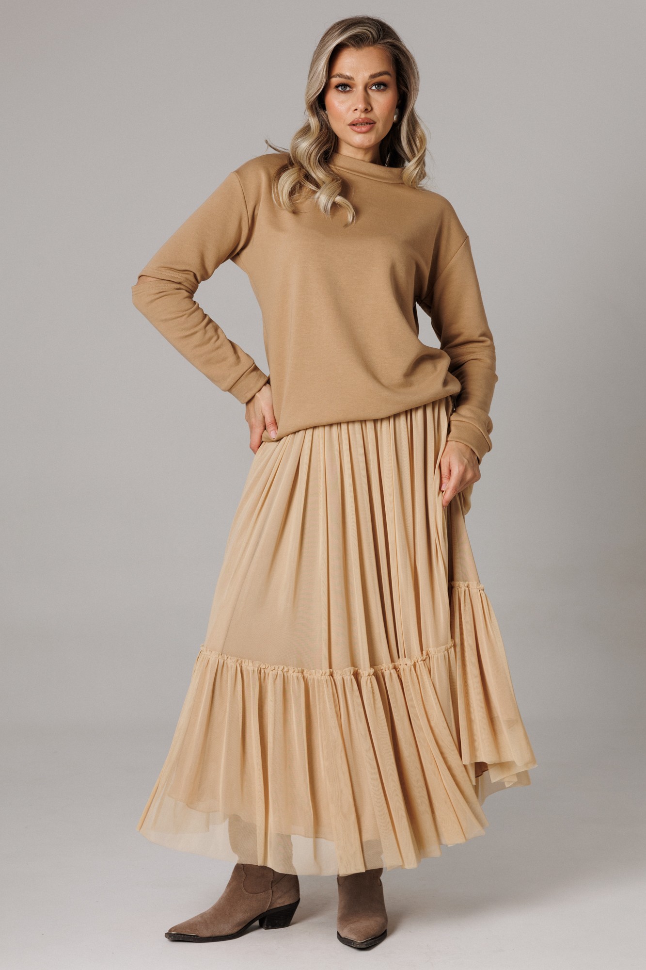 Оригинальный женский комплект от бренда Anastasia, идеальный для любого случая. Этот костюм сочетает в себе элегантность и комфорт, что делает его подходящим как для повседневной носки, так и для праздничных мероприятий. Джемпер оверсайз из трикотажного полотна. Прямого силуэта со спущенным плечом. Воротник-стойка. По рукаву идет подрез с разрезом. Низ рукава и низ джемпера - на манжете. Джемпер легко сочетается с любыми низами: брюки, джинсы, юбка. Юбка макси из 2-х видов ткани: верх с отрезным воланом из стрейчевой сетки, подкладка юбка солнце из шифона. Пояс на декоративной резинке. Фасон универсален, а использование резинки на поясе повышает комфортность носки, позволяя юбке адаптироваться под индивидуальные особенности фигуры. Юбку легко сочетать с различными верхами: топ, блузка, футболка, кружевной жакет, свитер или жакет из текстиля - все это позволит создавать различные образы на разные случаи.