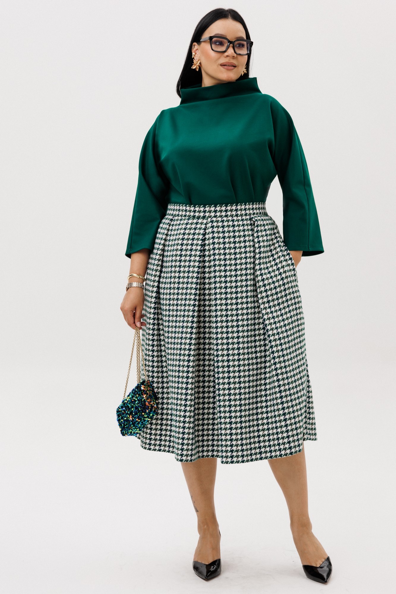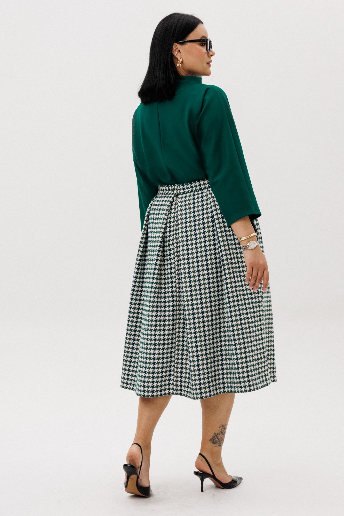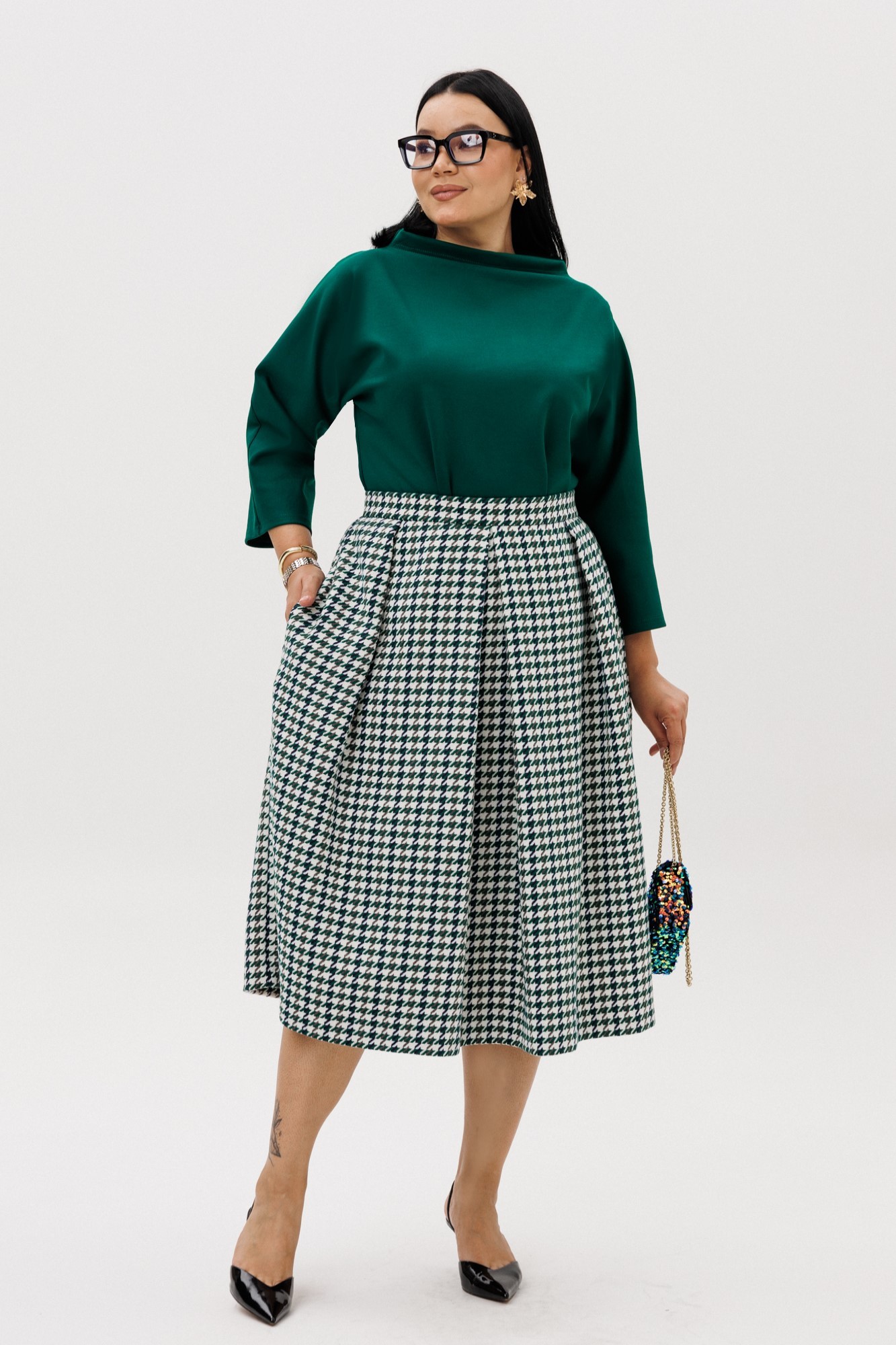 Представляем вашему вниманию стильный и уютный комплект, который станет настоящим маст-хэвом в вашем гардеробе. Классический дизайн в стиле олд мани создает атмосферу расслабленности и уюта. Этот комплект станет вашим верным спутником в любой ситуации, добавляя нотки элегантности и шарма в вашу повседневную жизнь. Отражает роскошь, придает элегантность и изысканность, будет великолепно смотреться на любой фигуре и привлечет к вам внимание окружающих. Комплект женский 2-х предметный (блузка, юбка).Блузка женская ,прямого силуэта, из плотного трикотажного полотна. Рукав "летучая мышь", 3/4 длины. Горловина цельнокроеная в виде стойки. Юбка из фактурной ткани в рубчик с принтом гусиная лапка - теплая, плотная и качественная, практически не мнется. В верхней части идут складки: по центру-встречная, по бокам - односторонние. Пояс отрезной, по бокам карманы. Застежка по спинке на потайную молнию и пуговицу. Юбка на подкладке. Отдельные части комплекта будут легко сочетаться с вещами из вашего гардероба.