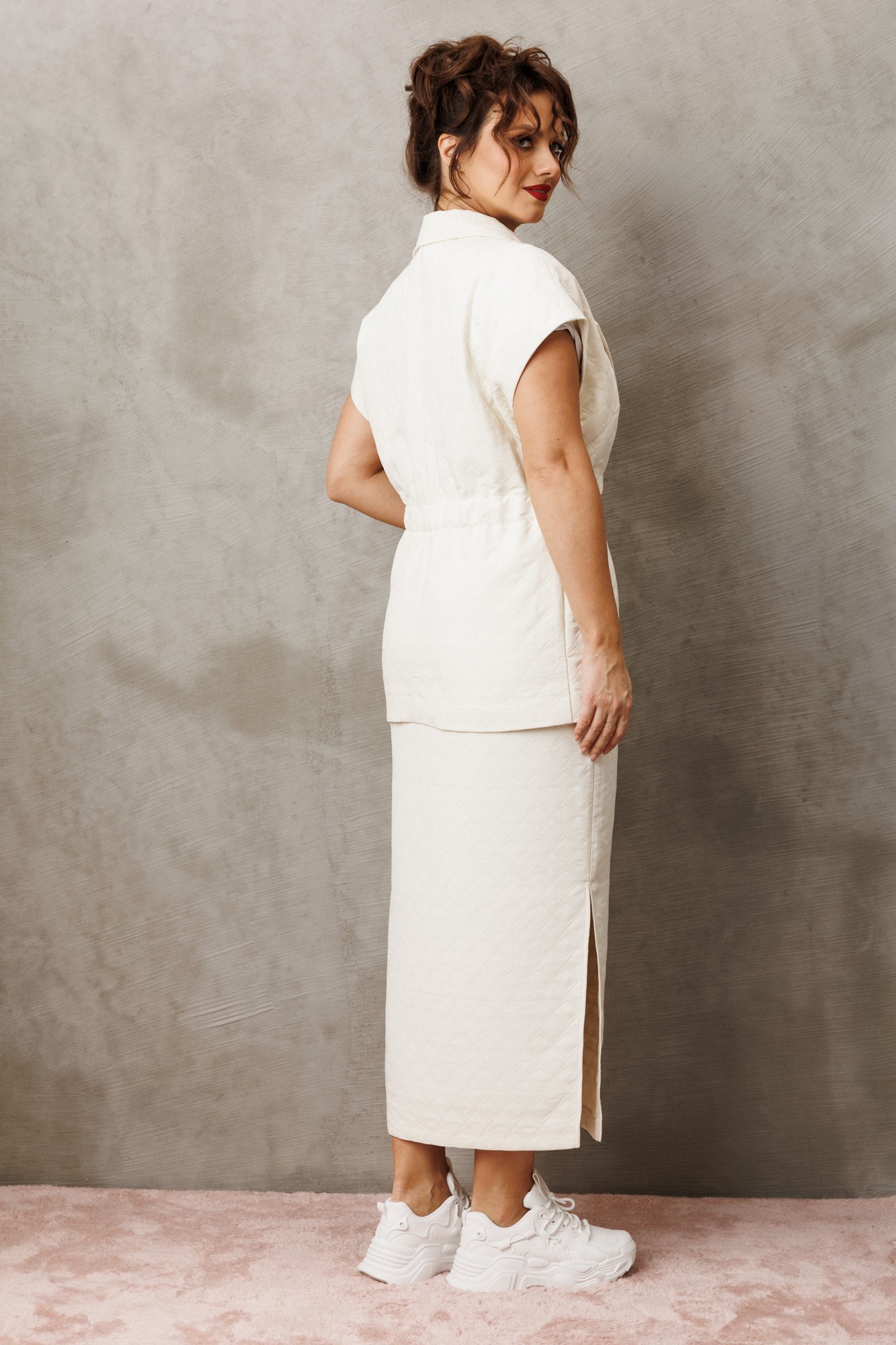 Бренд белорусской женской одежды больших размеров Anastasia представляет костюм двойку. Костюм женский 2-х предметный (жилет, юбка) из стеганной ткани станет отличным дополнением к Вашему гардеробу. Подойдет для повседневной носки (работа, офис, прогулки). Достаточно дополнить его соответствующими предметами из вашего гардероба: блузка, майка, водолазка, гольф, свитер, лонгслив, свитшот. Жилет прямого силуэта, со спущенным плечом. Может быть самостоятельным элементом гардероба. Застежка двубортная, воротник английского типа. По полочке идет грудовая выточка из бокового шва, по спинке средний шов, по талии кулиска-резинка, по бокам -карманы. Юбка-макси, зауженная к низу, по бокам разрезы. Пояс отрезной на резинке. Благодаря своему крою и фасону костюм подчеркивает женственные формы и скрывает то, что должно быть незаметным. Это повседневный вариант на каждый день для занятий в школе или для офиса, на работу или на прогулку. Наденьте его на деловую встречу, официальное мероприятие, школьное торжество. Модель подойдёт для образа в университет или колледж. Этот предмет одежды подчеркнет вашу элегантность и сделает образ более женственным. Одежда для женщин больших размеров и не только, по отличным ценам и высокого качества - это Anastasia! Добавляете нас в любимые бренды и вы всегда будете в курсе всех акций и новинок! Хороших покупок от «Анастасия»