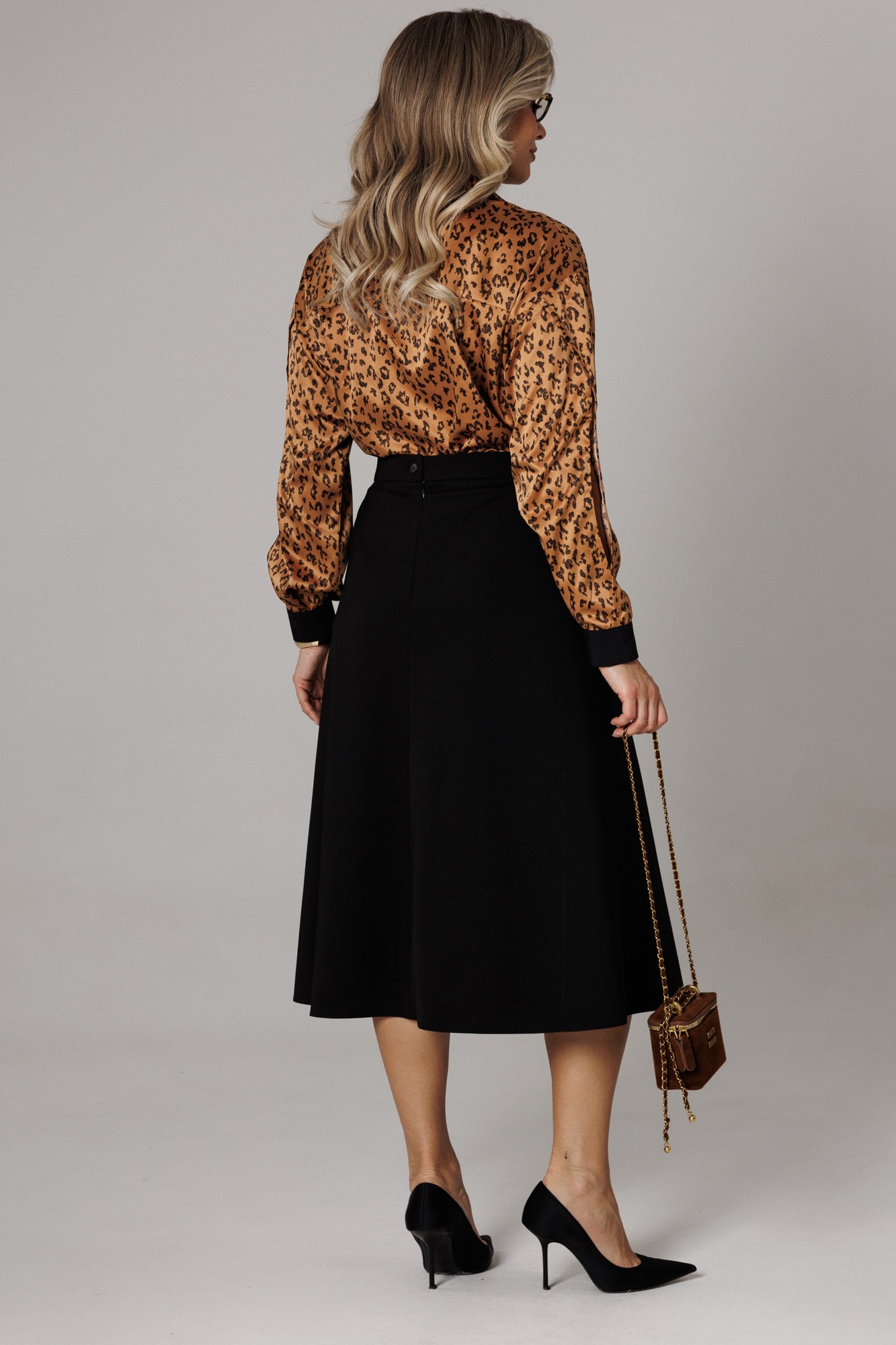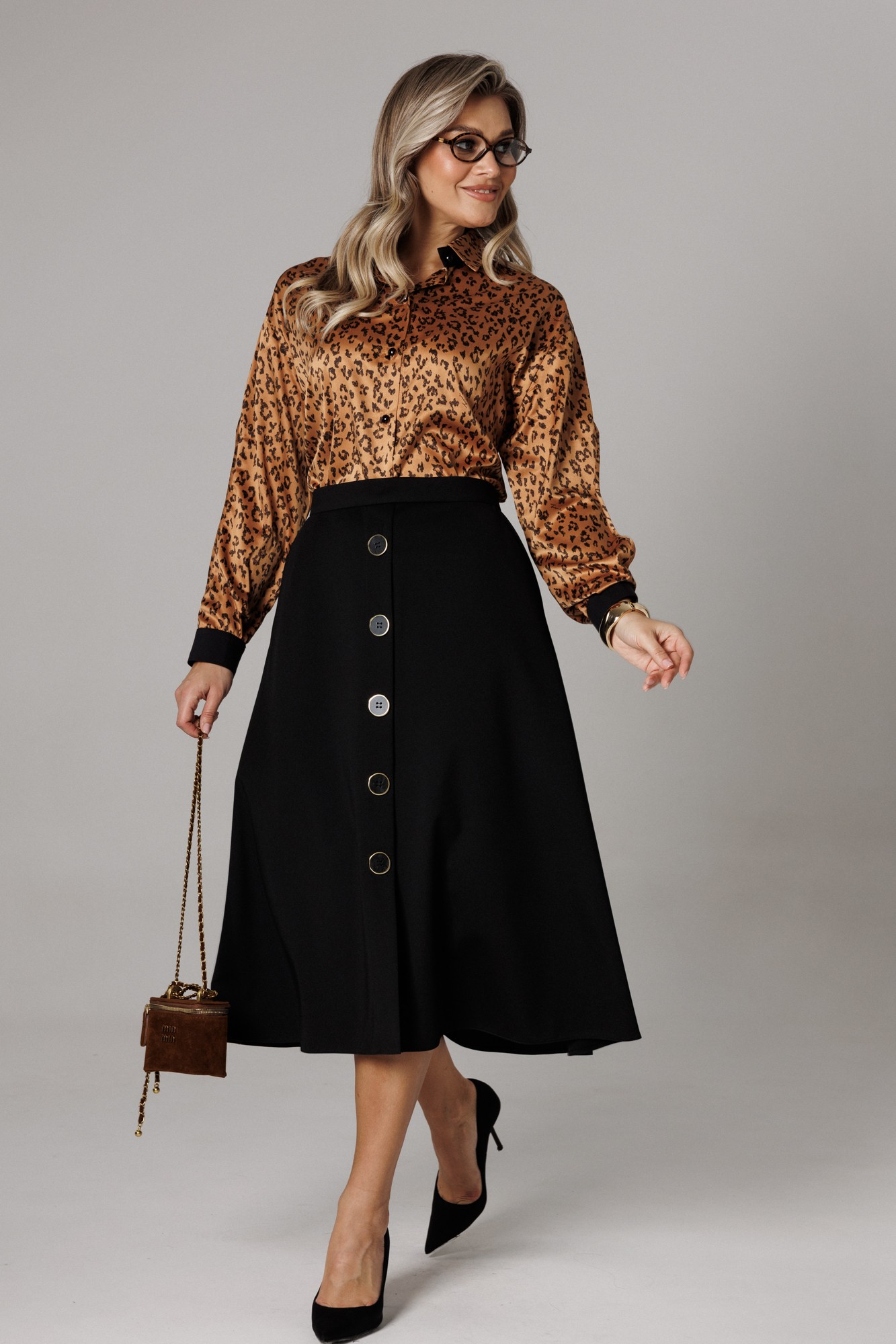 Оригинальный комплект женский 2-х предметный (блузка, юбка) от бренда Anastasia, идеальный для любого случая. Этот комплект сочетает в себе элегантность и комфорт, что делает его подходящим как для повседневной носки, так и для праздничных мероприятий. Блузка из атласной ткани прямого силуэта со спущенным плечом. По бокам закругленные разрезы. Рукав с запахом и разрезом, на манжете. Застежка – планка на петли и пуговицы. Воротник на отрезной стойке. Стойка и манжета из отделочной ткани. По спинке идет отрезная кокетка. Такой женский офисный стиль можно носить, сочетая с другими вещами гардероба, создавая новые образы. Ткань атласная качественная и очень комфортная. Юбка А-силуэта, длинна миди. По передней части идет застежка-обманка с пуговицами. По бокам карманы. По спинке средний шов, переходящий в застежку молнию. Пояс отрезной.