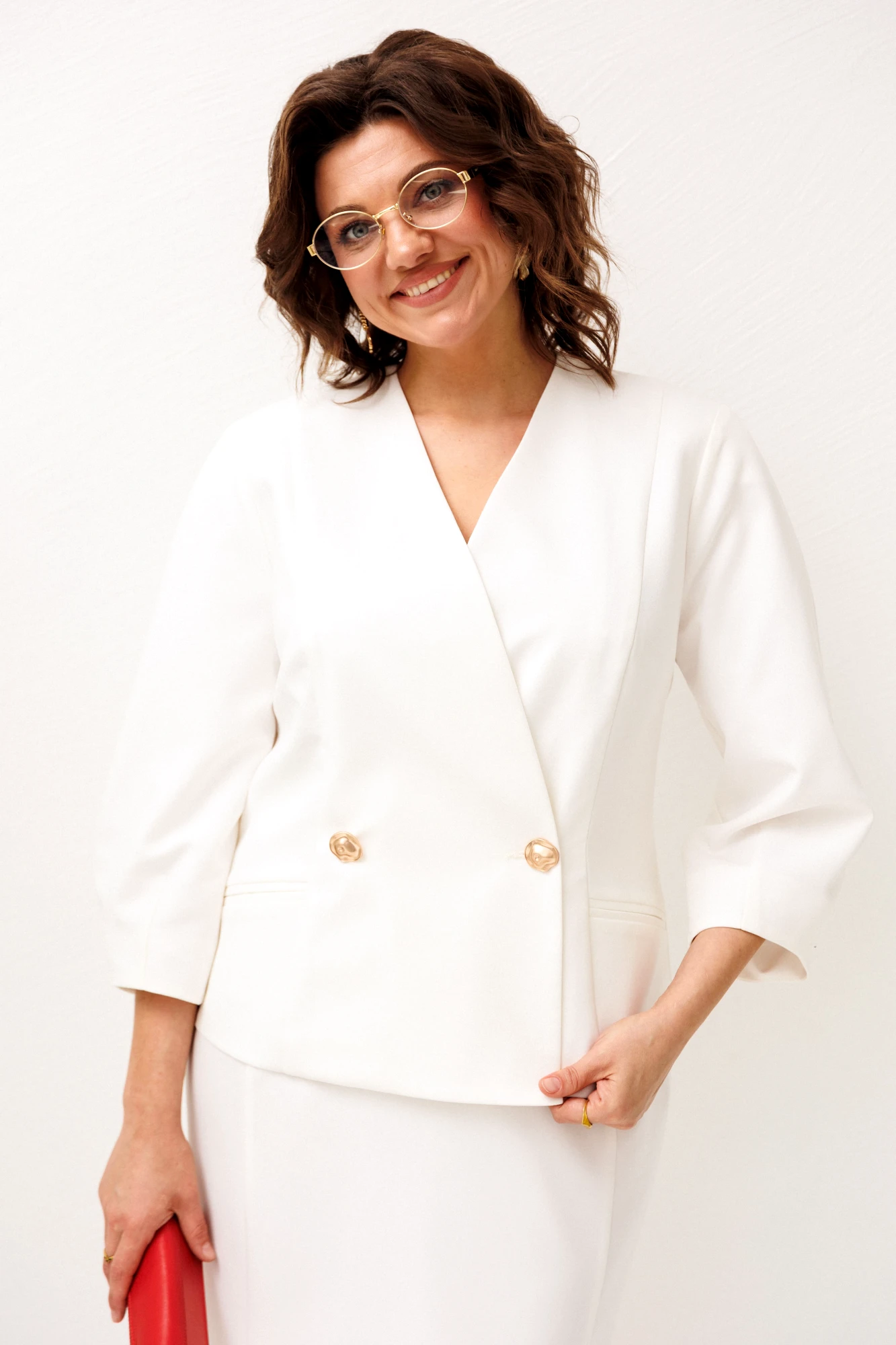 Костюм в нежном оттенке «лебедь» звучит спокойно и благородно, создавая образ, в котором сочетаются женственность, лёгкость и уверенная элегантность.