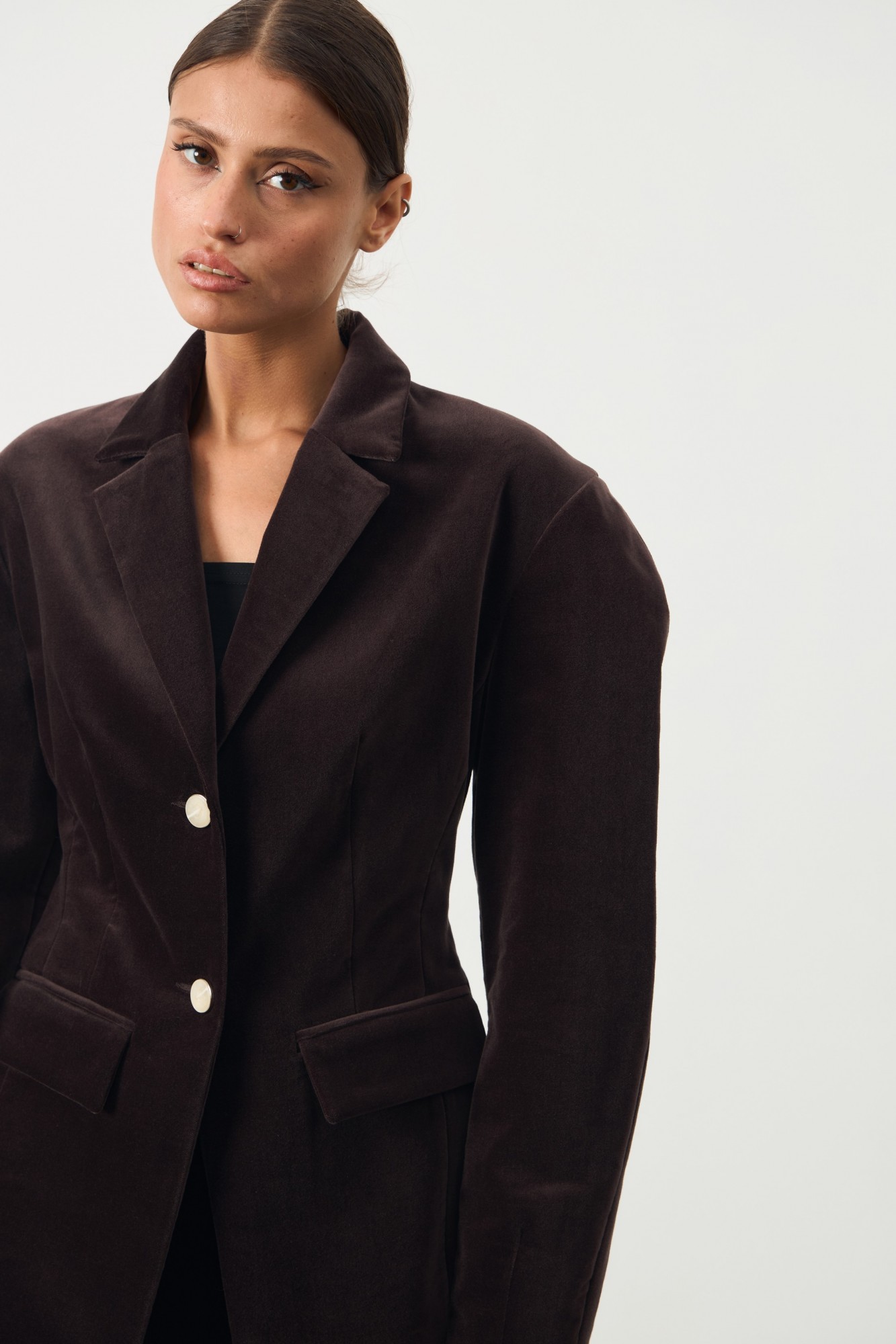 Жакет с увеличенной линией плеча. Застежка на пуговицы. Рукав-фонарь. По переду изделия карманы с листочкой. Воротник с лацканом. Юбка в длине мини, прямого силуэта на поясе. Застежка-молния.