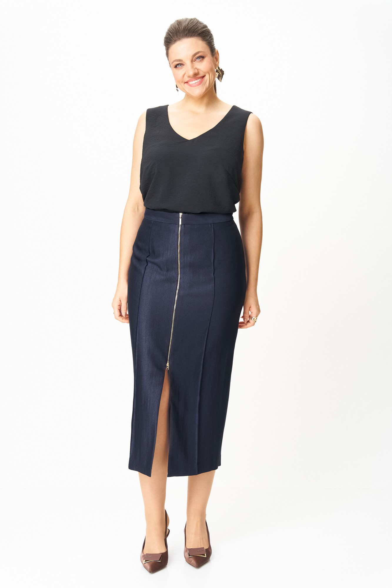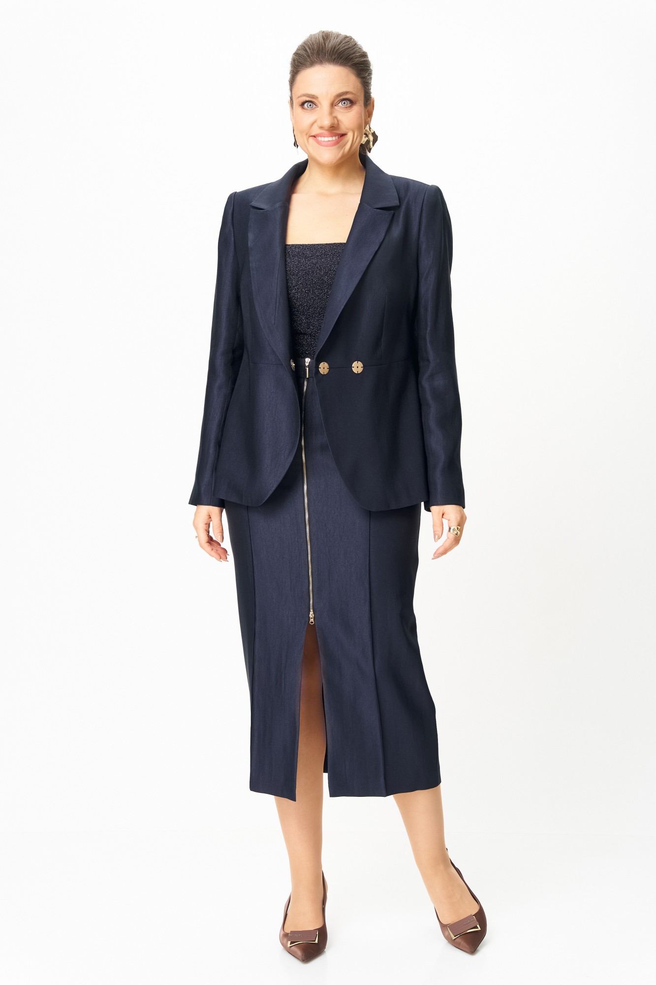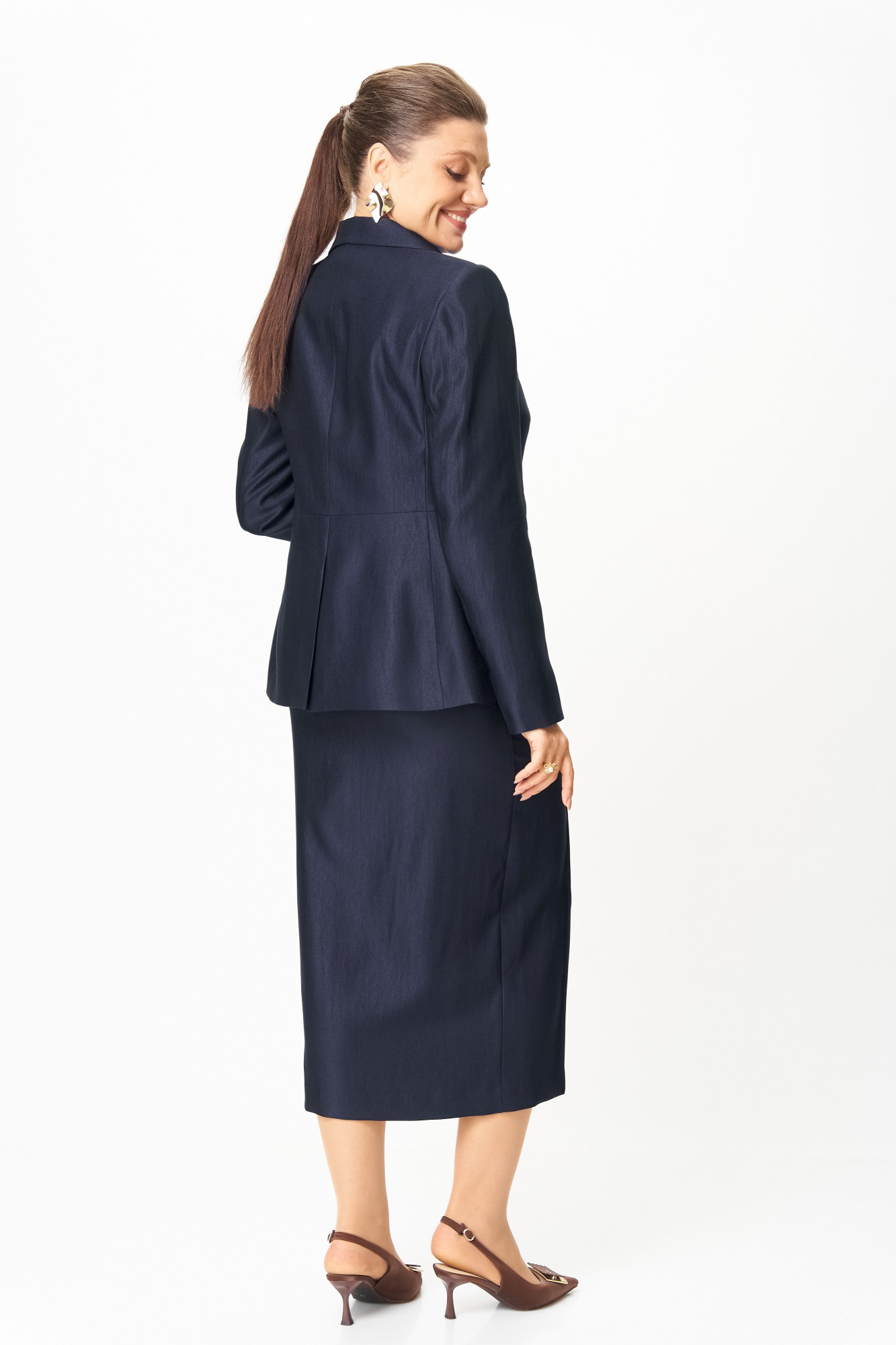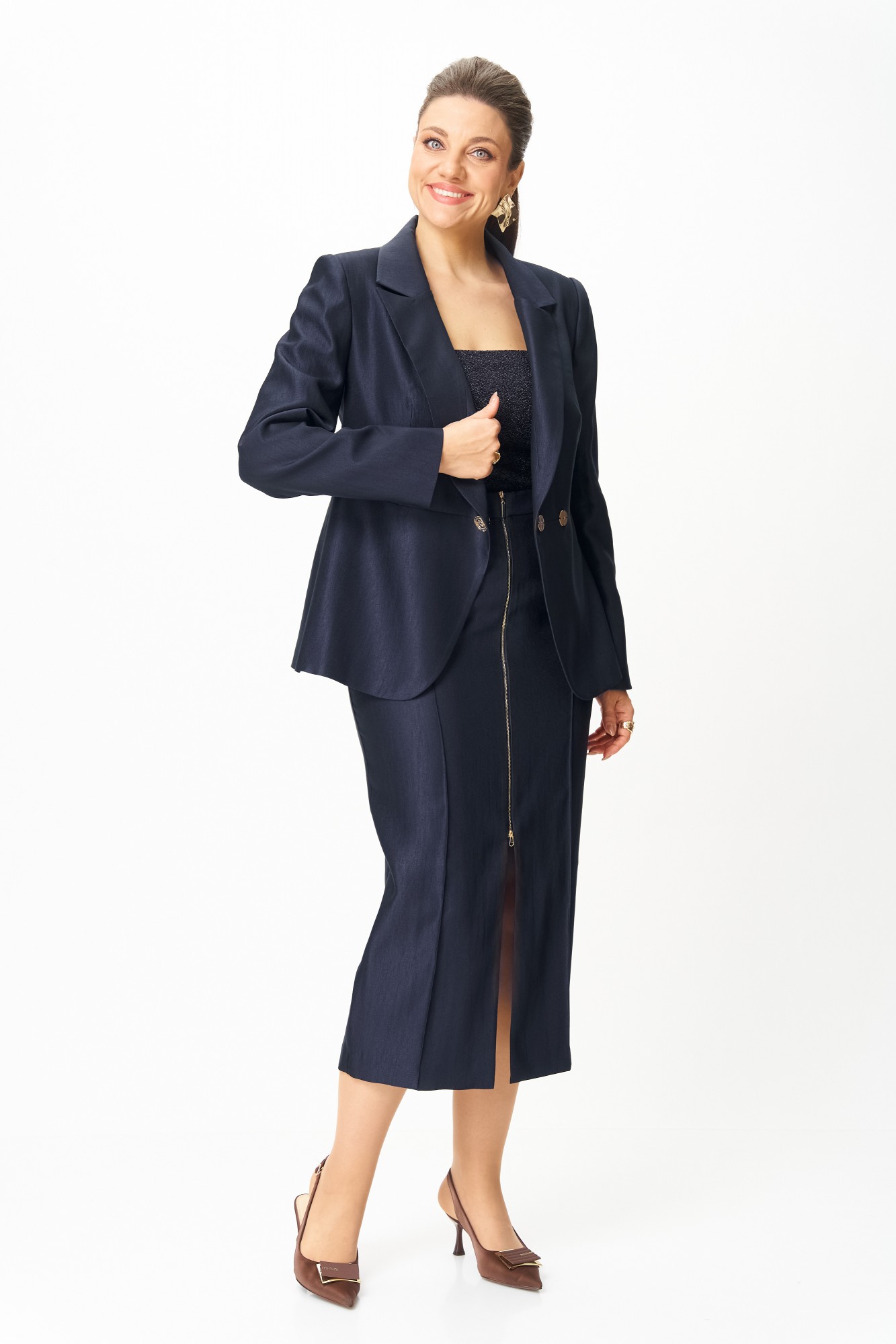 Стильный женский костюм, выполнен в классическом стиле из костюмной ткани с блеском, состоит из жакета и юбки. Жакет полуприлегающего силуэта, отрезной по линии талии, горловина оформлена воротником пиджачного типа с отложными лацканами, застежка по линии талии на кнопки, по краю борта пришита декоративная пуговица. В центральном шве спинки шлица. Рукава втачные. Жакет на подкладке. Юбка прилегающего силуэта, заужена к низу, по переде застрочены рельефные швы, застежка на декоративную молнию по центру переда. Верх юбки на притачной поясе. Юбка на подкладке.