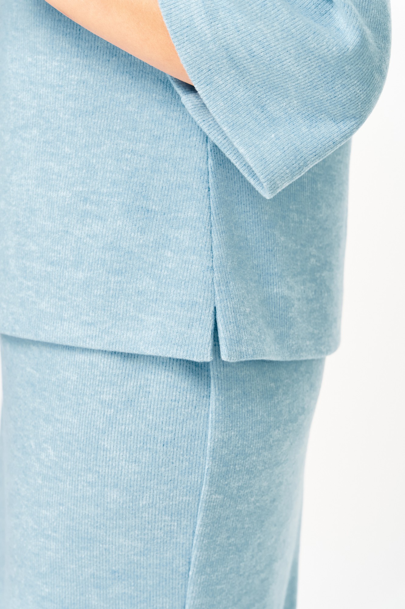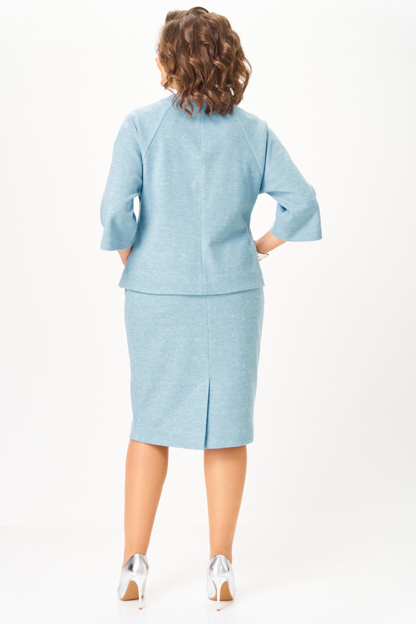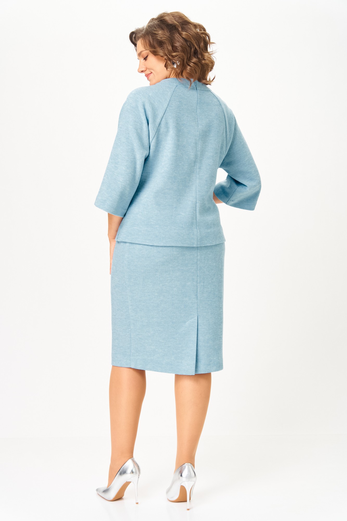 Элегантный женский костюм состоит комфортного трикотажного полотна. Блузон полуприлегающего силуэта, с рукавом реглан. Горловина круглая, оформлена воротником стойка. В боковых швах по низу разрезы. Юбка прямая, по низу шлица, верх юбки оформлен поясом на резинке. Костюм без подкладки.