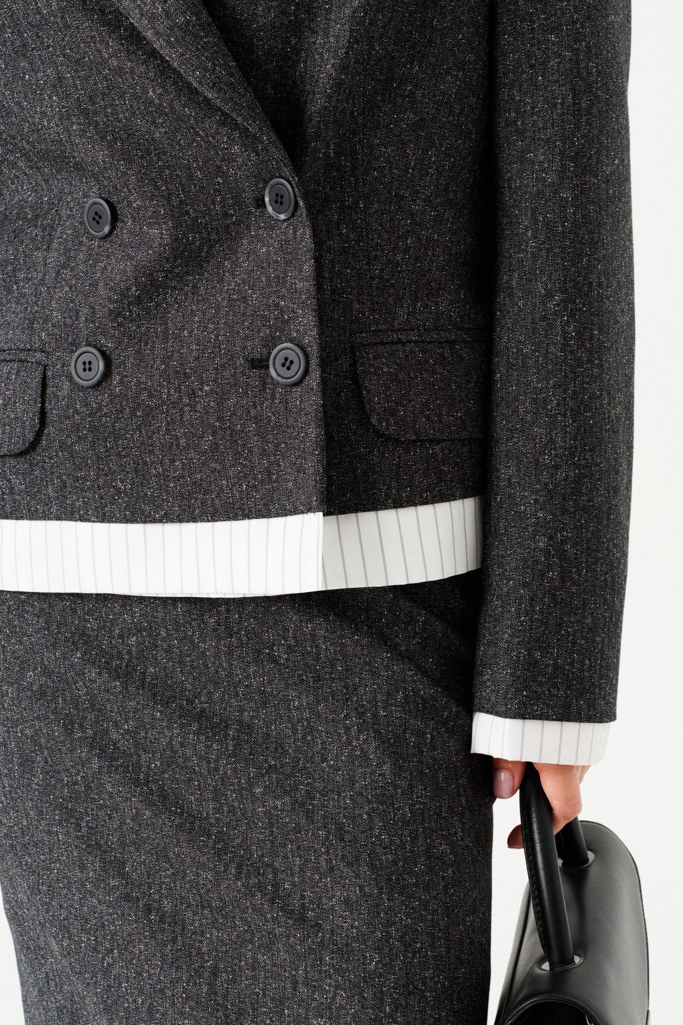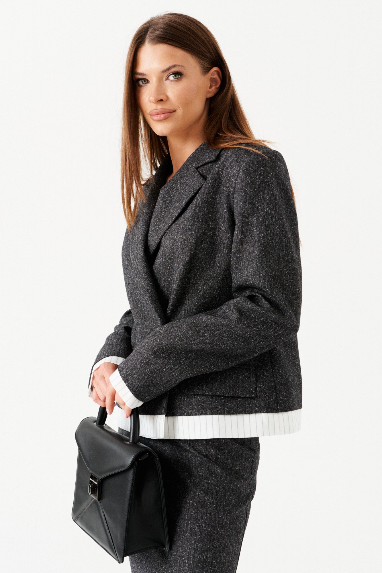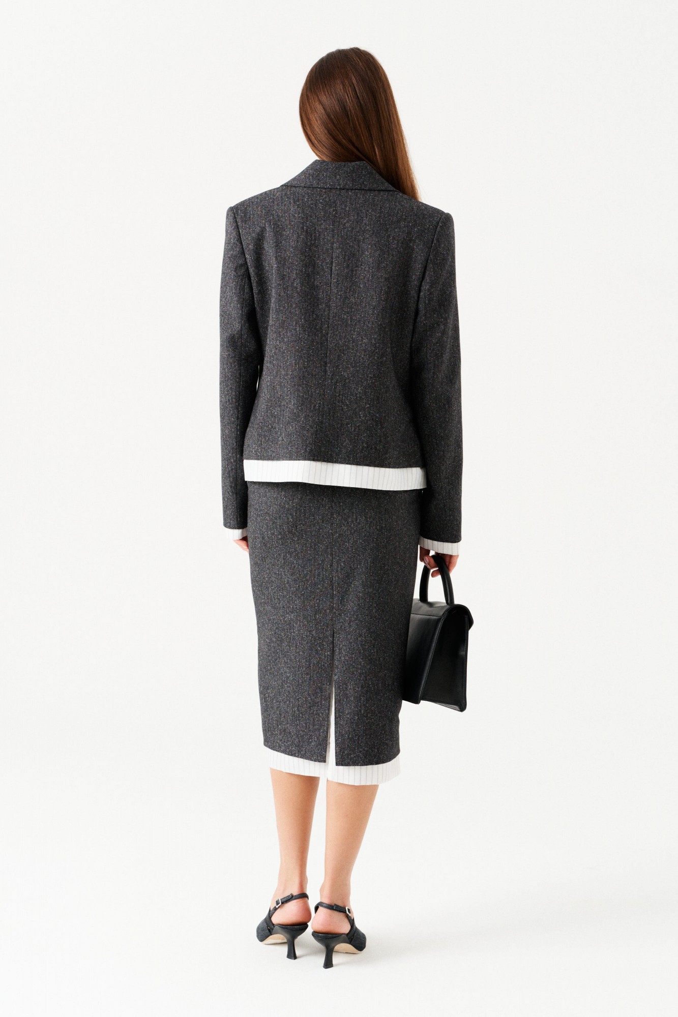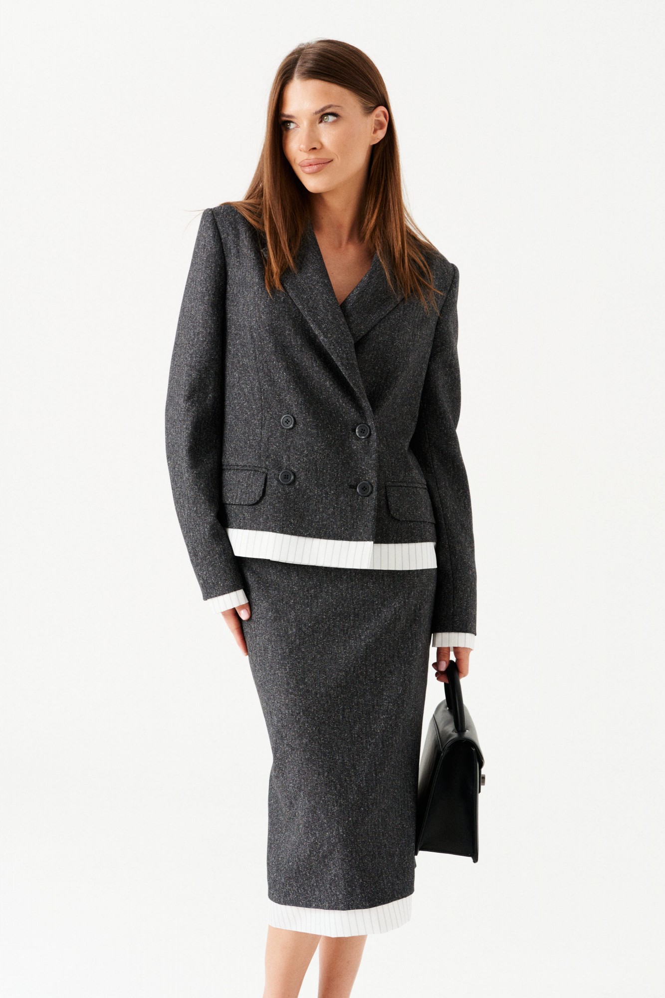 Комплект женский 2-х предметный из костюмной ткани, состоящий из жакета и юбки. Укороченный жакет прямого кроя, с центральной двухбортной застежкой на петли и пуговицы, отложным воротником и лацканами пиджачного типа, на подкладке. По переду накладные карманы с клапаном и таллиевые вытачки. Спинка со средним швом. Рукав втачной, длинный. По низу изделия и рукавов планка из ткани в полоску. Юбка прямого силуэта, с видимой частью подкладки в полоску по низу. Перед цельный. Заднее полотнище с таллиевыми вытачками и средним швом (в шве разрез и застежка на потайную молнию). Пояс притачной, застегивается на 1 пуговицу.