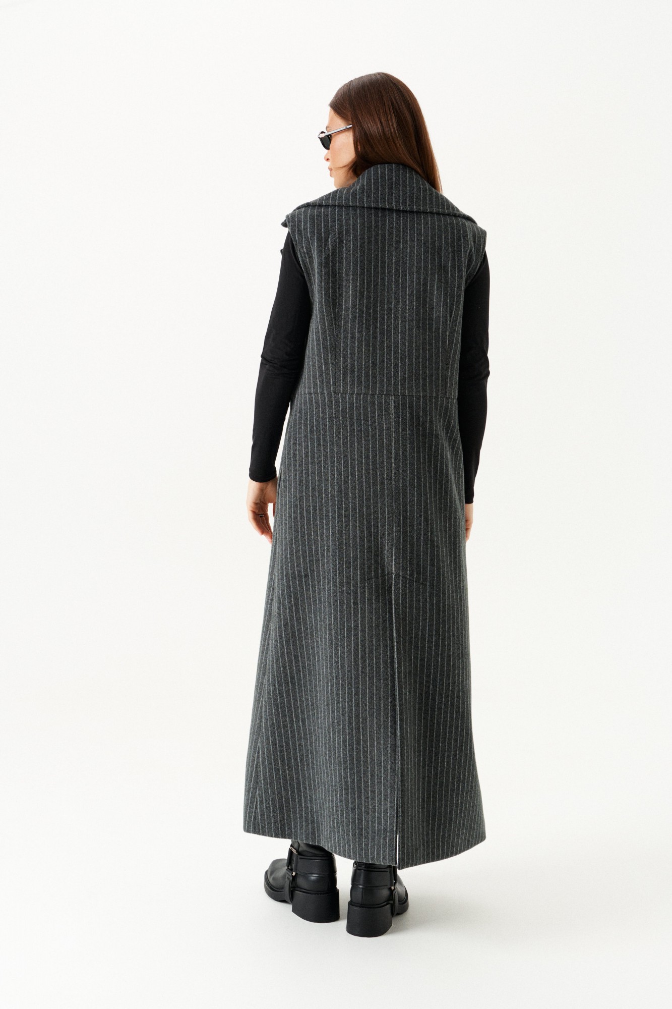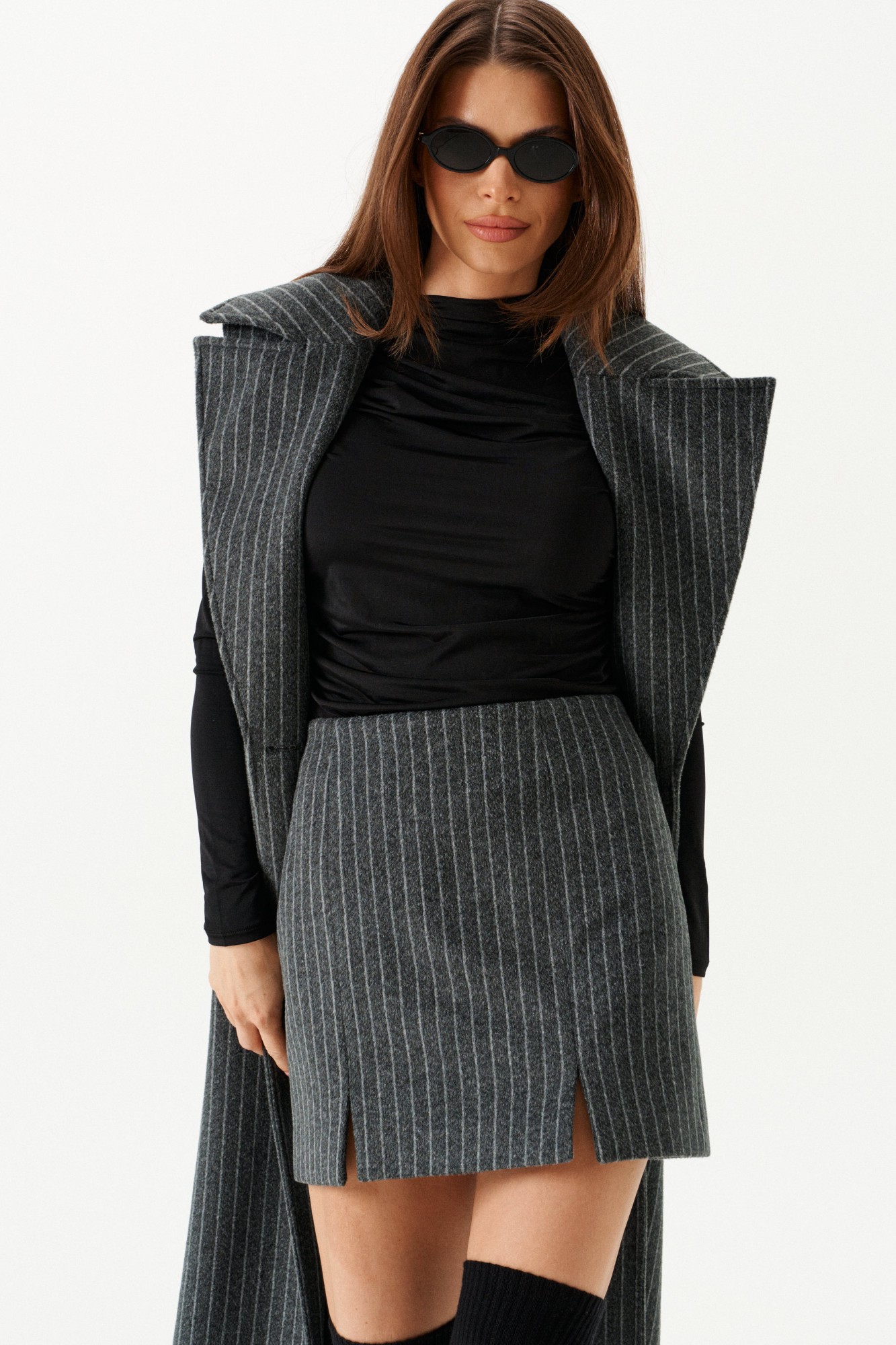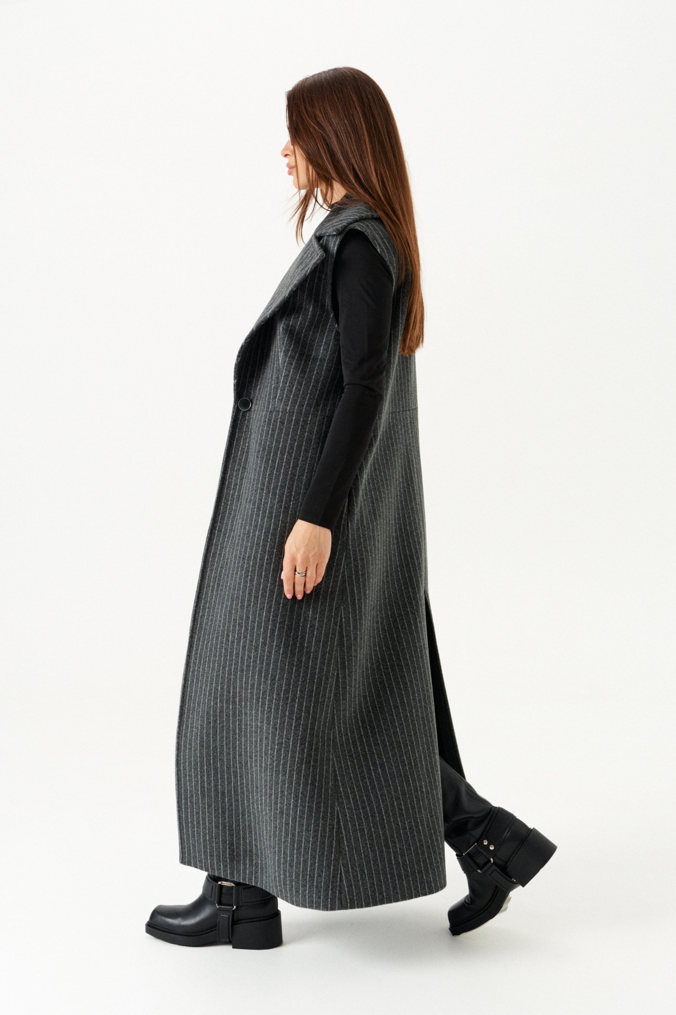 Комплект женский 2-х предметный из трикотажного полотна, состоящий из жилета и юбки. Жилет полуприлегающего силуэта на подкладке, с центральной застежкой на 1 петлю и 1 пуговицу, отрезной на уровне линии талии, отложным воротником и лацканами. Полочки с таллиевыми вытачками. Нижняя часть спинки со средним швом и шпицей. Длина изделия до щиколотки. Юбка прямого силуэта, на подкладке, с застежкой на потайную молнию в среднем шве заднего полотнища. Переднее полотнище с вертикальными рельефами и разрезами. Юбка без пояса, на цельнокроеной обтачке. На заднем полотнище две таллиевые вытачки. Ремень на фото не входит в комплект.