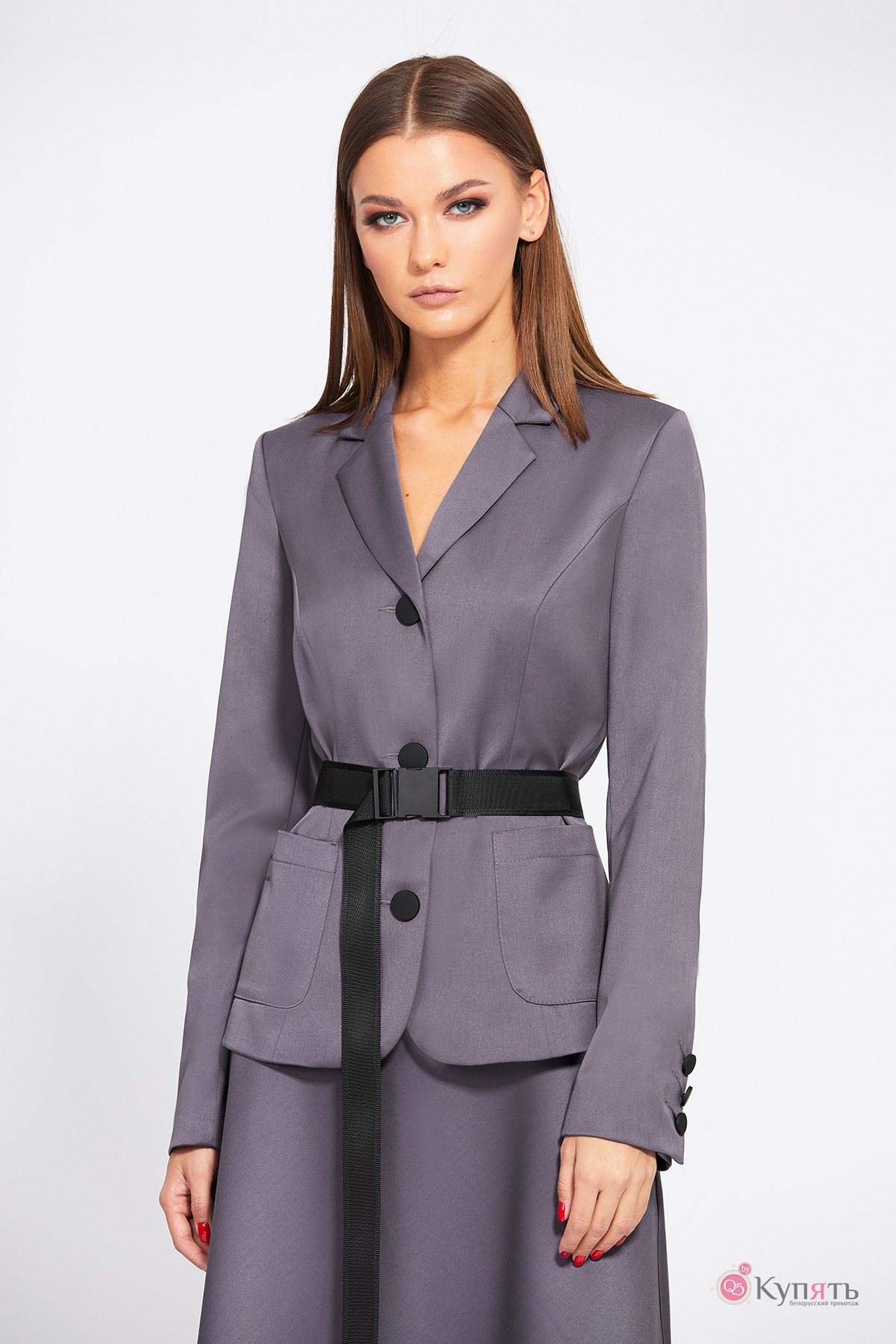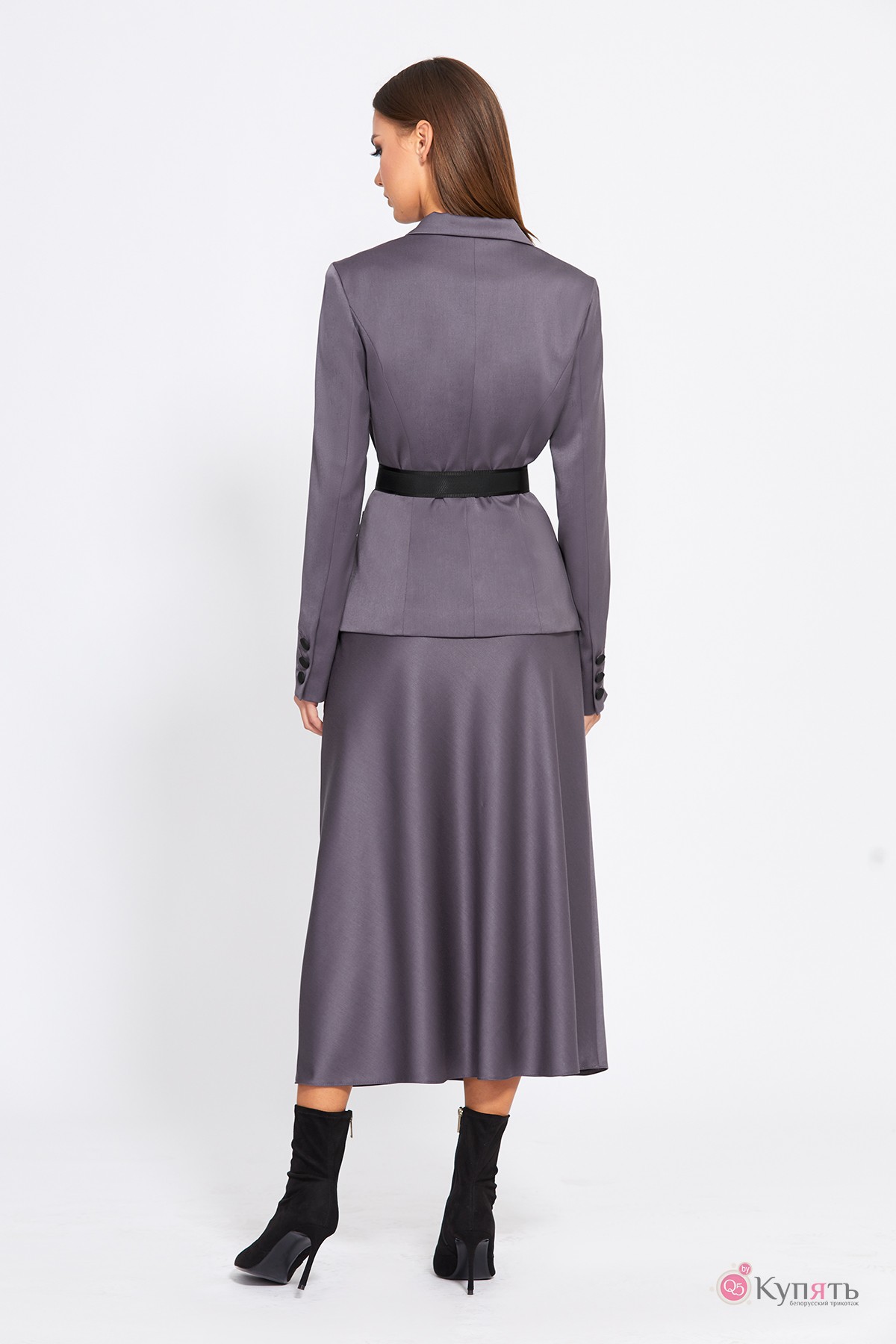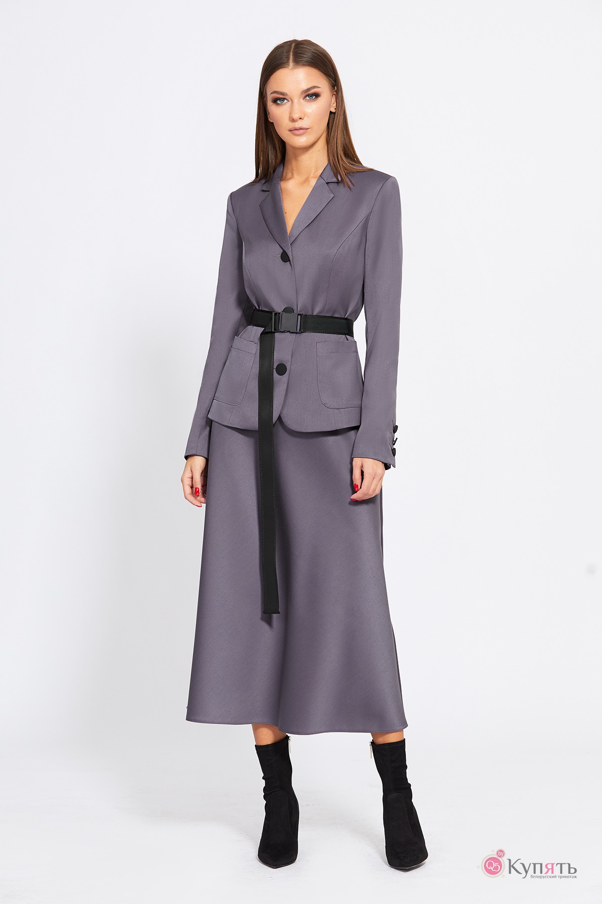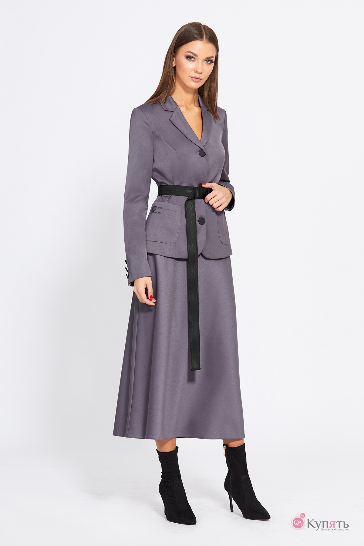 Комплект: жакет + юбки. Комплект выполнен из костюмно-плательной ткани. Жакет полуприлегающего силуэта, длиной выше линии бедер. Жакет с застёжкой на петли и пуговицы. Спереди накладные карманы. Жакет декорирован термоаппликацией по правому карману. Спинка со средним швом и рельефами. Воротник пиджачного типа с лацканами. Рукав втачной, двухшовный, со шлицей в локтевом шве, застегивающейся на три пуговицы. Жакет на подкладке. Юбка А-образного силуэта, длиной миди, на притачном поясе, застегивающимся сбоку на потайную молнию и пуговицу. Переднее и заднее полотнища юбки цельные. Юбка без подкладки. Съемный ремень с пряжкой "карабин" входит в комплект.