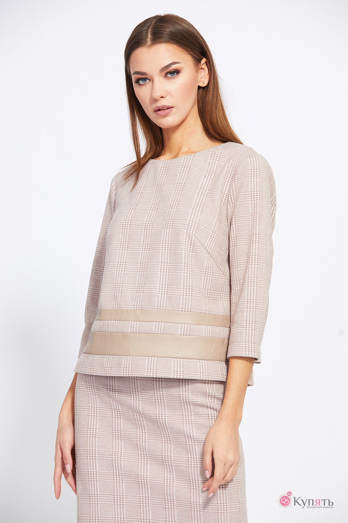 Комплект: блузка+юбка. Комплект выполнен из трикотажного полотна с рисунком "клетка". Блузка прямого силуэта, длиной выше линии бедер. Перед цельный, с двумя горизонтальными вставками из экокожи. Застежка в среднем шве спинки на металлическую молнию. Горловина округлой формы. Рукав втачной, одношовный, длиной 3/4, с локтевой вытачкой. Юбка зауженная к низу, на притачном поясе, длиной ниже линии колена. Застежка сзади в среднем шве на потайную молнию и пуговицу. Сзади в среднем шве обработана шлица.