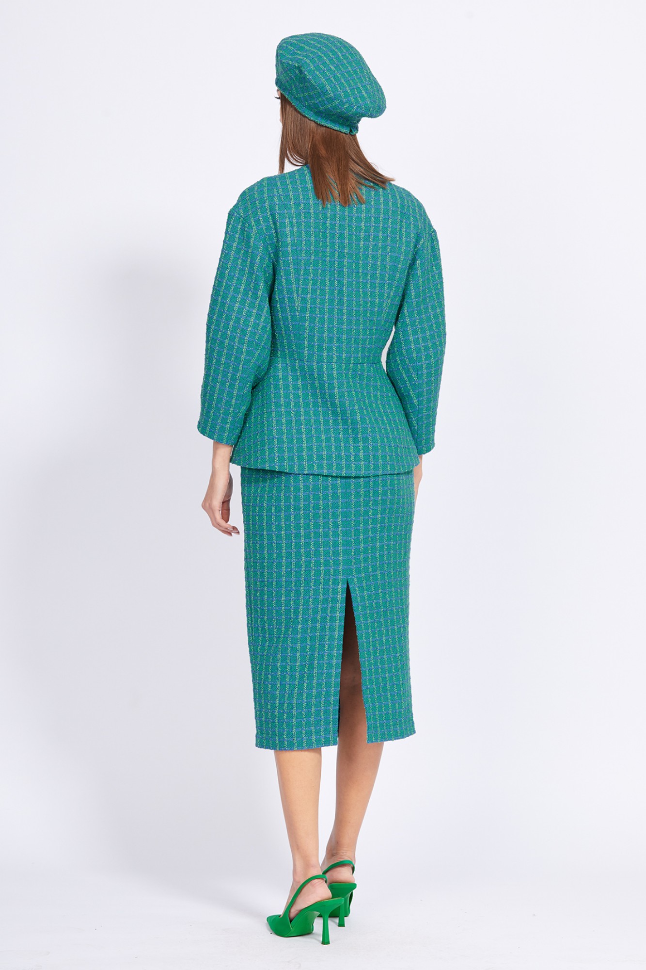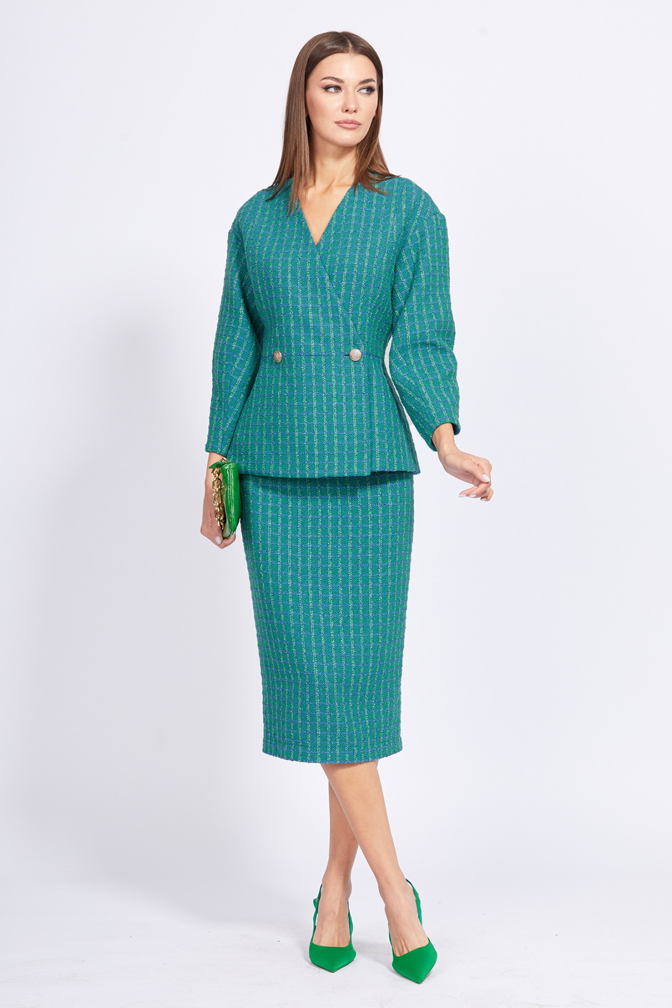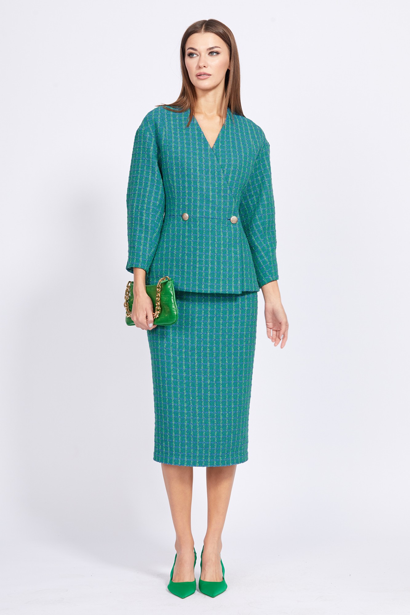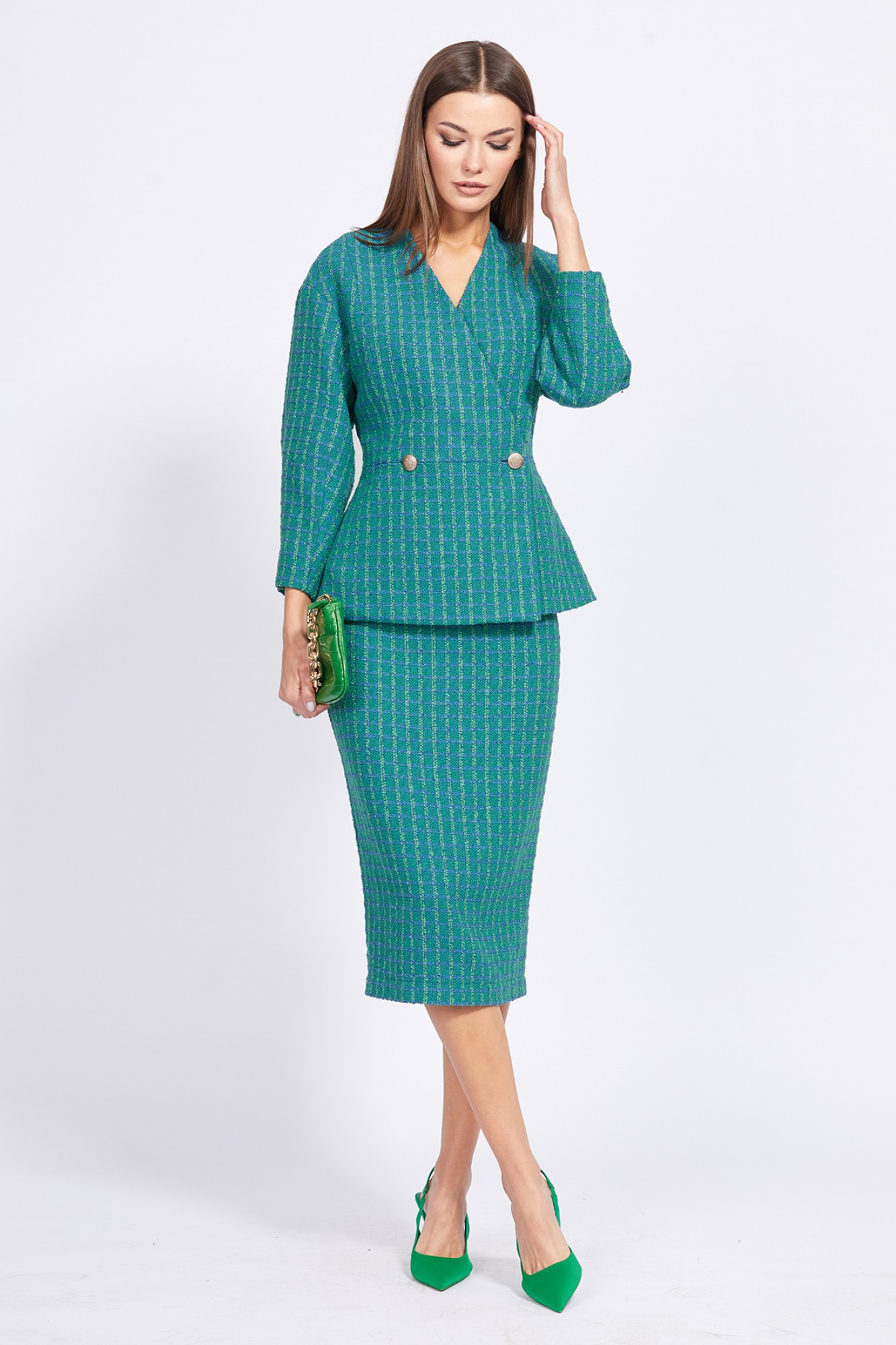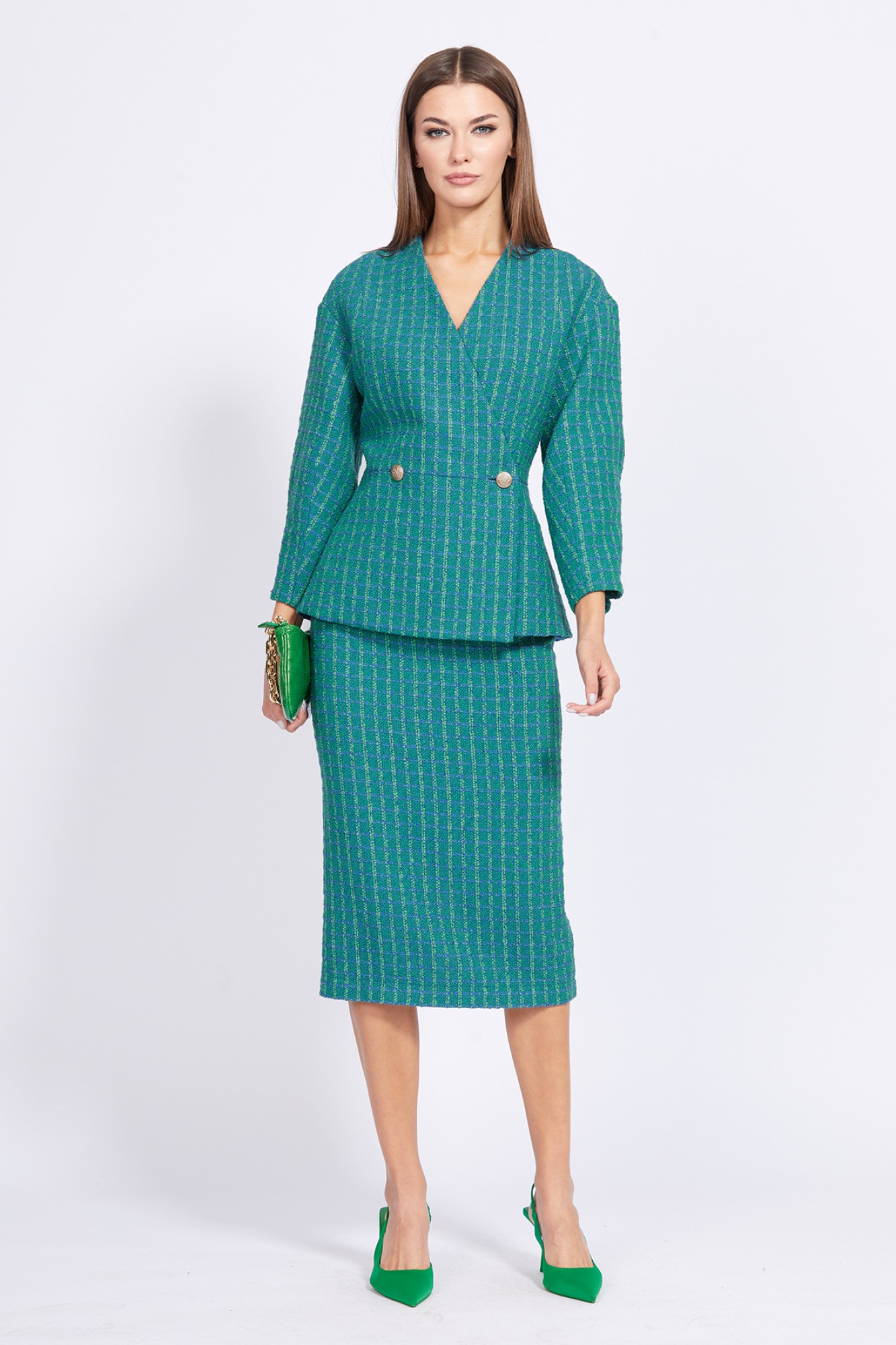 Комплект: жакет + юбка. Комплект выполнен из твида. Жакет полуприлегающего силуэта, отрезной по линии талии, длиной чуть выше линии бедер. Застежка центральная двубортная на две пришивные пуговицы. Горловина переда - V-образной формы. Рукав рубашечного покроя, одношовный, длиной 4/5. Низ рукава заужен. Низ жакета оформлен баской. Жакет на притачной по низу подкладке. Юбка длиной ниже линии колена, на притачном поясе, заужена к низу. Перед цельный. Сзади в среднем шве разрез. Застежка сзади на потайную молнию.