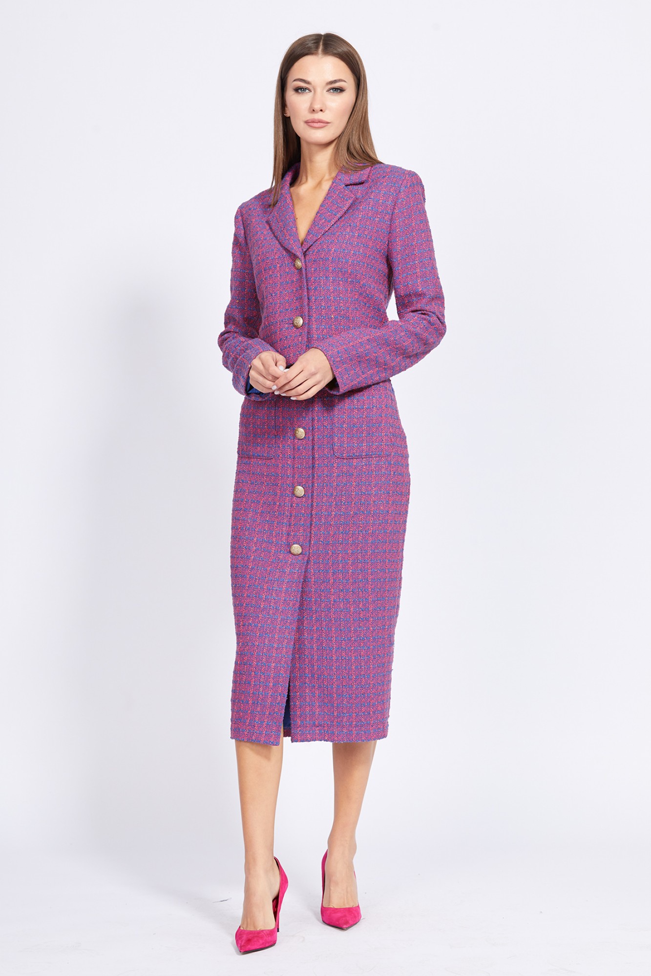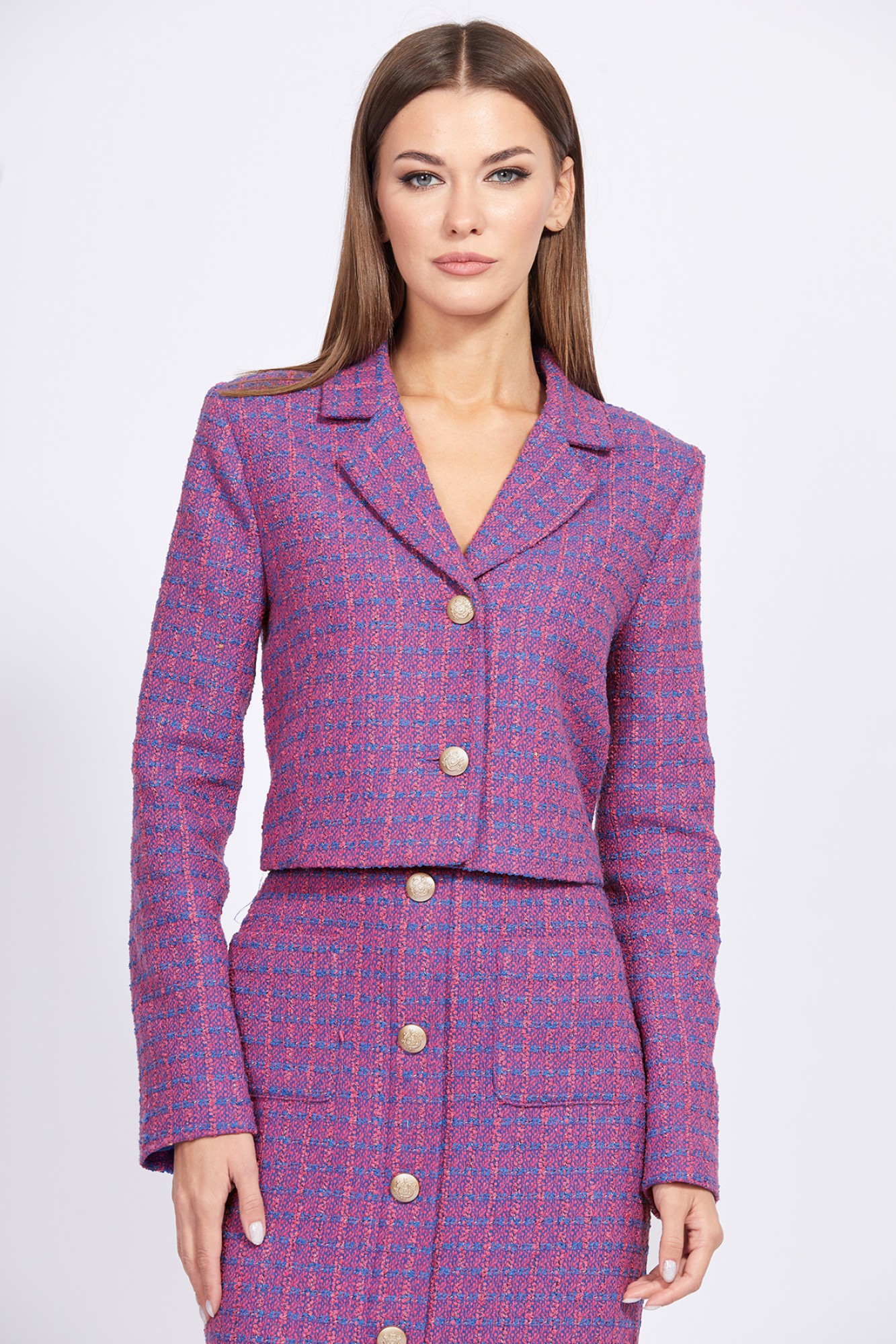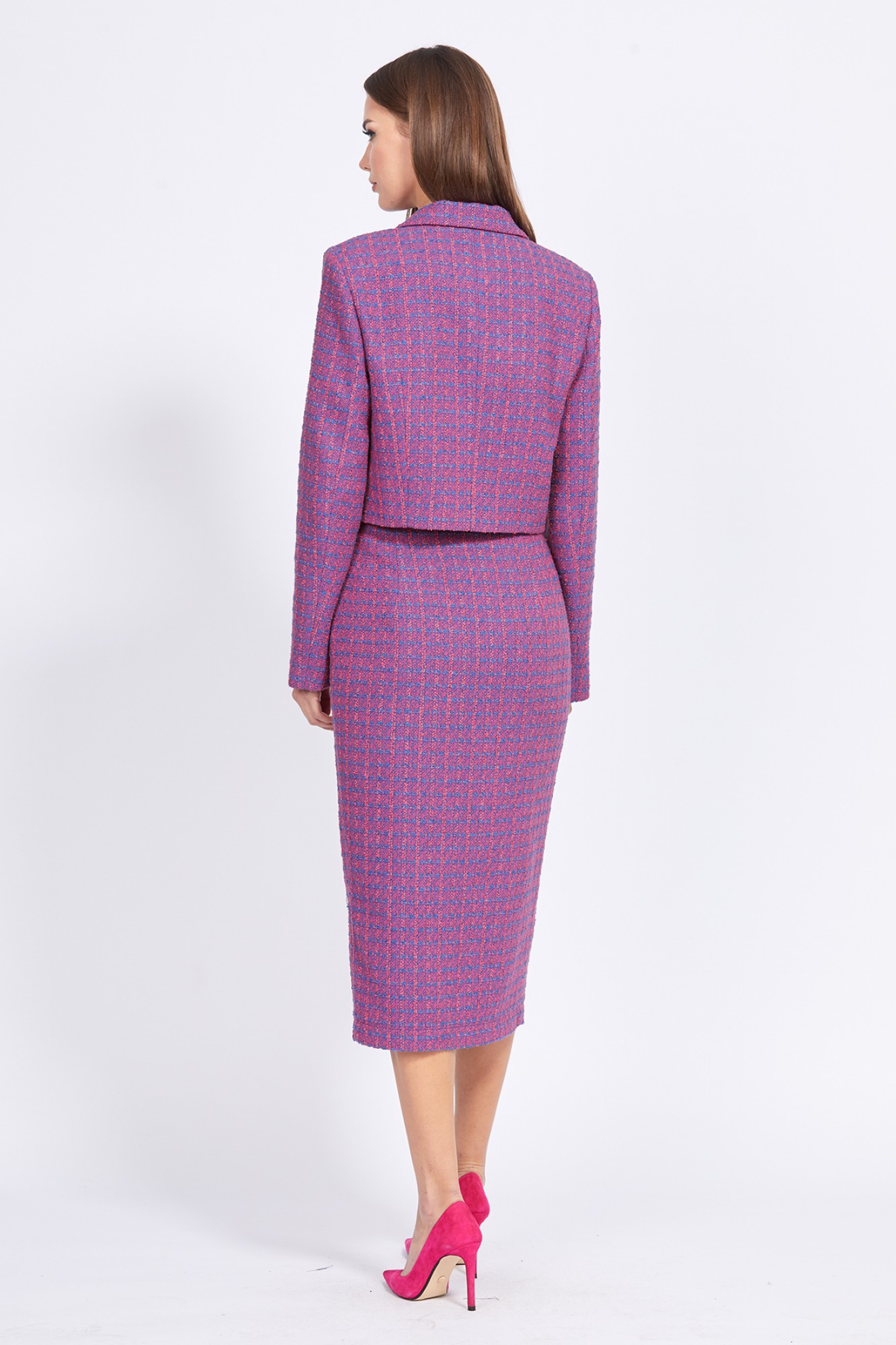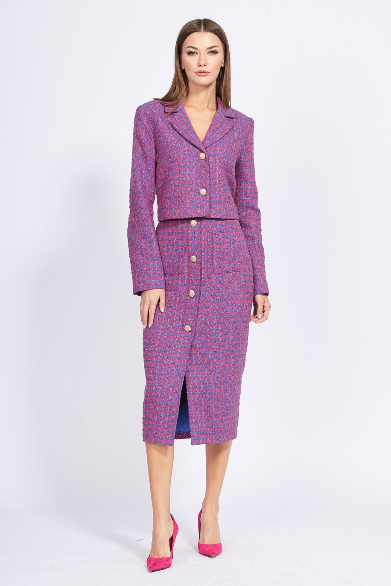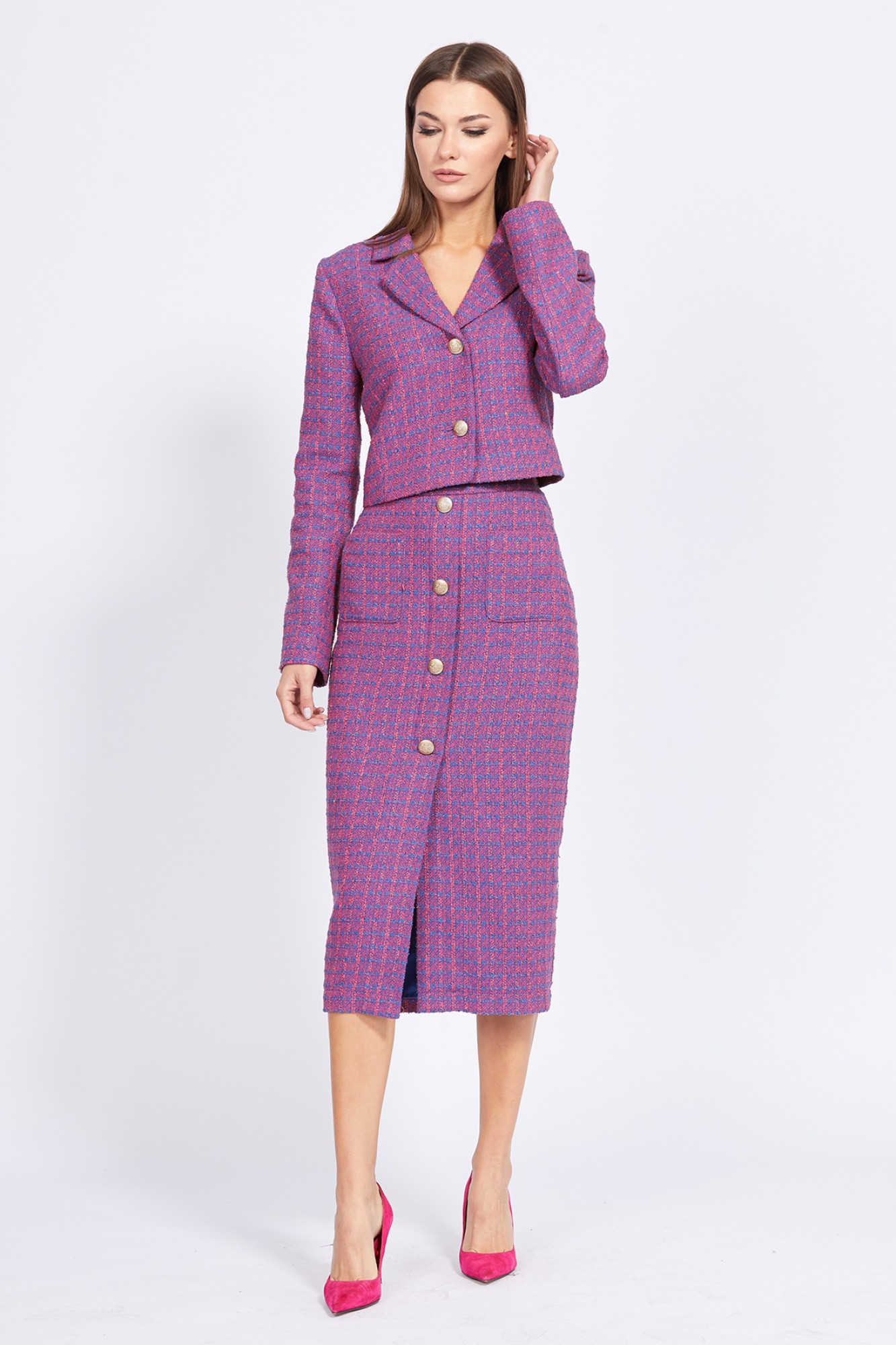 Комплект: жакет + юбка. Комплект выполнен из твида. Жакет полуприлегающего силуэта, длиной чуть ниже линии талии. Спереди лацканы и застежка центральная на две пуговицы. Спинка со средним швом. Воротник пиджачного типа. Рукав втачной, двухшовный. Низ рукава заужен. Жакет на притачной по низу подкладке. Юбка на притачном поясе, заужена к низу, длиной миди. Спереди накладные карманы и имитация бортовой застежки на 5 пуговиц. Сзади юбка цельная. Застежка в левом боковом шве на потайную молнию и пуговицу.