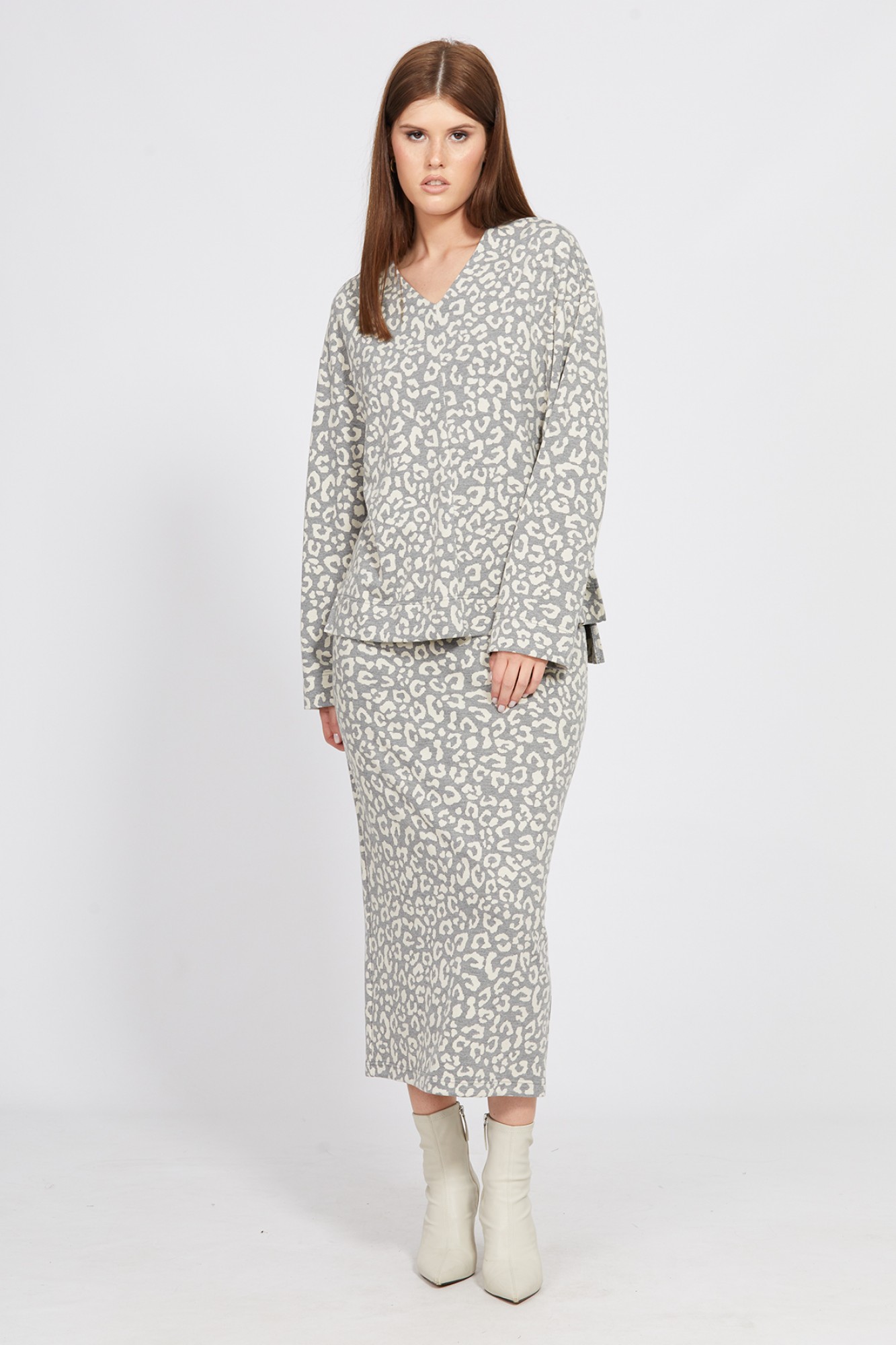Комплект: джемпер + юбка. Комплект выполнен из трикотажного полотна с анималистичным принтом. Джемпер прямого силуэта, длиной до линии бедра. Перед со средним швом. Спинка цельная. Горловина V-образной формы. Плечевой шов спущен. Рукав рубашечного покроя, одношовный. В боковых швах разрезы. Спинка длиннее переда. Юбка слегка заужена к низу, на цельнокроенном поясе с эластичной тесьмой, длиной миди. Сзади шлица в среднем шве.