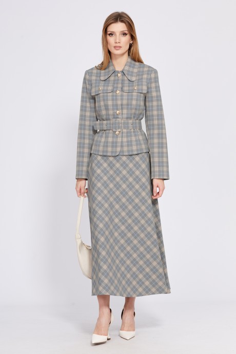 Комплект: жакет + юбка. Комплект выполнен из костюмной ткани в клетку. Жакет полуприлегающего силуэта, длиной выше линии бедер. Застежка спереди центральная бортовая на пуговицы. Рукав втачной, двухшовный. Жакет на притачной по низу подкладке. Юбка расширенная к низу, на притачном поясе, длиной миди. Переднее и заднее полотнища цельные и выкроены по косой. Застежка в левом боковом шве на потайную молнию и пуговицу. Юбка без подкладки. В комплект входит ремень из основной ткани с обтяжной пряжкой. Длина жакета: р.44-48 -56 см, р.50-54 - 57 см. Длина рукава: р 44-54 -63 см. Длина юбки с поясом: р. 44-54 - 91 см.