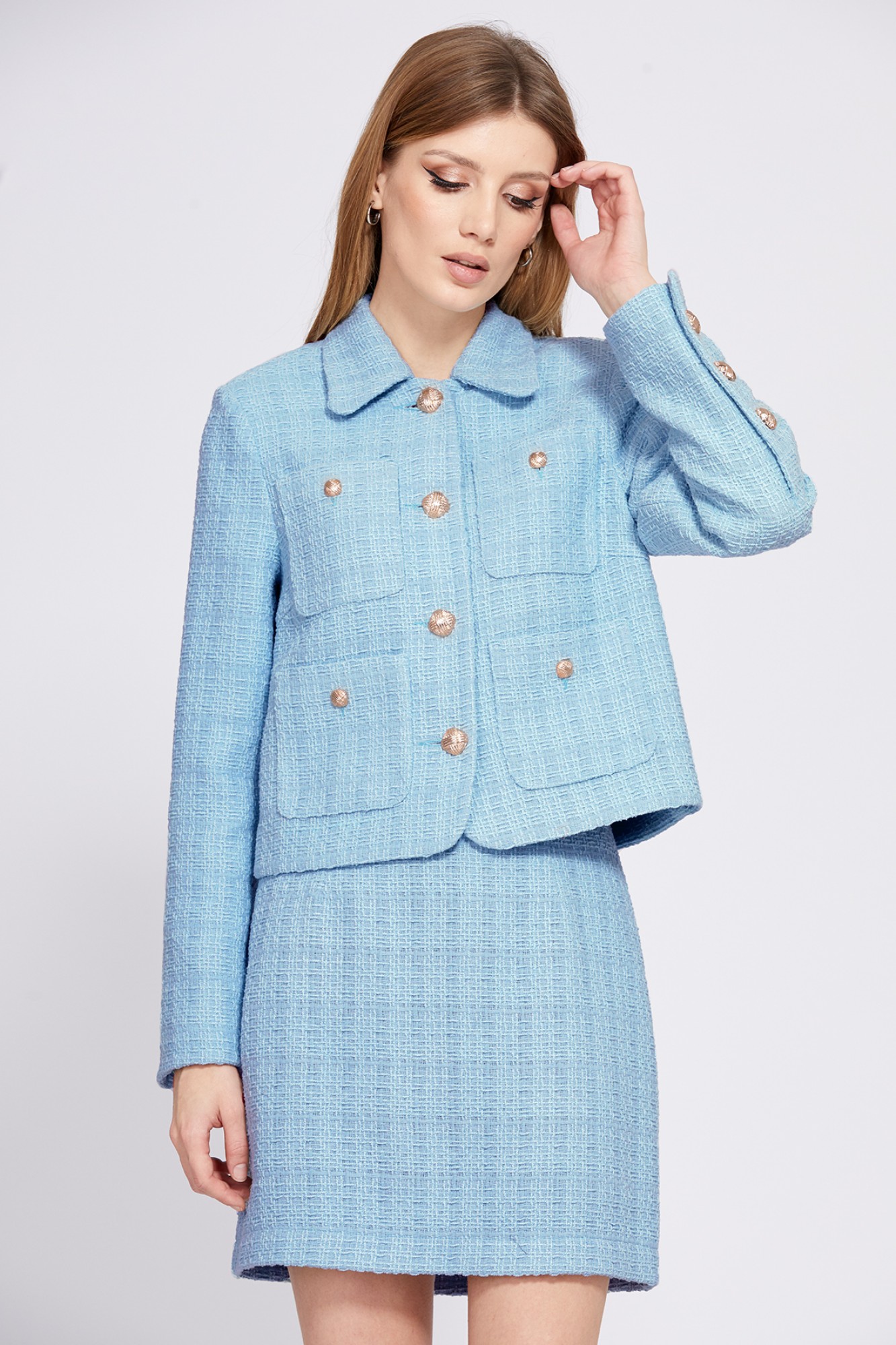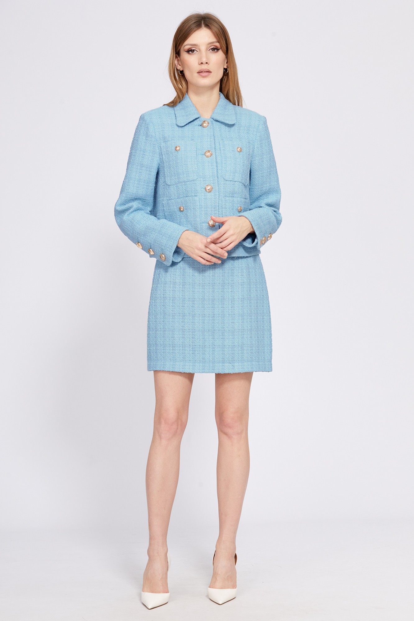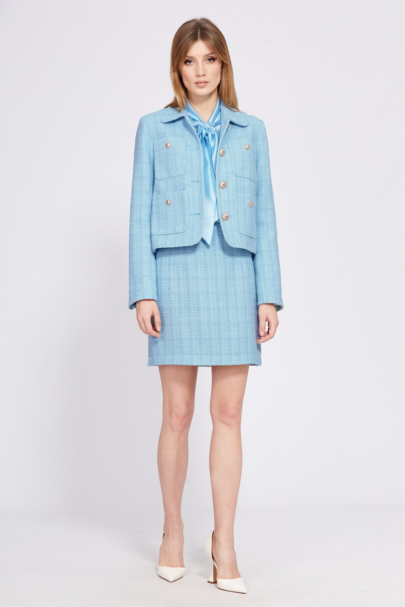 Комплект: жакет + юбка. Комплект выполнен из твида. Жакет прямого силуэта длиной выше линии бедер. Спереди две пары накладных карманов декорированых пуговицами. Застежка спереди центральная бортовая на пуговицы. Рукав втачной, двухшовный. По низу рукава шлица застегивающаяся на пуговицы. Жакет на притачной по низу подкладке.