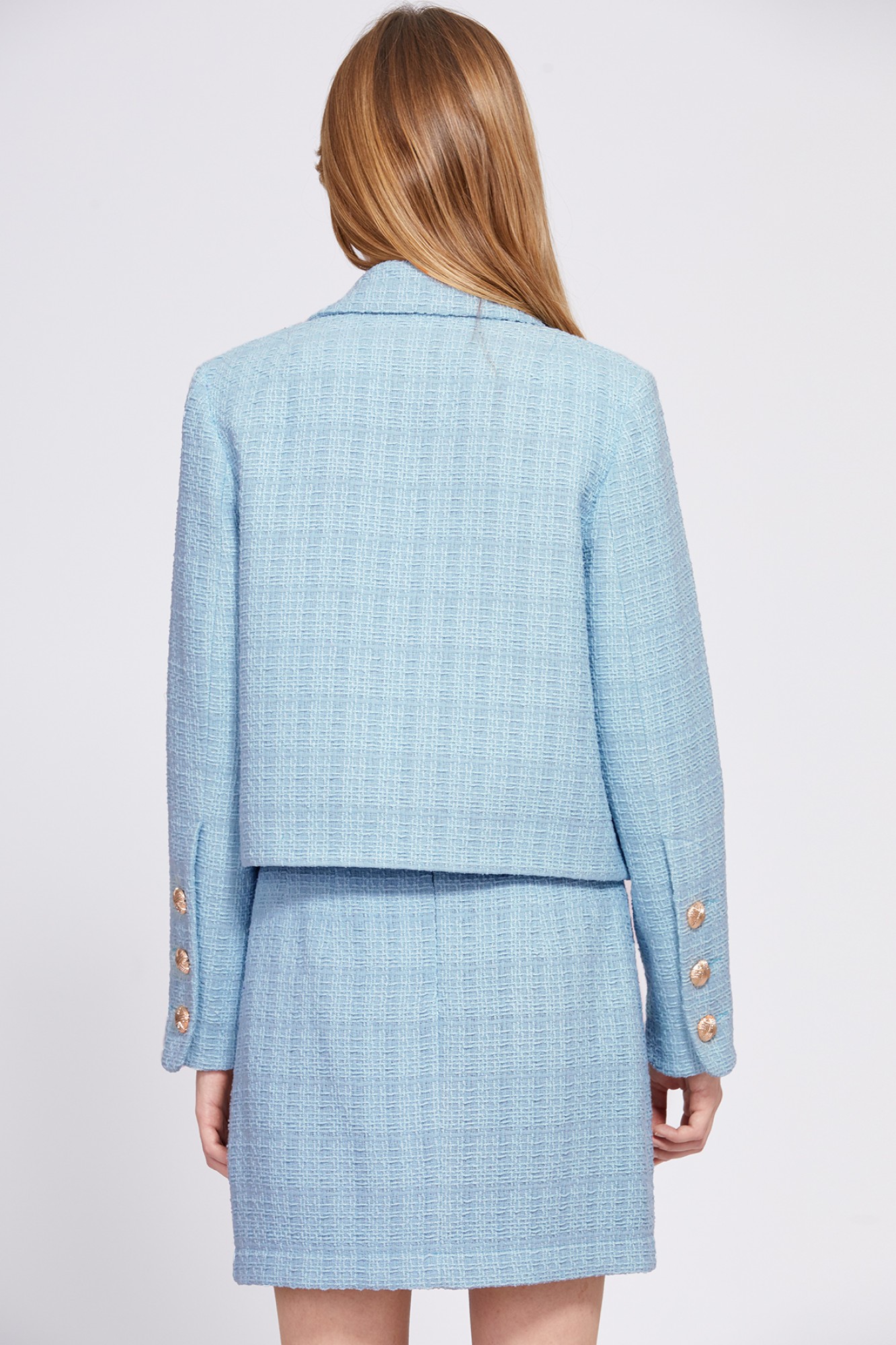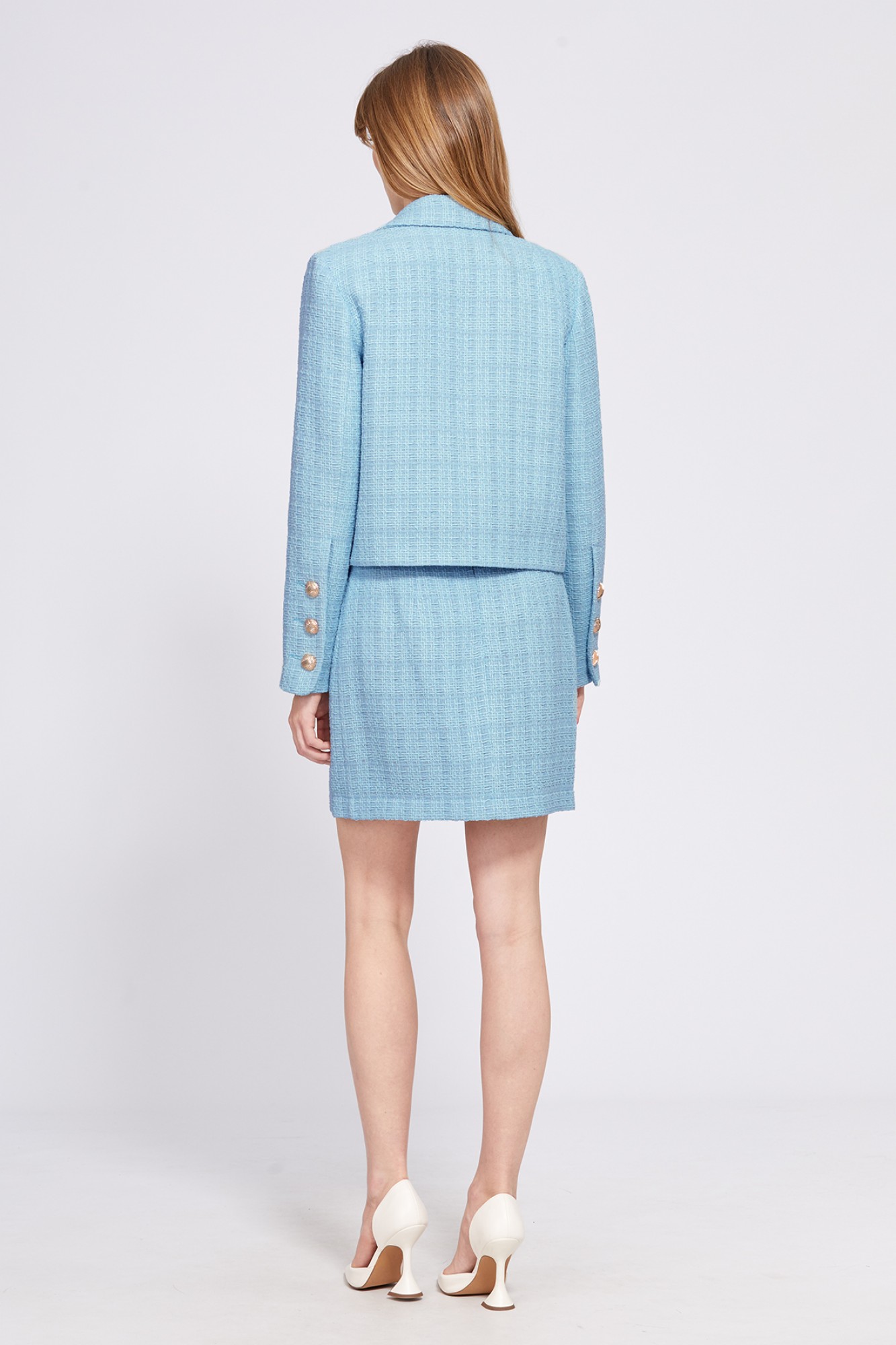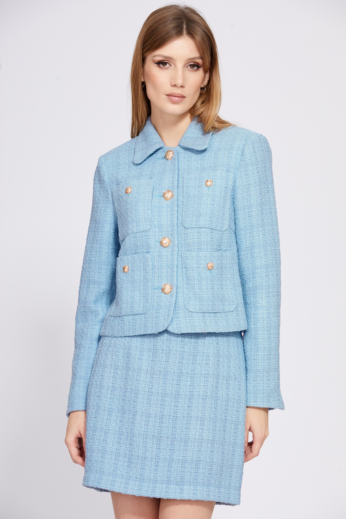 Комплект: жакет + юбка. Комплект выполнен из твида. Жакет прямого силуэта длиной выше линии бедер. Спереди две пары накладных карманов декорированых пуговицами. Застежка спереди центральная бортовая на пуговицы. Рукав втачной, двухшовный. По низу рукава шлица застегивающаяся на пуговицы. Жакет на притачной по низу подкладке.