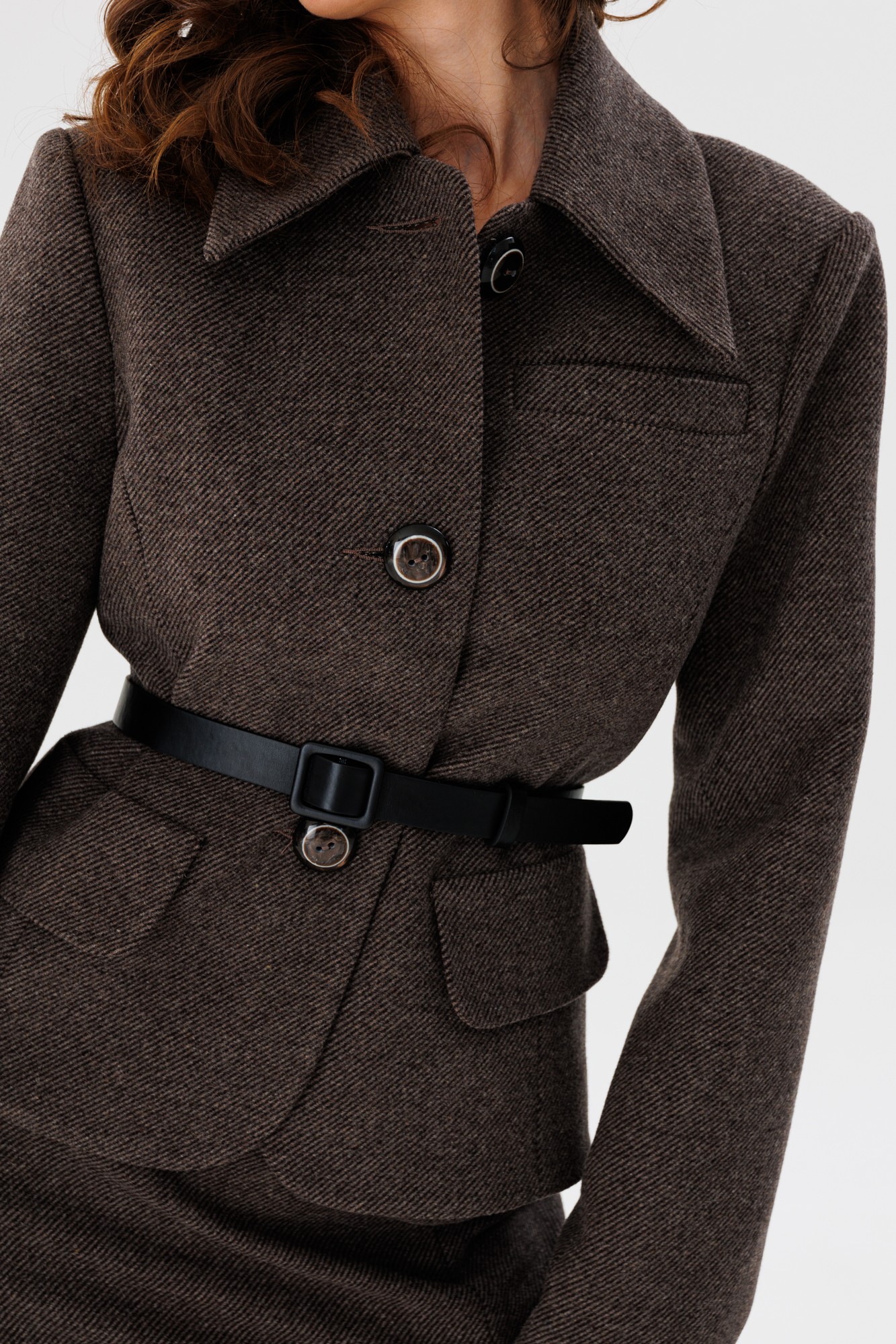 Комплект: жакет + юбка. Комплект выполнен из костюмной ткани в диагональный рубчик. Жакет полуприлегающего силуэта длиной выше линии бедер. Спереди центральная застежка на пуговицы и декоративные клапаны. Воротник стояче-отложной. Спинка со средним швом. Рукав втачного покроя двухшовный. Жакет на притачной по низу подкладке. Юбка на притачном поясе, длиной выше линии щиколотки, зауженная к низу. Застежка сбоку на потайную молнию. Спереди слева разрез. Юбка на отлетной по низу подкладке. Ремень в комплект НЕ ВХОДИТ!