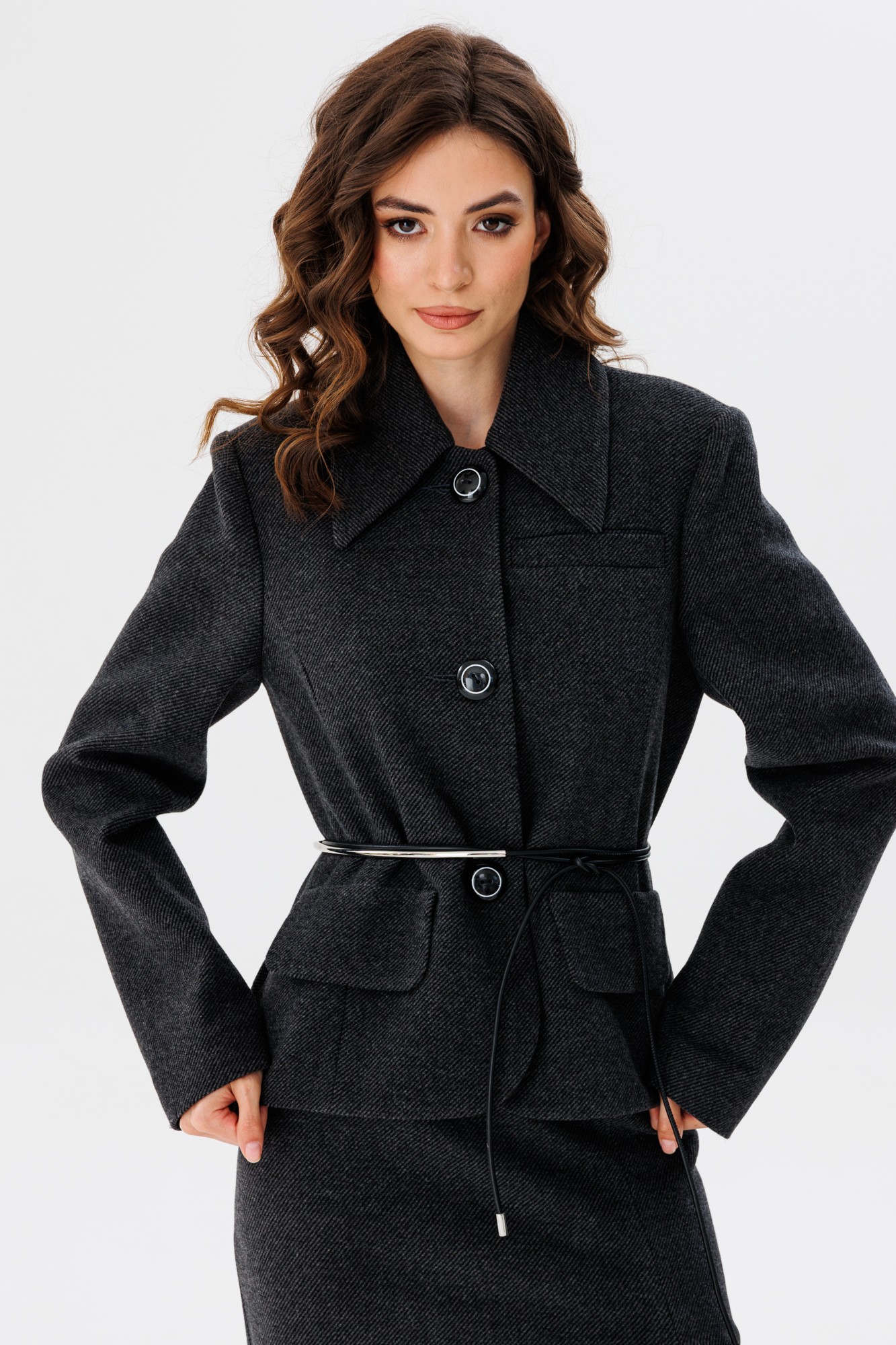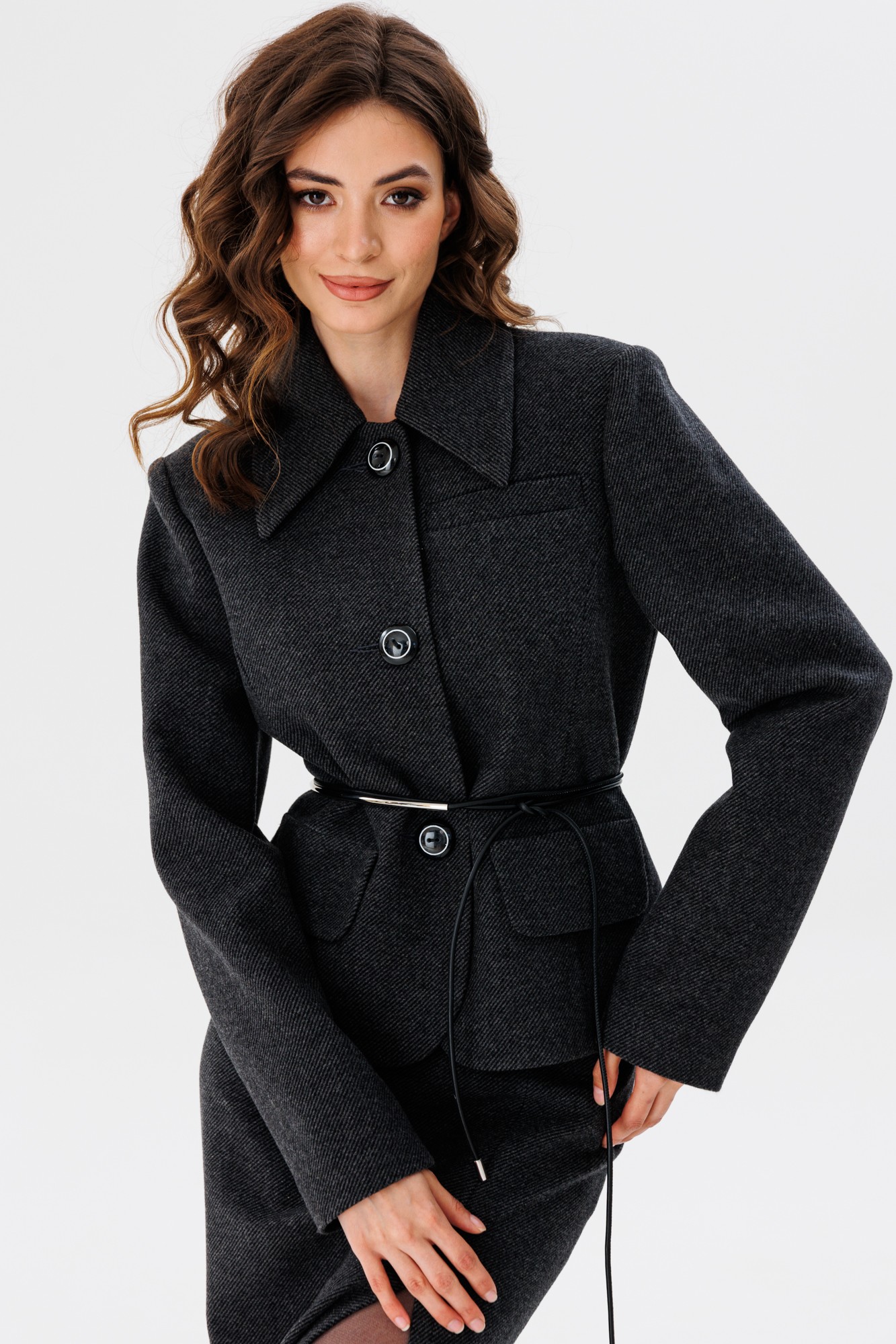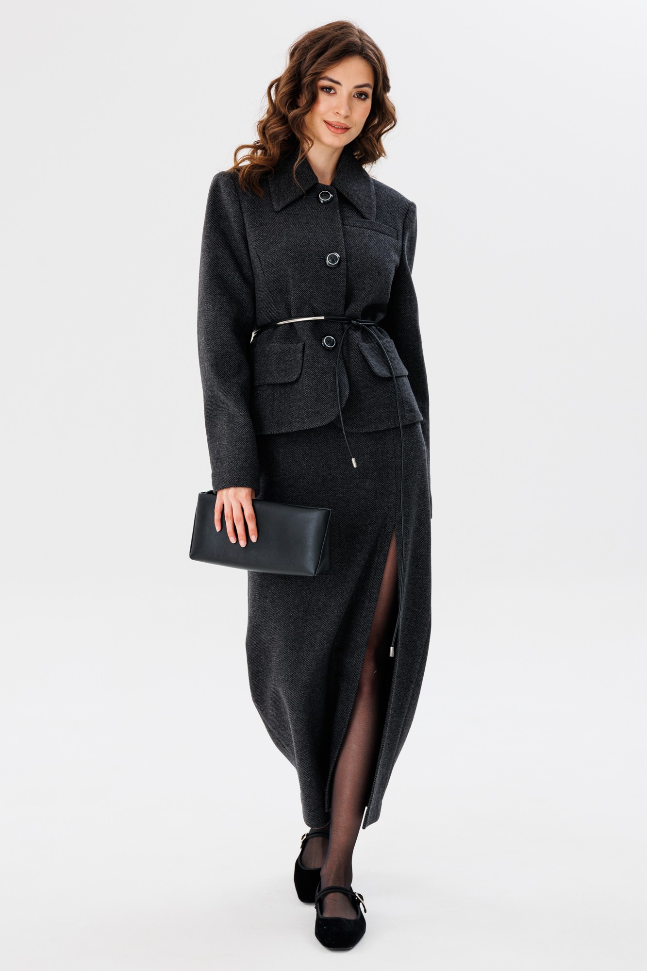Комплект: жакет + юбка. Комплект выполнен из костюмной ткани в диагональный рубчик. Жакет полуприлегающего силуэта длиной выше линии бедер. Спереди центральная застежка на пуговицы и декоративные клапаны. Воротник стояче-отложной. Спинка со средним швом. Рукав втачного покроя двухшовный. Жакет на притачной по низу подкладке. Юбка на притачном поясе, длиной выше линии щиколотки, зауженная к низу. Застежка сбоку на потайную молнию. Спереди слева разрез. Юбка на отлетной по низу подкладке. Ремень в комплект НЕ ВХОДИТ!