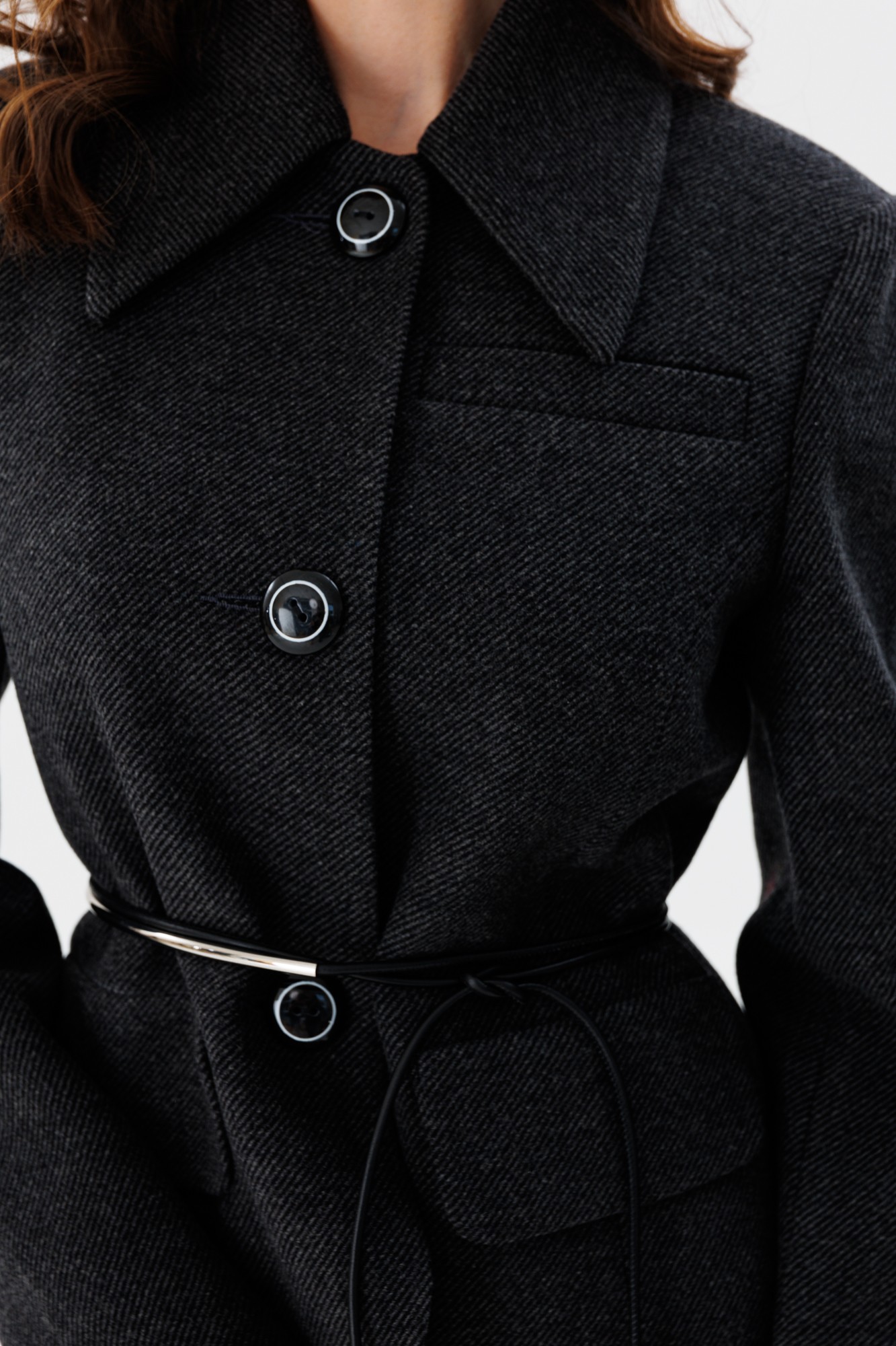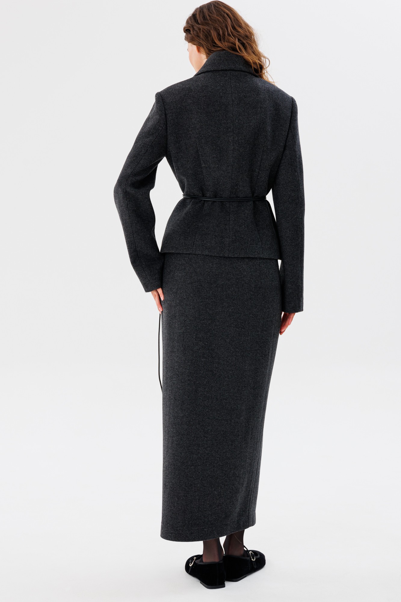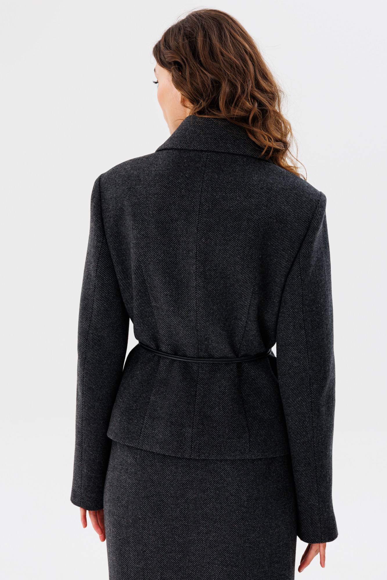 Комплект: жакет + юбка. Комплект выполнен из костюмной ткани в диагональный рубчик. Жакет полуприлегающего силуэта длиной выше линии бедер. Спереди центральная застежка на пуговицы и декоративные клапаны. Воротник стояче-отложной. Спинка со средним швом. Рукав втачного покроя двухшовный. Жакет на притачной по низу подкладке. Юбка на притачном поясе, длиной выше линии щиколотки, зауженная к низу. Застежка сбоку на потайную молнию. Спереди слева разрез. Юбка на отлетной по низу подкладке. Ремень в комплект НЕ ВХОДИТ!