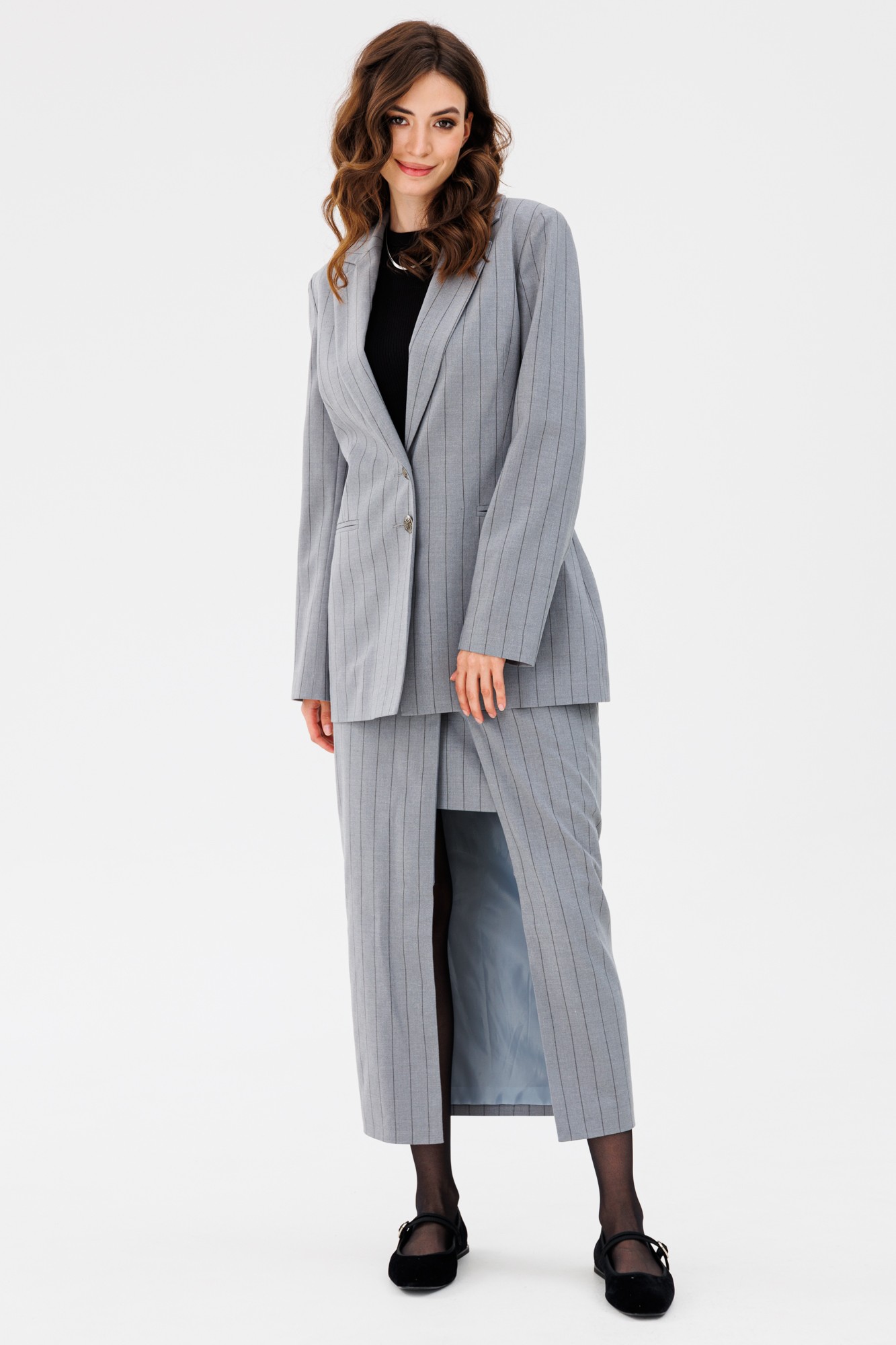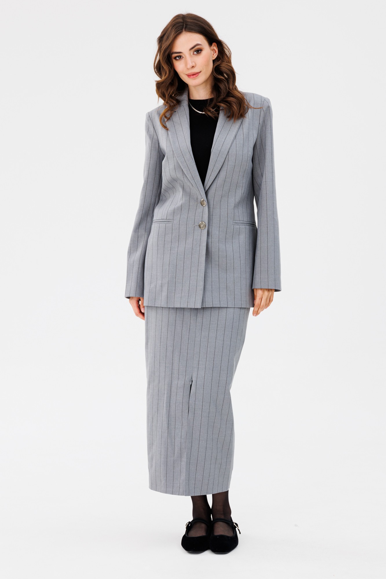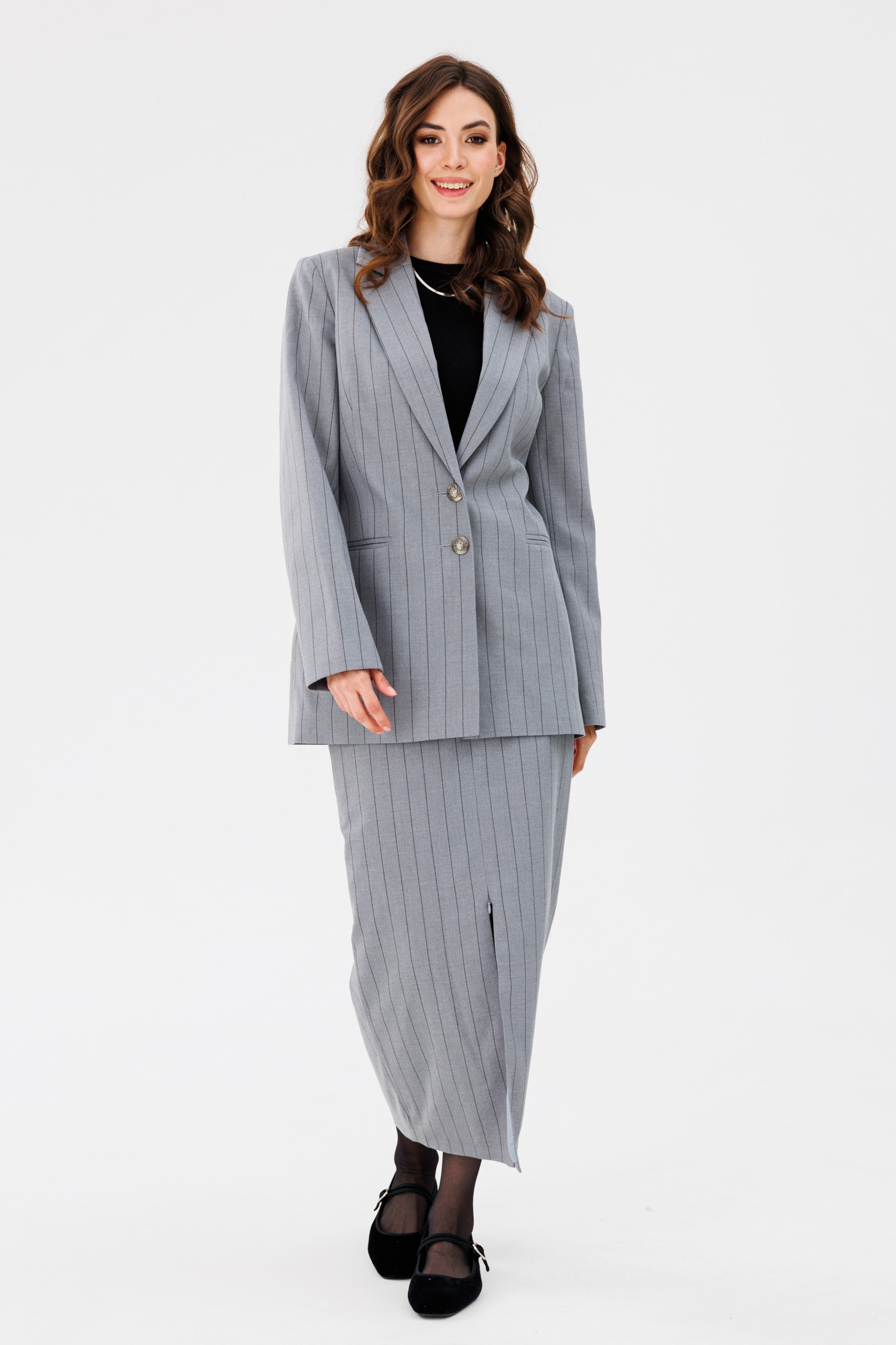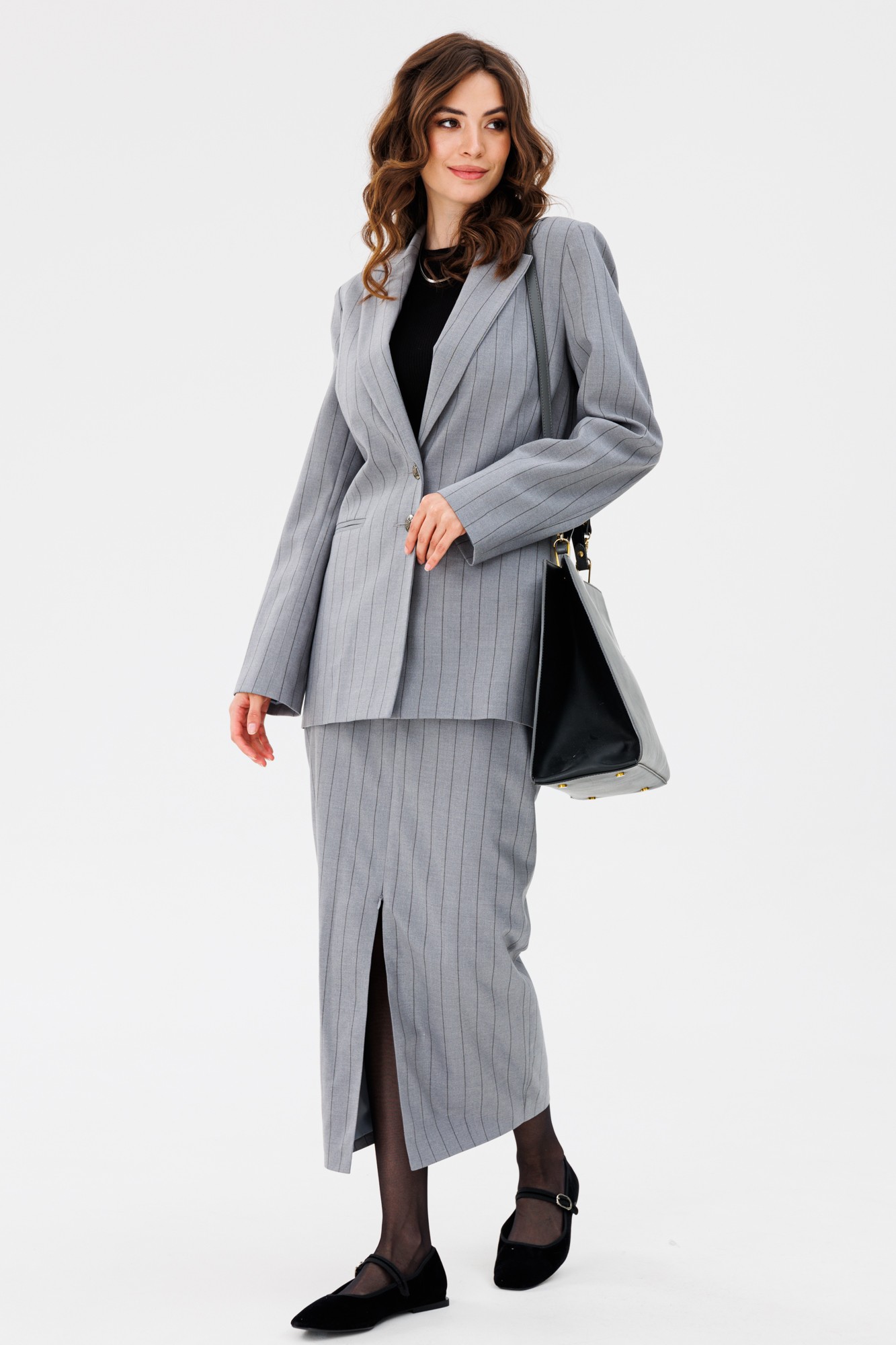 Комплект: жакет + юбка. Комплект выполнен из костюмной ткани в полоску. Жакет полуприлегающего силуэта, длиной до линии бедер. Спереди прорезные карманы. Спереди центральная застежка на пуговицы. На спинке средний шов. Воротник пиджачного типа. Рукав втачной, двухшовный. Жакет на притачной по низу подкладке. Юбка заужена к низу, на притачном поясе, длиной миди. Переднее полотнище состоит из двух частей: верхней и нижней. Нижняя часть выполнена в виде прямой юбки, длиной выше линии колена. На верхней части спереди разрез и декоративная застежка на потайную молнию. Юбка на притачной по низу подкладке.