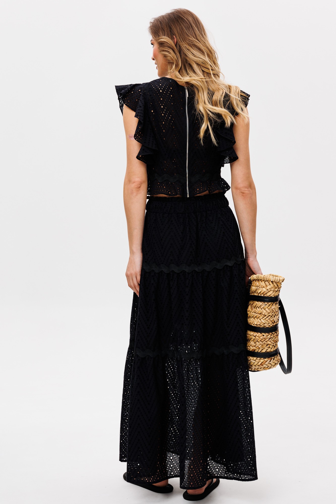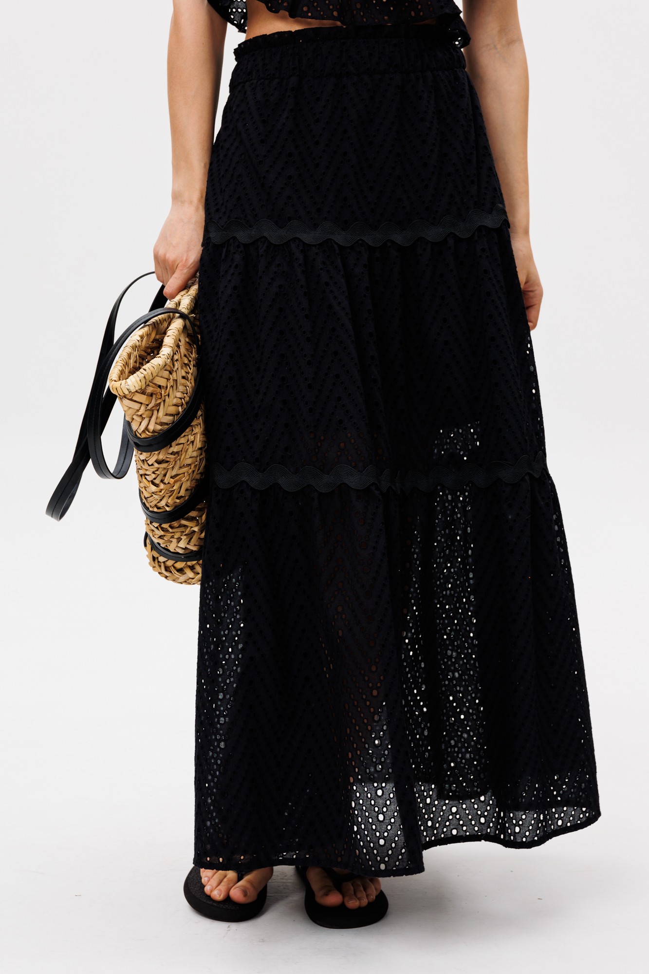 Комплект: блузка + юбка. Комплект выполнен из хлопка с вышивкой. Блузка облегающего силуэта, длиной до линии талии. Застежка на металлическую молнию в среднем шве спинки. Горловина V-образной формы. Плечевой шов заужен. Низ блузки обработан узким воланом. Юбка на притачном поясе, длиной миди, расширена к низу. Переднее и заднее полотнища состоят из трех ярусов, присборенных по линии притачивания друг к другу. Юбка на отлетной по низу подкладке до линии колена. Комплект декорирован отделочной тесьмой.