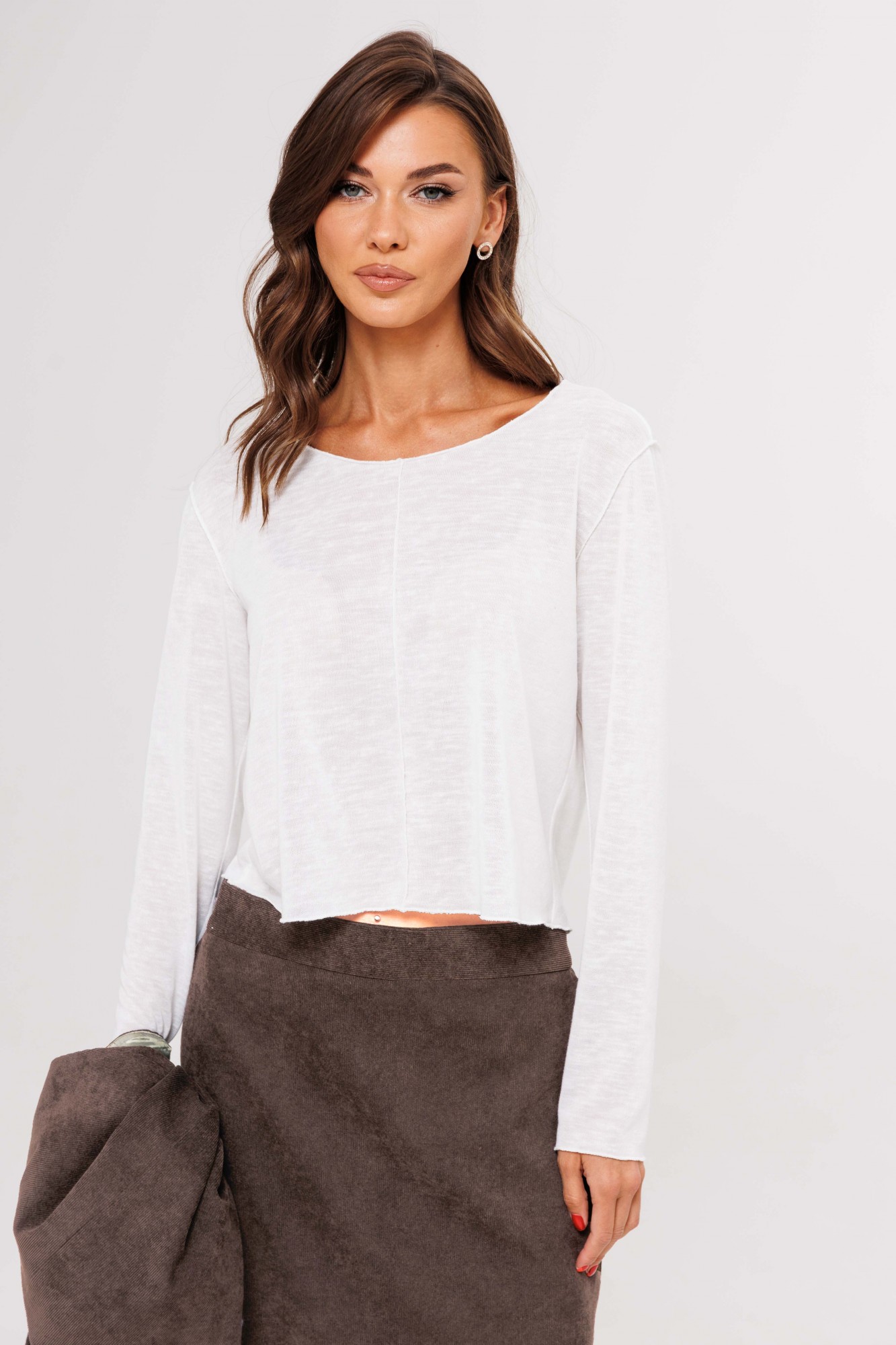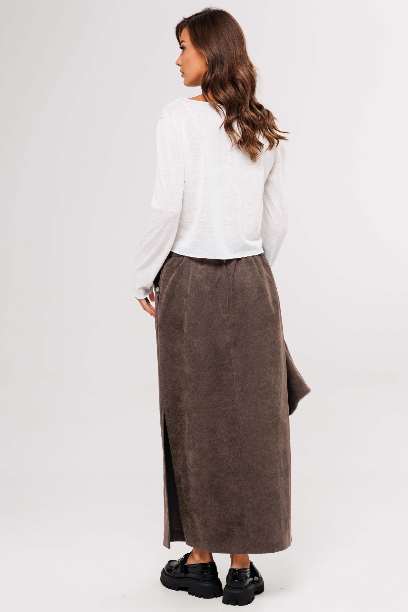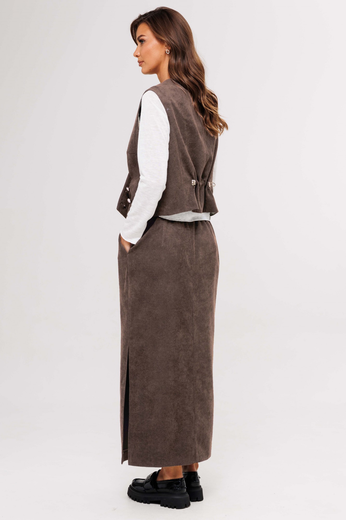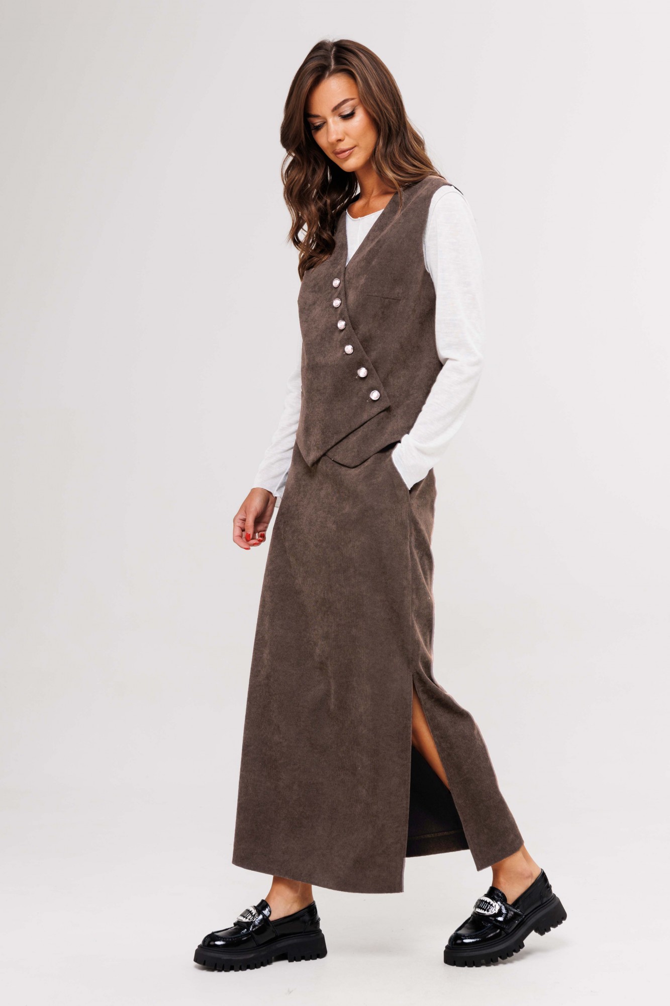Костюм с жилетом - прекрасное решение для смелых экспериментов. Выполненный в ахроматической цветовой гамме, он позволяет дополнять себя различными аксессуарами и создавать каждый раз новые актуальные образы. Жилет полуприлегающего силуэта с асимметричной застёжкой, фигурной линией низа и регулирующийся кулисе по спинке. Полочки с отрезным бочком и нагрудными вытачками, спинки - с центральным швом, отрезным бочком и регулирующийся кулисой с фиксаторами. Юбка прямая с застёжкой и боковыми карманами по переднему полотнищу, и разрезом сбоку, из текстильного трикотажного полотна эффекта ""вельвет"". Пояс эластичный в области спинки. Джемпер трикотажный, с длинным рукавом, полуприлегающего силуэта.