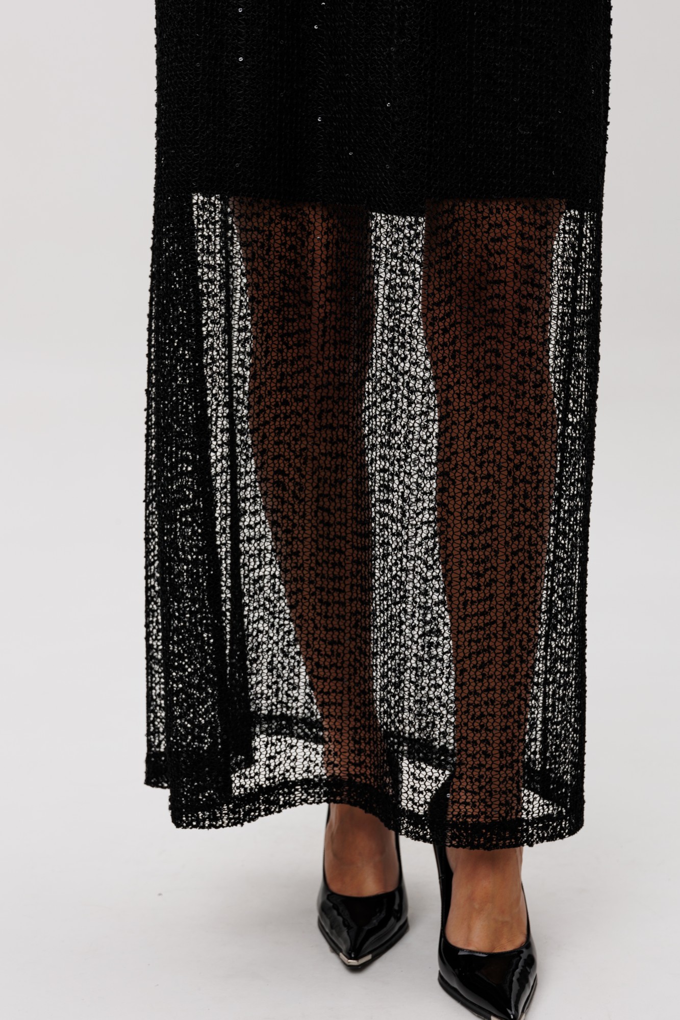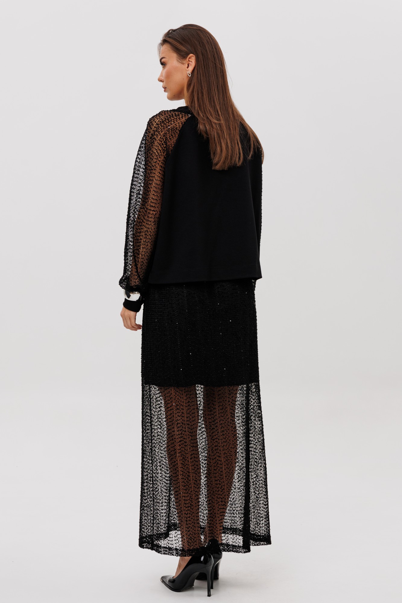 Юбка макси гармонично поддерживает дизайн: плотная внутренняя часть обеспечивает комфорт и уверенность, а длинная прозрачная нижняя вставка из мерцающей сетки добавляет загадочности и женственности. Комплект смотрится нарядно, но остаётся практичным — идеален как для вечерних выходов, так и для особых событий, где хочется выглядеть эффектно, но без излишнего пафоса.