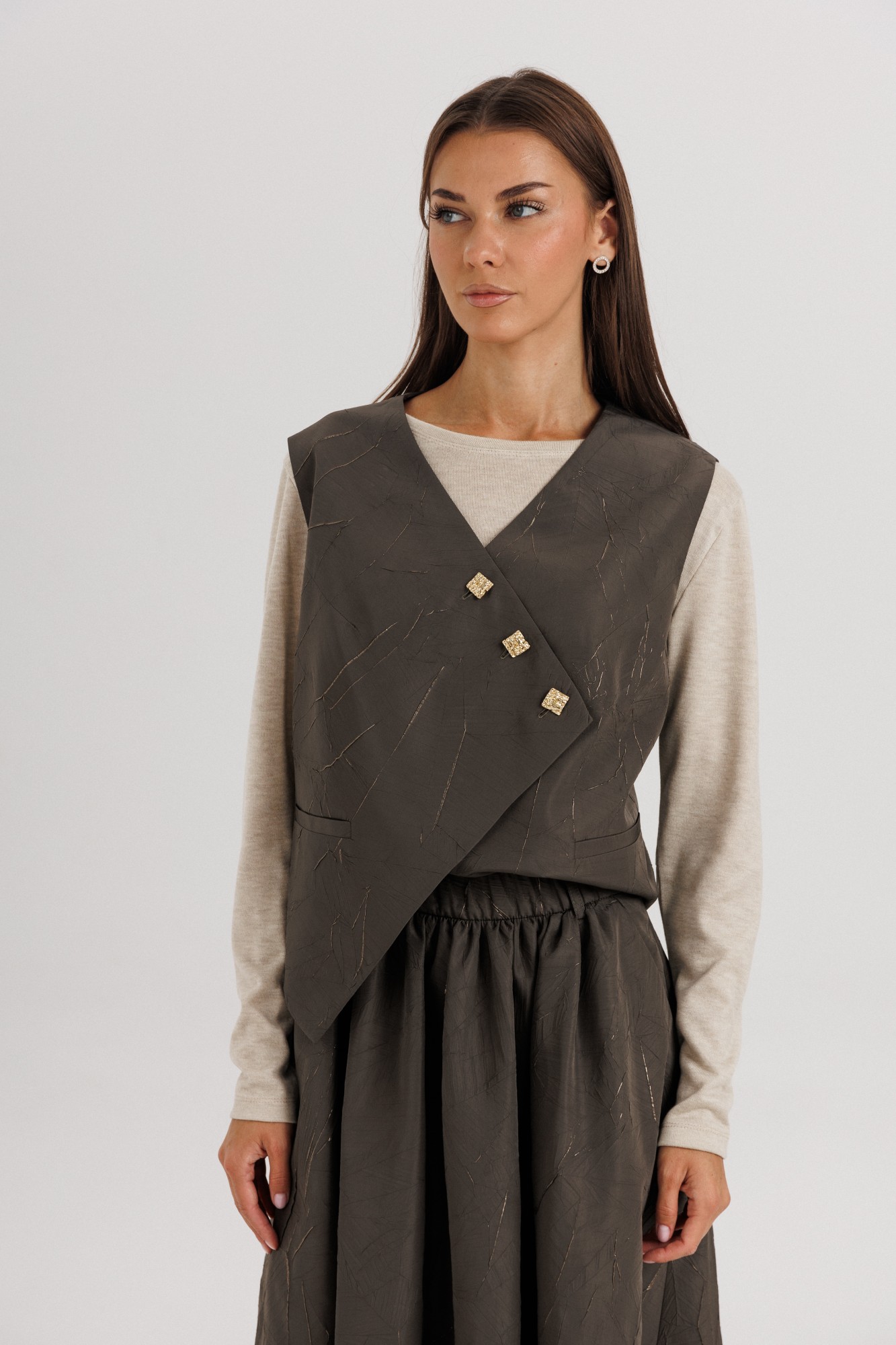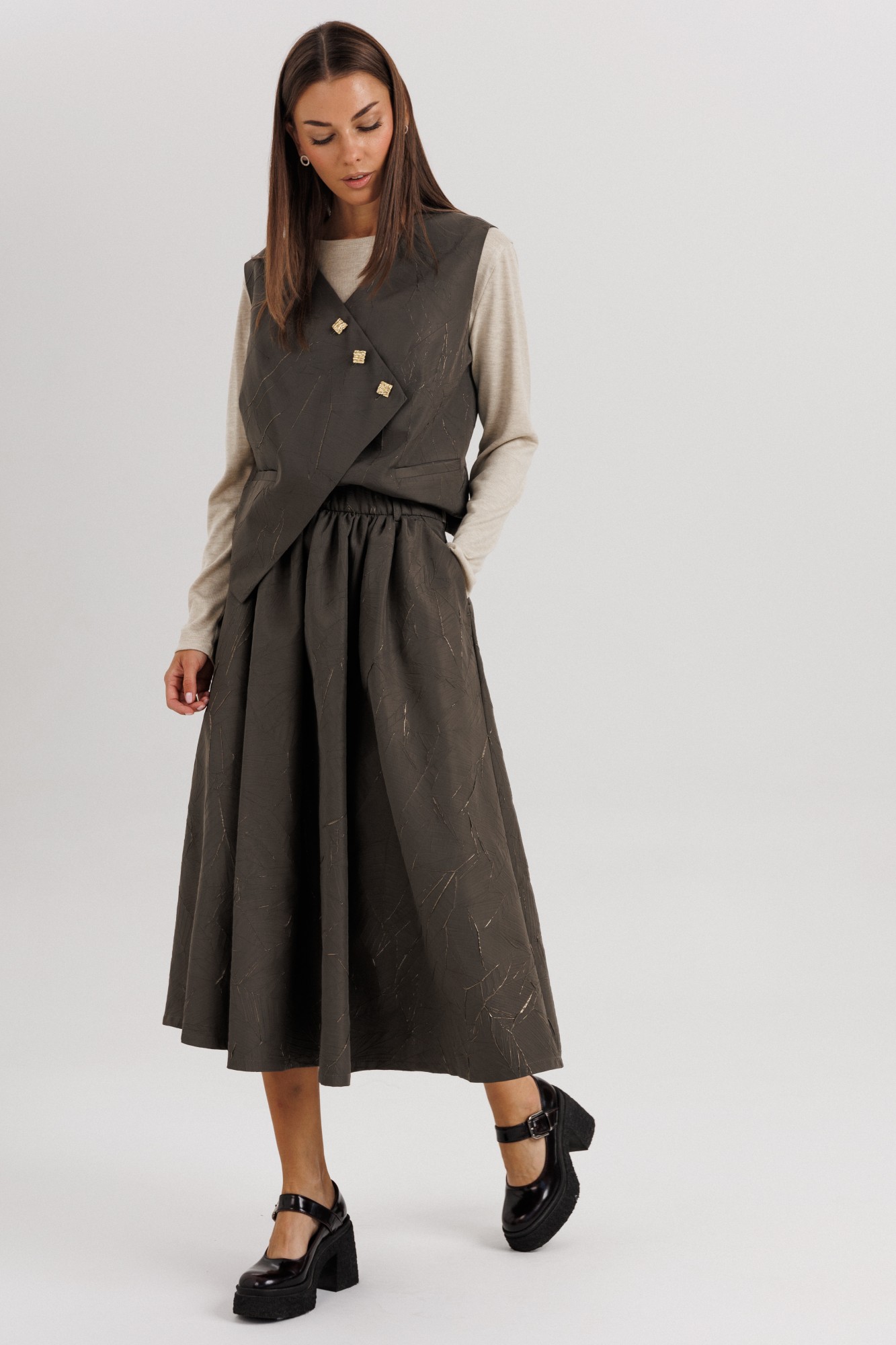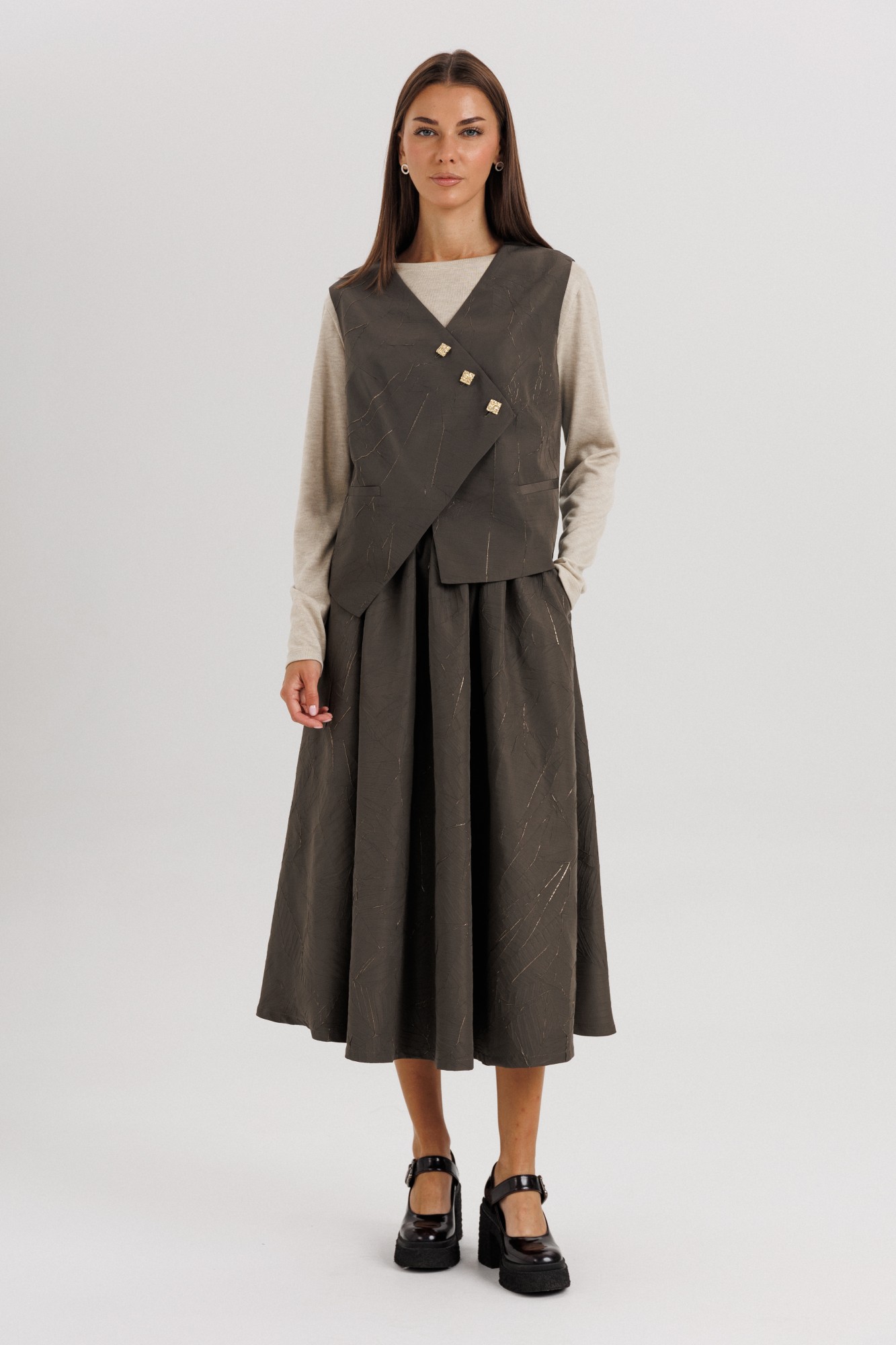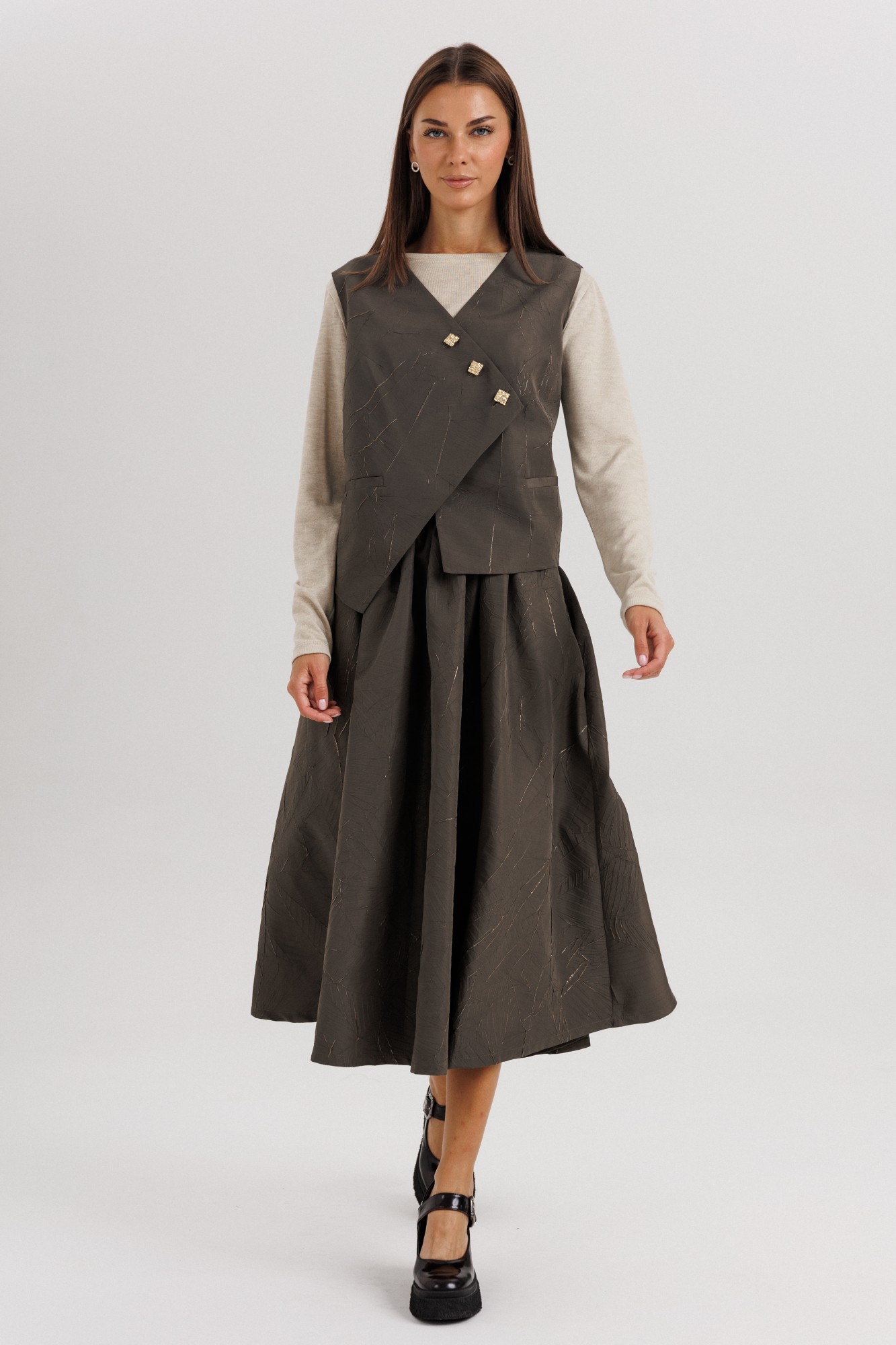 Стильная юбочная тройка — современное решение для элегантного и комфортного образа. Комплект состоит из трёх изделий: расклешённой миди-юбки, асимметричного жилета и базового лонгслива. Модель сочетает лаконичный дизайн и продуманный крой, создавая гармоничный образ для офиса, прогулок или повседневных встреч. Жилет выполнен из плотной фактурной ткани с декоративной асимметричной застёжкой на пуговицы — этот элемент придаёт образу динамичность и оригинальность. Юбка длиной миди с мягкими складками красиво драпируется и подчеркивает женственность силуэта. Лонгслив из мягкого трикотажа обеспечивает комфорт и добавляет легкости всему ансамблю. Комплект легко комбинируется с обувью на каблуке или платформе, а также с ботинками и сапогами, создавая универсальный вариант на каждый день. Особенности модели: Комплект из трёх предметов: жилет, юбка, лонгслив. Асимметричная застёжка жилета на декоративные пуговицы. Юбка миди длины с мягкими складками. Лонгслив из мягкого трикотажа. Комфортный свободный силуэт. Универсальный стиль — от офиса до городских прогулок. Материал: Жилет и юбка: плотная фактурная ткань с лёгким блеском. Лонгслив: мягкий эластичный трикотаж.