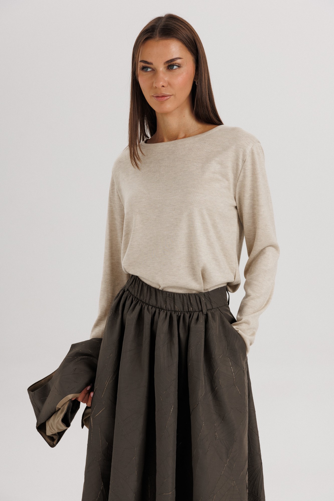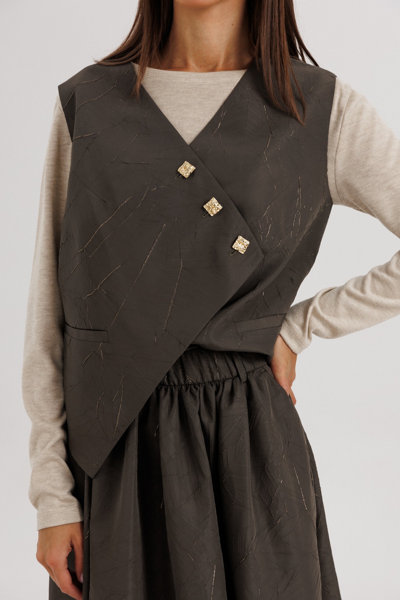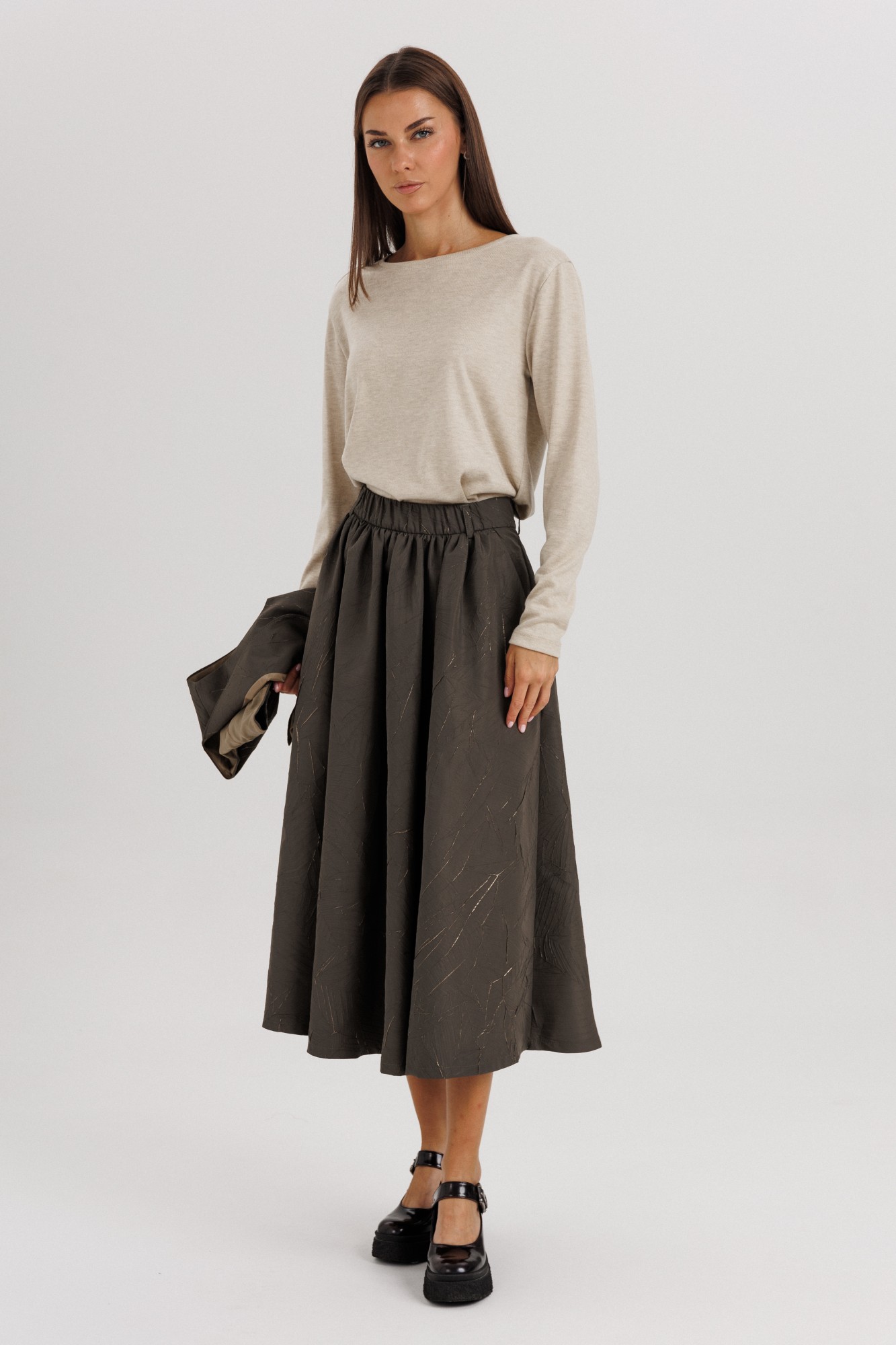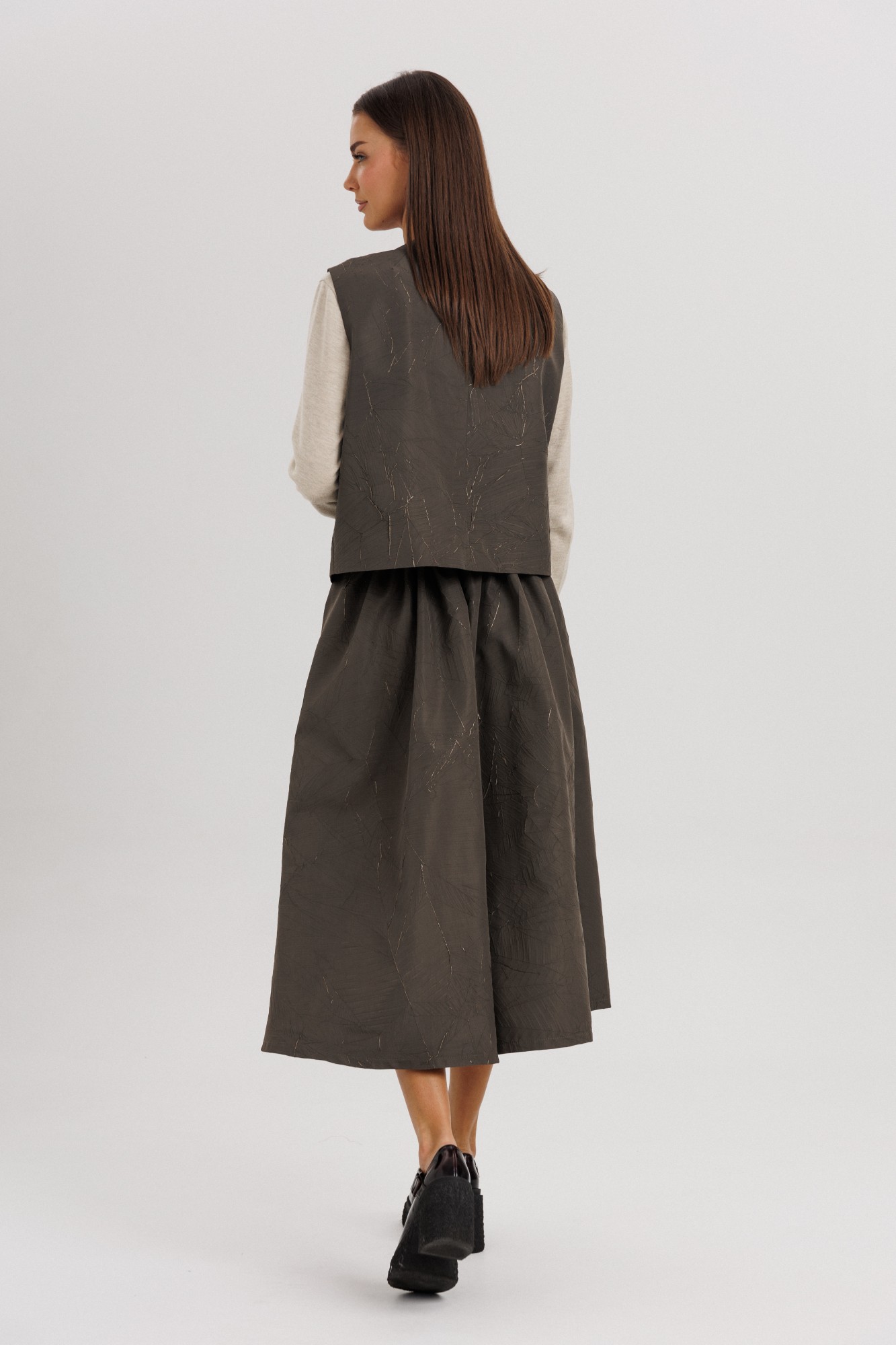 Стильная юбочная тройка — современное решение для элегантного и комфортного образа. Комплект состоит из трёх изделий: расклешённой миди-юбки, асимметричного жилета и базового лонгслива. Модель сочетает лаконичный дизайн и продуманный крой, создавая гармоничный образ для офиса, прогулок или повседневных встреч. Жилет выполнен из плотной фактурной ткани с декоративной асимметричной застёжкой на пуговицы — этот элемент придаёт образу динамичность и оригинальность. Юбка длиной миди с мягкими складками красиво драпируется и подчеркивает женственность силуэта. Лонгслив из мягкого трикотажа обеспечивает комфорт и добавляет легкости всему ансамблю. Комплект легко комбинируется с обувью на каблуке или платформе, а также с ботинками и сапогами, создавая универсальный вариант на каждый день. Особенности модели: Комплект из трёх предметов: жилет, юбка, лонгслив. Асимметричная застёжка жилета на декоративные пуговицы. Юбка миди длины с мягкими складками. Лонгслив из мягкого трикотажа. Комфортный свободный силуэт. Универсальный стиль — от офиса до городских прогулок. Материал: Жилет и юбка: плотная фактурная ткань с лёгким блеском. Лонгслив: мягкий эластичный трикотаж.