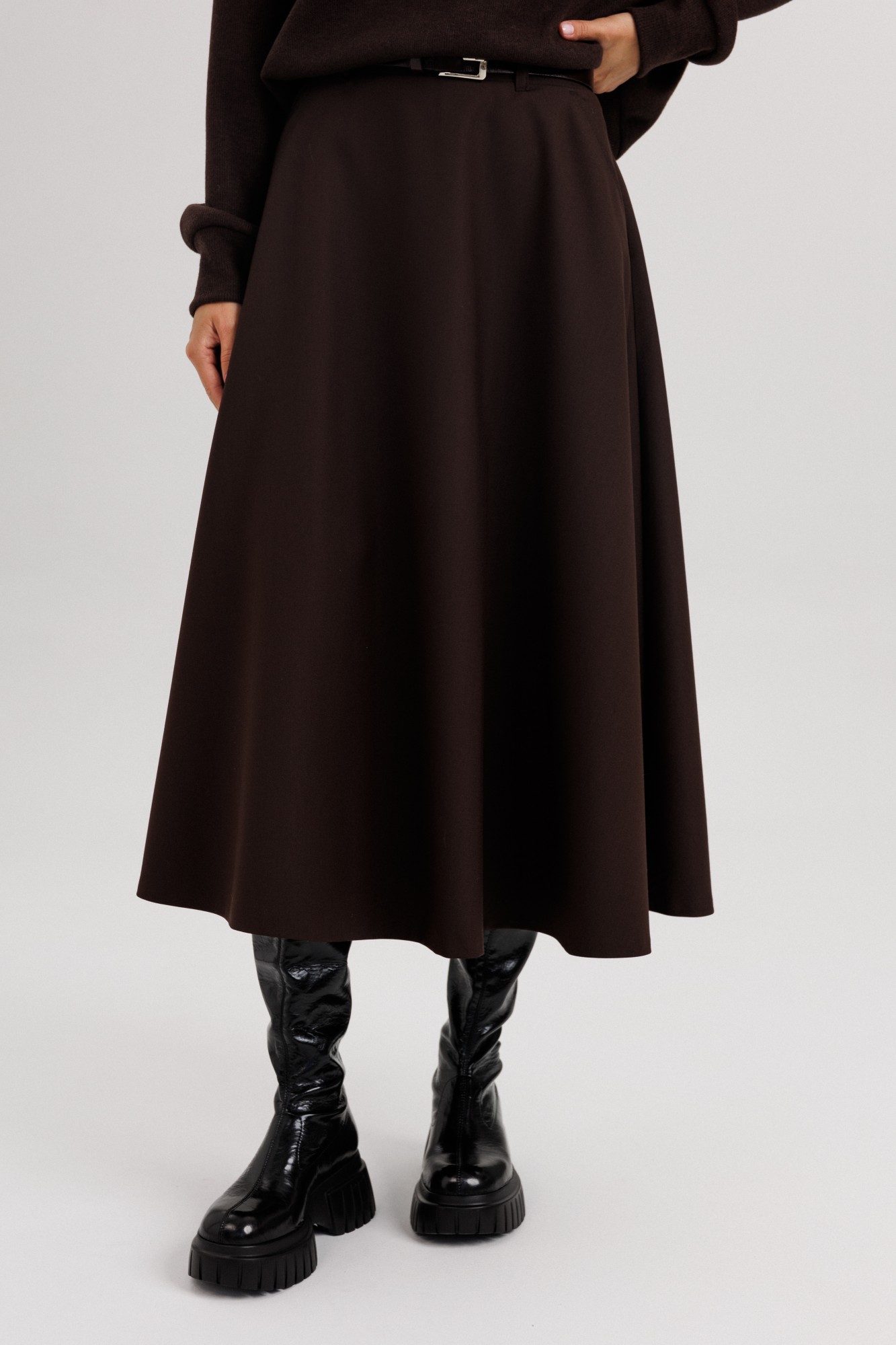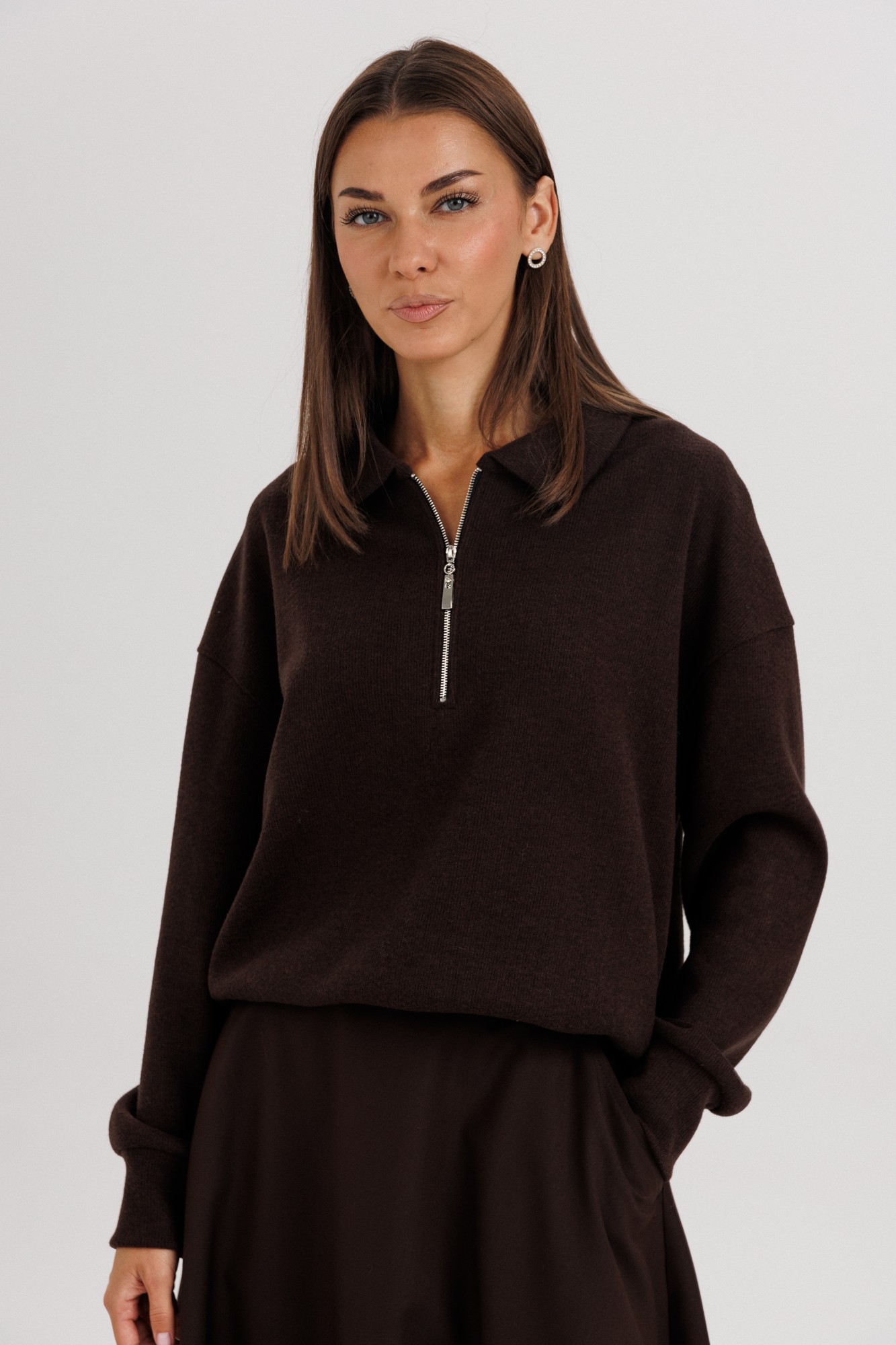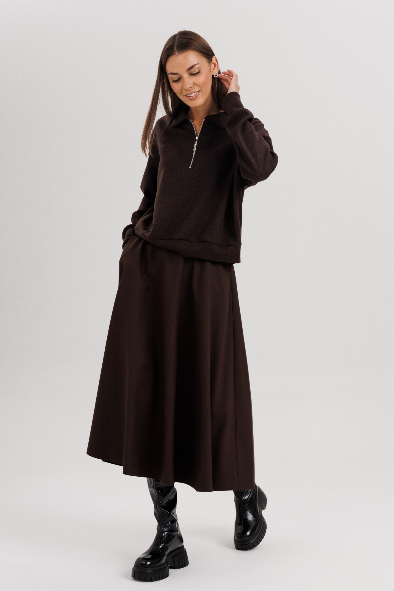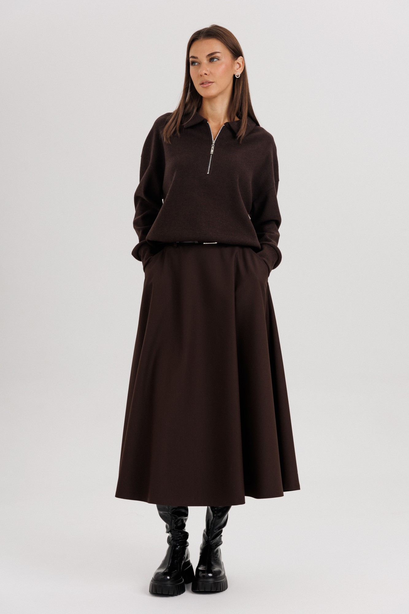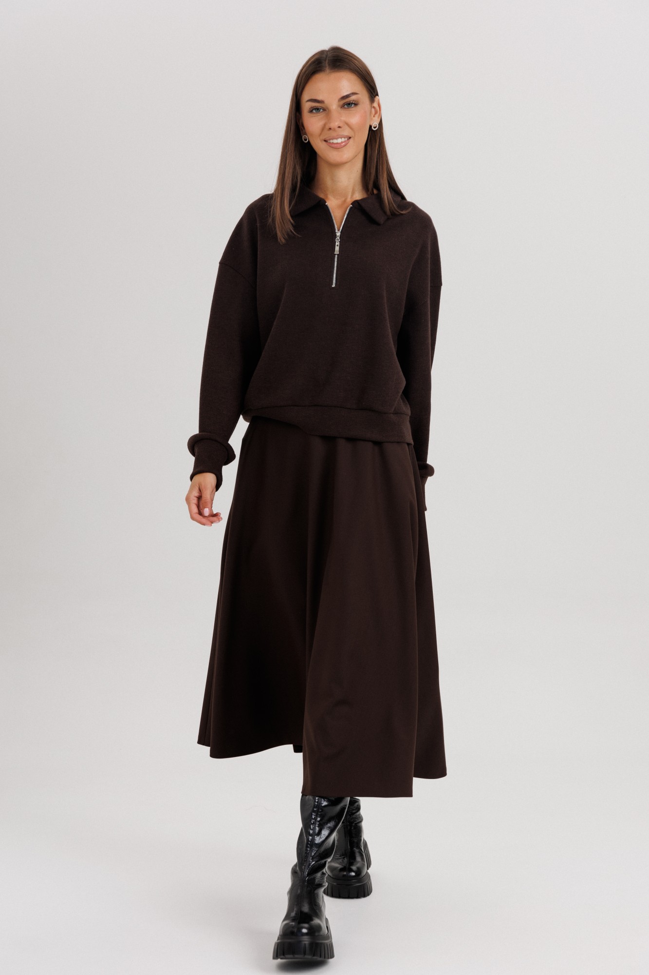 Комплект невероятно комфортный, в самом трендовом цвете сезона. Джемпер из трикотажа. Это одна из базовых вещей осенне-зимнего сезона. Он тёплый, удобный и невероятно комфортный. К тому же, настолько универсален, что его можно стилизовать абсолютно разными способами. Свободный покрой с заниженной линией плеча, рукав рубашечного покроя на отрезной манжете, воротник классический, по центру полочки частичная застёжка-молния. По низу джемпера - отрезной пояс. Юбка коническая, длины миди на притачном поясе, частично эластичном в области спинки. По боковым швам - наклонные карманы, застёжка по центру заднего полотнища на тесьму-молнию и петлю пуговицу. Поя в комплект не входит.