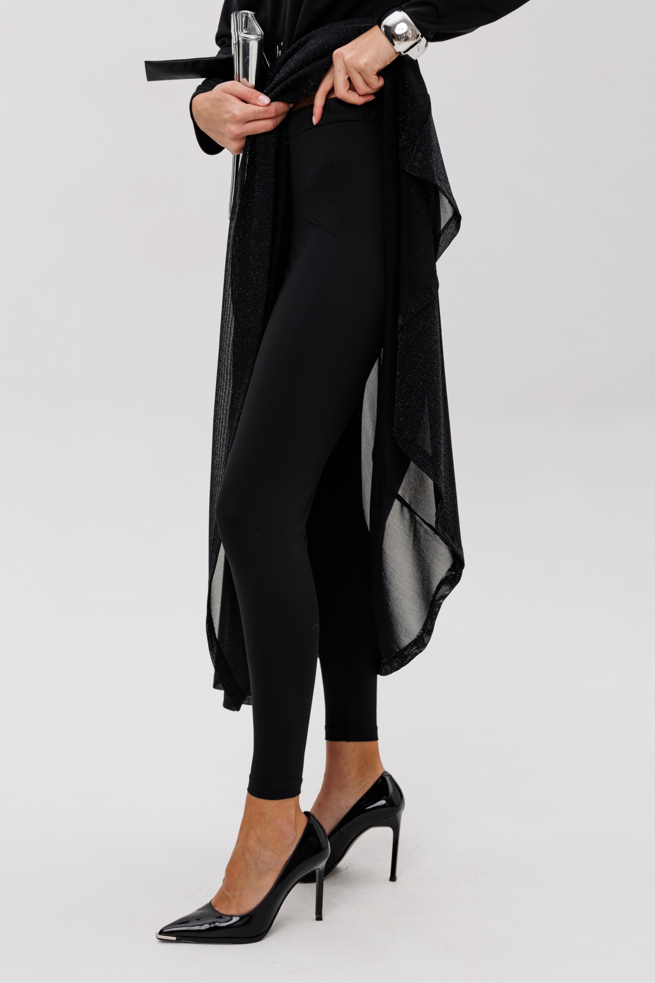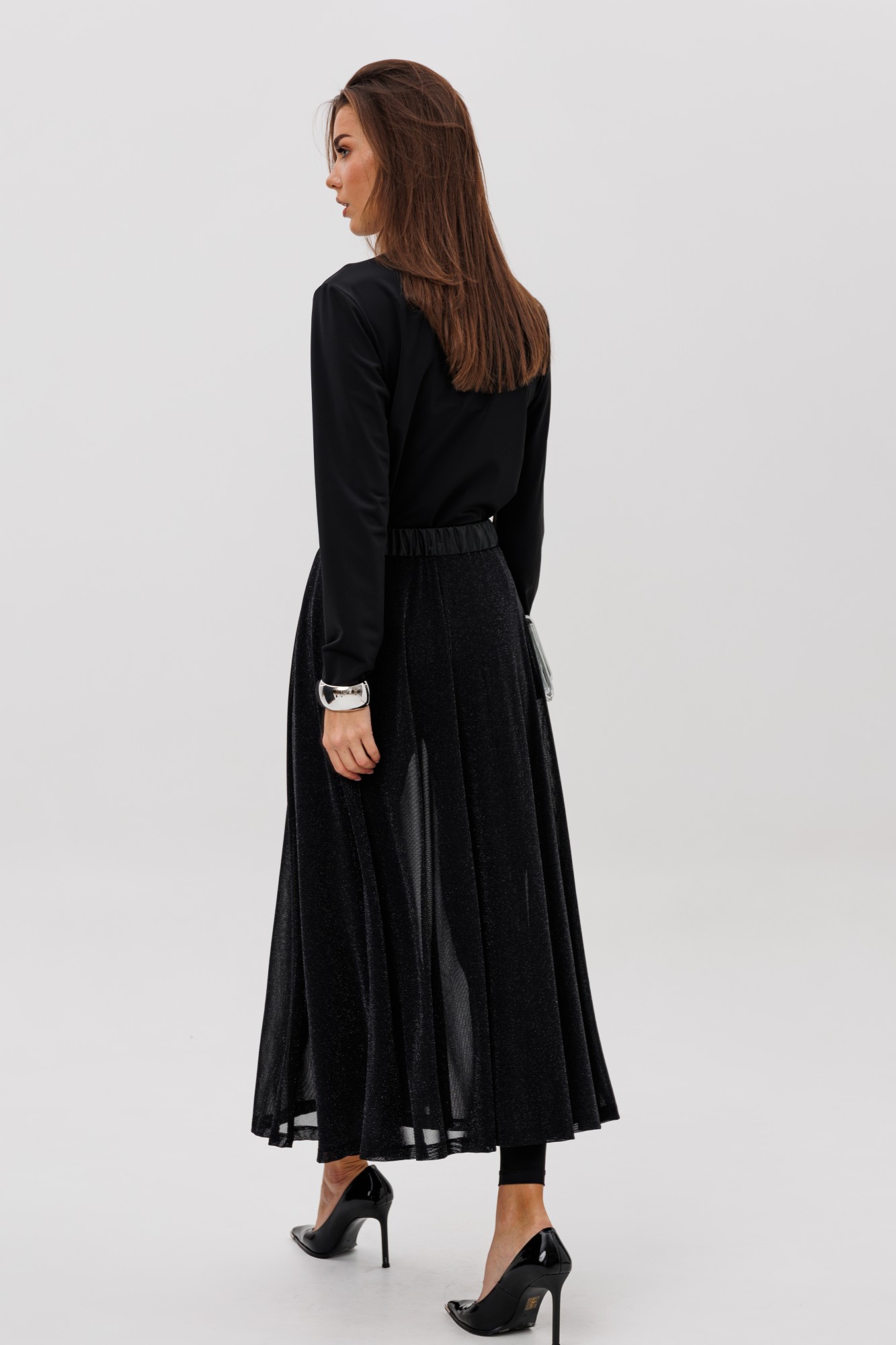Этот комплект-тройка воплощает гармонию комфорта и праздничной элегантности. Базовый лонгслив и облегающие легинсы создают мягкую, аккуратную основу силуэта, позволяя главной звезде ансамбля — эффектной юбке-солнце — раскрыться во всей красоте. Юбка выполнена из воздушной мерцающей сетки, которая красиво ловит свет при каждом движении, создавая по-настоящему нарядное, торжественное настроение. Лёгкое сияние ткани добавляет образу утончённости, а отделочный пояс из экокожи акцентирует талию и придаёт современной графичности. Такой комплект станет идеальным решением для особых случаев — от вечерних мероприятий до стильных праздничных выходов. Он выглядит эффектно, дорого и женственно, сохраняя при этом абсолютный комфорт — идеальный баланс для современной модницы.