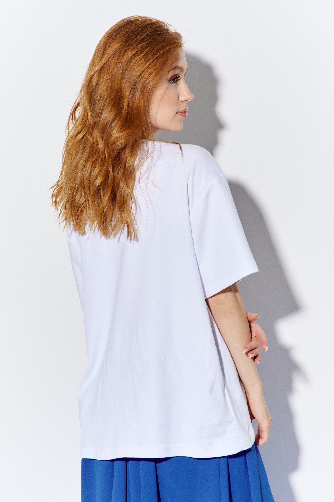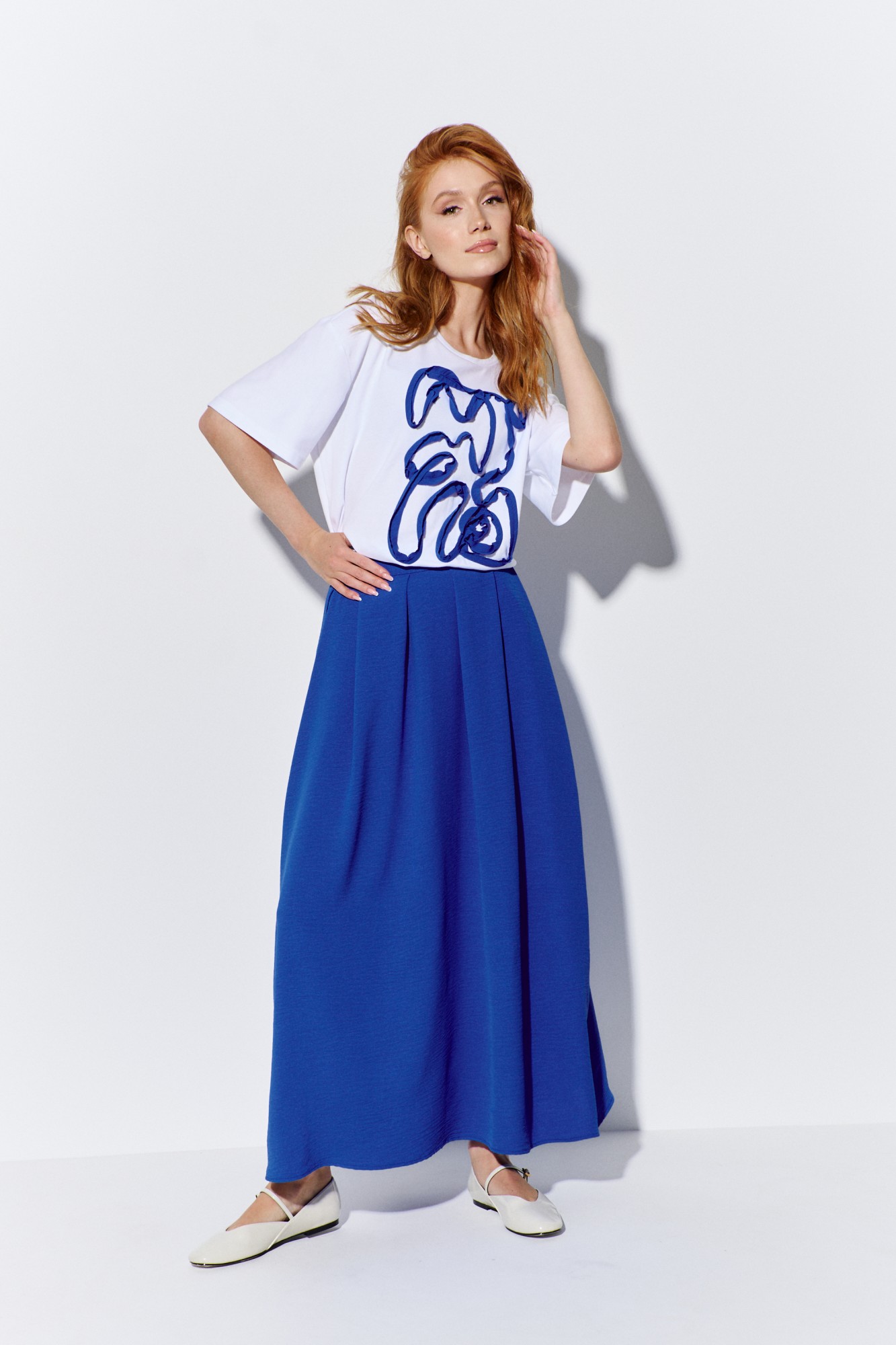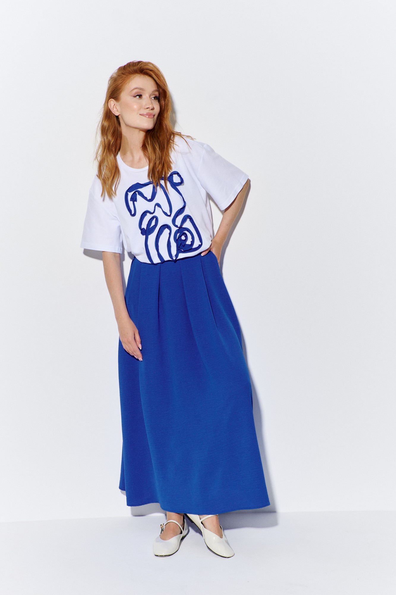 Комплект майка с юбкой. Характеристики: юбка выполнена из плательной ткани в васильковом цвете, застежка - молния по заднему полотнищу, по переду и спинке складки, в боковых швах карманы с клапаном. Характеристики: выполнена из трикотажного полотна в белом цвете, по переду декоративная аппликация, по горловине обработана планка, рукав укороченный.