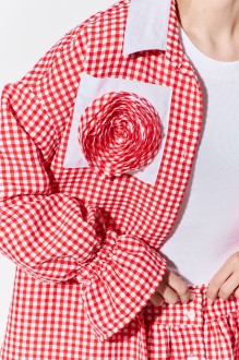 Комплект двойка: рубашка и юбка. Рубашка выполнена из рубашечной ткани в красно-белую клетку, по полочке карман с декоративным цветком, центральная застежка на петли и пуговицы, по спинке отрезная кокетка, верхний воротник из отделочной ткани, низ рукава обработан тесьмой-резинкой. Юбка выполнена из рубашечной ткани в красно-белую клетку, по переду застежка - планка на петли и пуговицы, пояс обработан эластичной тесьмой-резинкой.