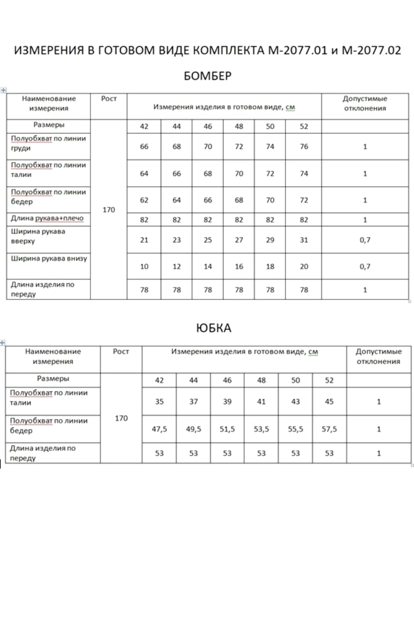Таблица размеров