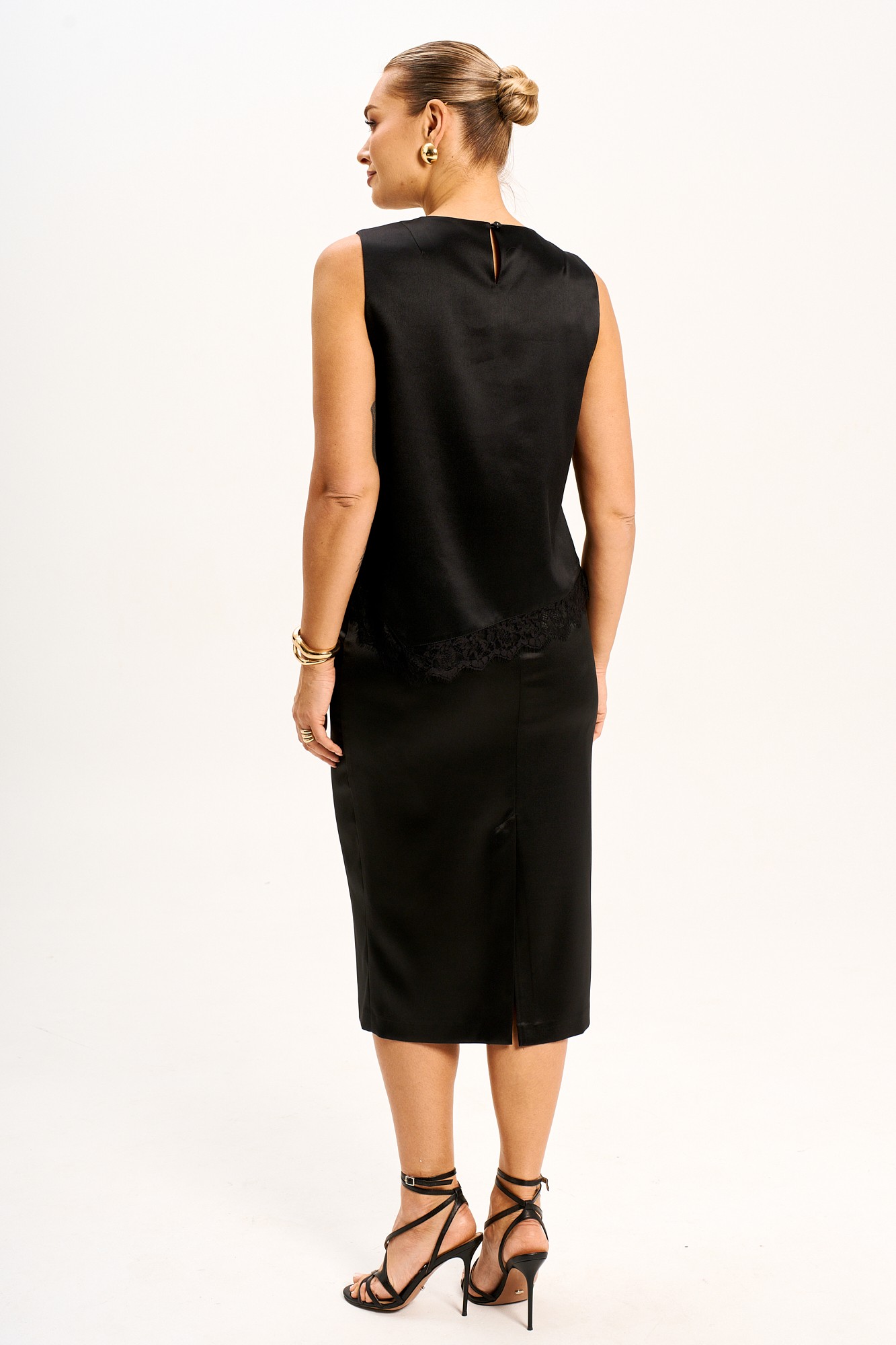 Женский костюм полуприлегающего силуэта выполнен из шелк- сатина средней плотности. Блуза с ассиметричной линией низа дополнена французским кружевом, которое держит форму; в боковых швах разрезы; по спинке застежка в виде "капельки" с петлей и пуговицей. Юбка с завышенной линией талии на подкладке; застежка на молнию; по спинке шлица. Платье полностью соответствует заявленному размеру. Пожалуйста, пользуйтесь таблицей замеров готового изделия, чтобы подобрать идеальный размер.