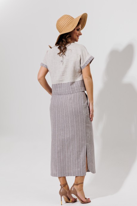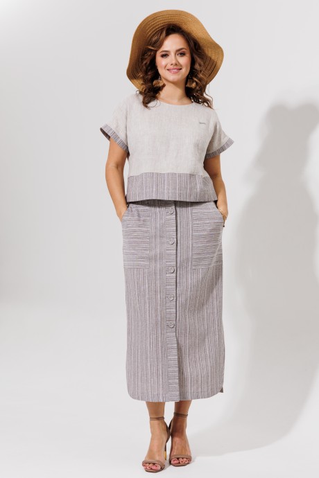 Комплект женский, состоящий из блузки и юбки, из натурального льна. Блузка прямого силуэта с цельнокроеным коротким рукавом, по низу переда и спинки притачная деталь из отделочной ткани, по низу рукава манжеты из отделочной ткани. Перед блузки украшен металлической пришивной фурнитурой. На спинке блузки функциональная застежка-планка с пуговицами из отделочной ткани в полоску. Юбка на поясе, прямого силуэта до середины икры с фигурными разрезами по низу. Спереди юбки есть функциональная застежка на петли и пуговицы, а также накладные карманы.