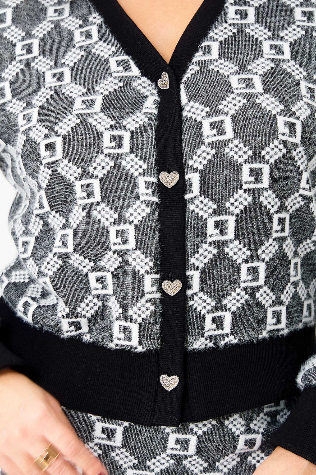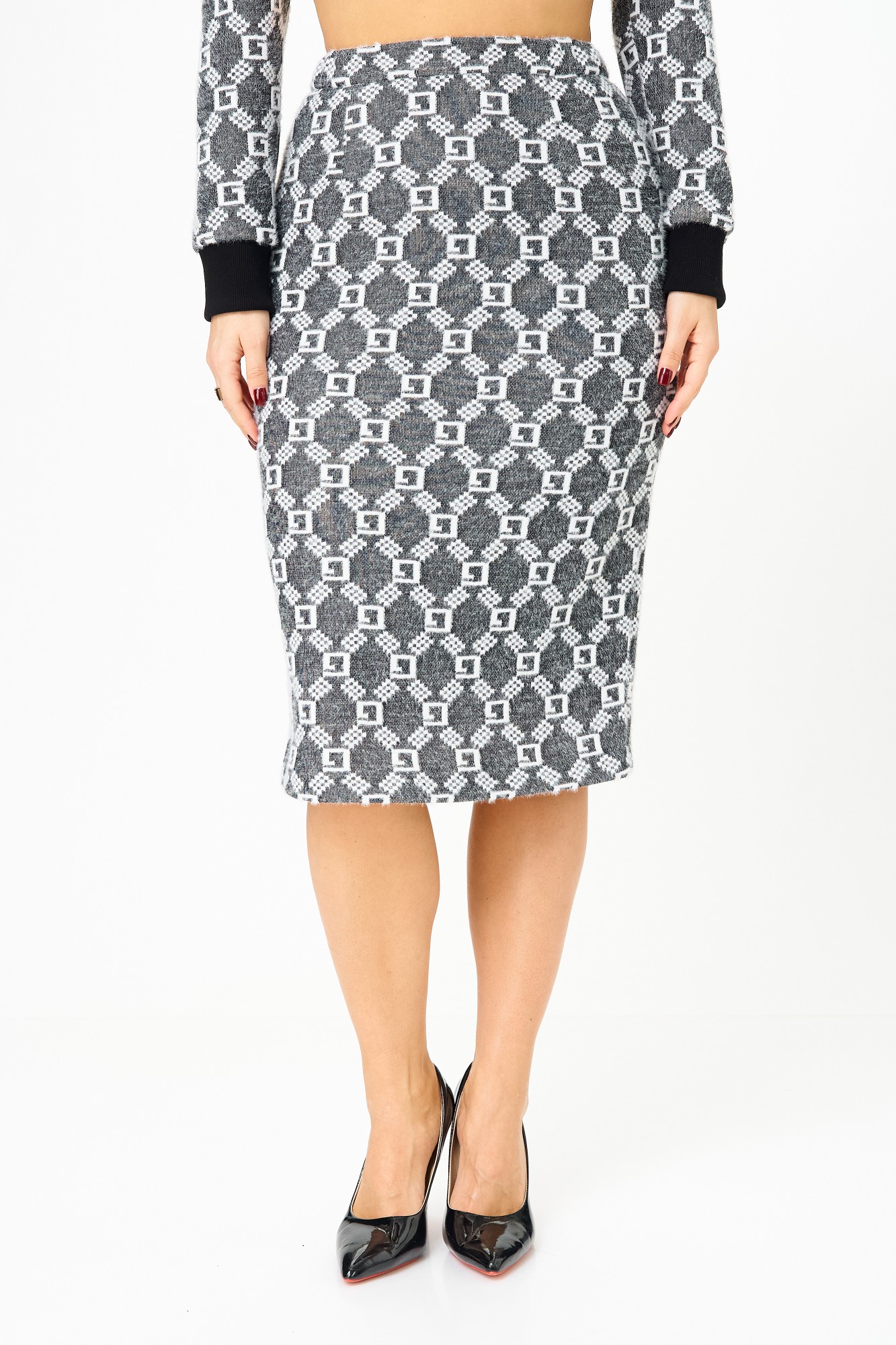 Костюм женский изготовлен из трикотажной ткани. Низ жакета, рукава и край борта обработан довязом. Жакет имеет v-образный вырез. Застёгивается на четыре петли пуговицы. Юбка прямая, на подкладке, на поясе, слегка зауженная к низу. Длина ниже линии колена. Средний шов юбки заканчивается шпицей.