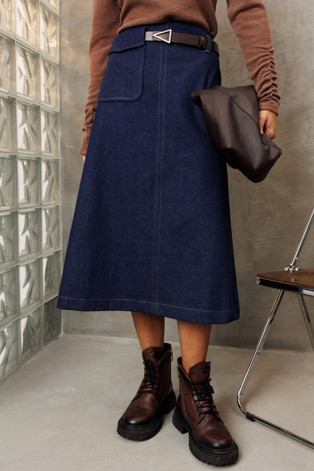 Костюм состоит из джемпера и юбки. Джемпер прямого силуэта с воротником поло из теплого трикотажного полотна. Рукав втачной одношовный. Юбка А-образного силуэта из плотного джинса. Передняя часть юбки со средним швом. С правой стороны вверху настрочен карман с клапаном- шлевкой. Задняя часть юбки со средним швом и вытачками. Сверху в среднем шве обработана потайная молния. Вдоль линии пояса настрочены шлевки. Пояс цельнокроеный на обтачке. Юбка на подкладке. Вдоль среднего шва по переду и по периметру кармана проложена декоративная строчка. К юбке прилагается съёмный ремень. Фурнитура может быть изменена с охранением художественного замысла.