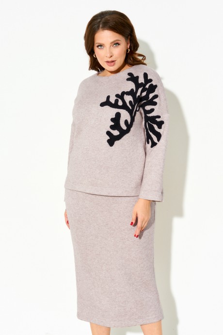 Костюм женский, состоящий из джемпера и юбки. Джемпер полуприлегающего силуэта из мягкого трикотажного полотна с добавлением ангоры со втачными немного спущенными рукавами и округлым вырезом горловины. По переду дизайнерская вышивка. Юбка полуприлегающего силуэта, зауженная книзу, на эластичной подкладке с притачным поясом на резинке; по спинке шлица. Рекомендована бережная стирка при t 30; глажение при максимальной температуре прессующей поверхности утюга не более 110 С.