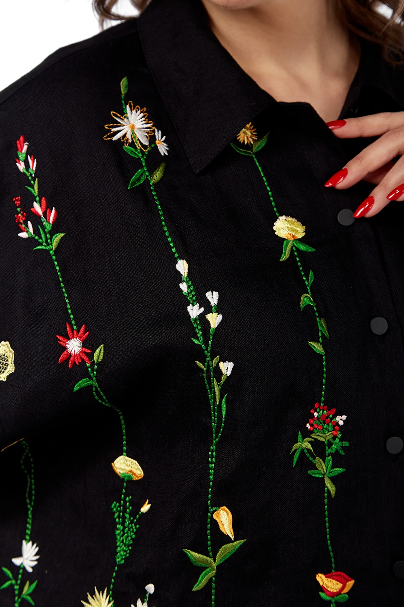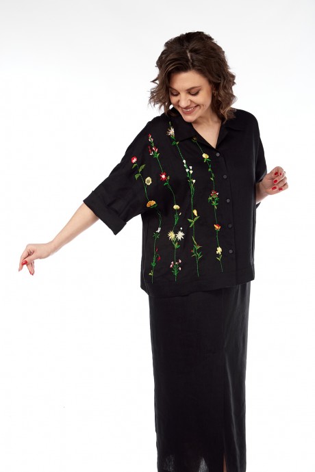 Костюм женский 2х-предметный, состоит из блузки и юбки, выполнен из натуральной ткани белорусского производства. Блузка свободного силуэта с воротником рубашечного типа и центральной застежкой на петли с пуговицами. Низ переда обработан притачной планкой. На спинке кокетка и складки. Рукава спущенные с отложными манжетами. Блузка декорирована вышивкой. Юбка прямого силуэта с притачным поясом, частично на эластичной тесьме. По переду обработаны боковые карманы, в центральном шве переда имеется шлица. Юбка на подкладке.