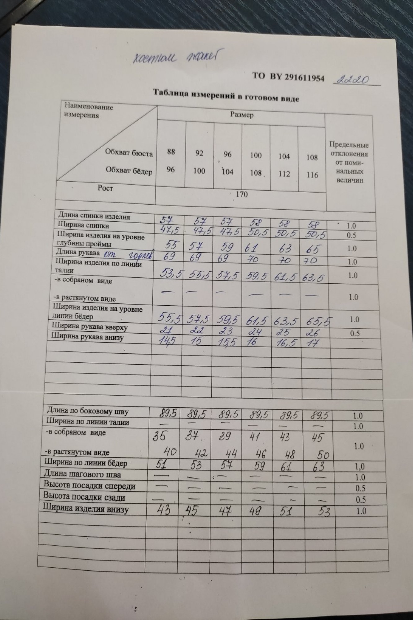 Таблица размеров