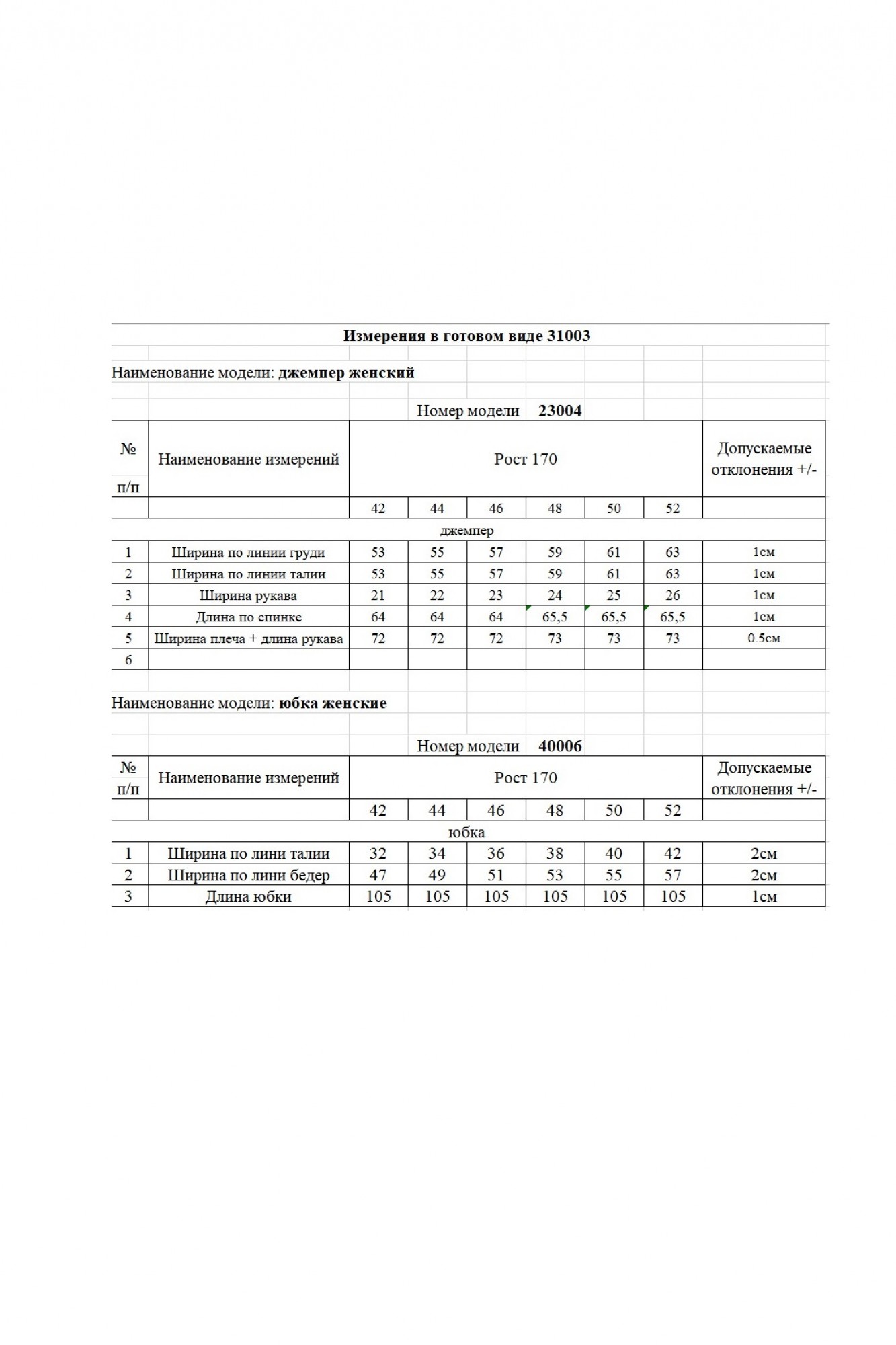 Таблица размеров