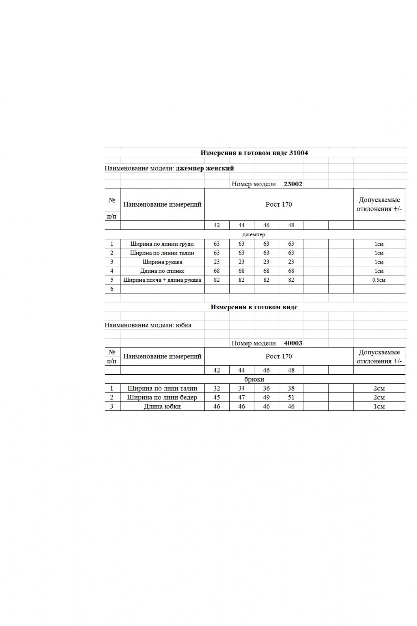 Таблица размеров