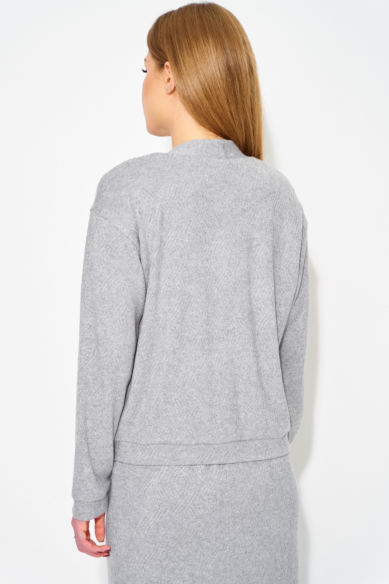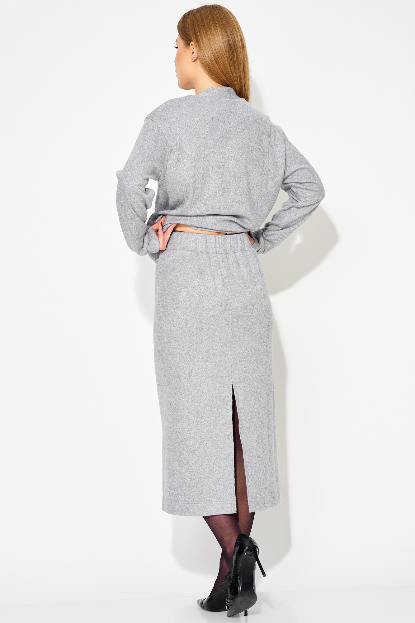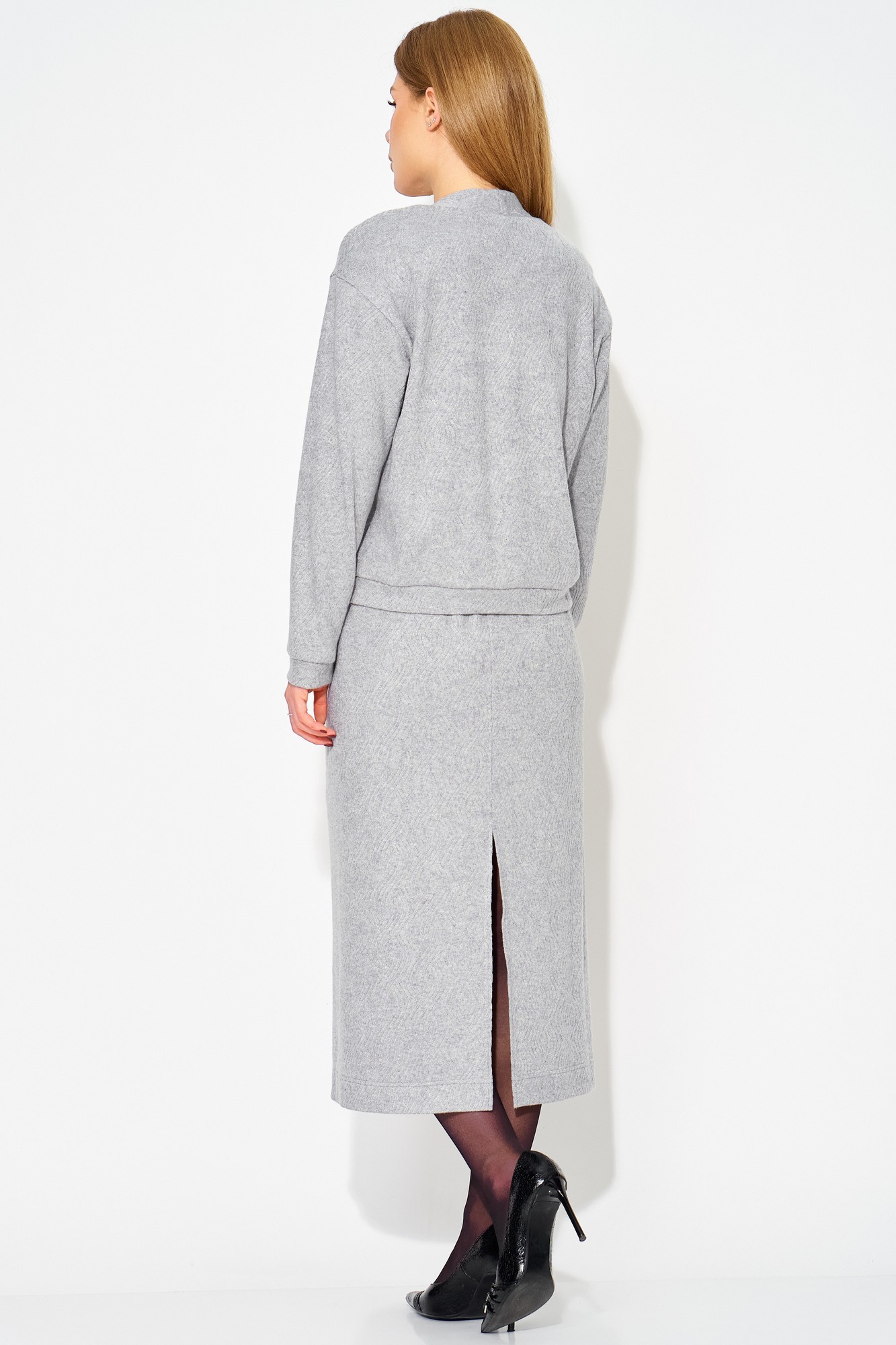 Трикотажный юбочный комплект от LAIKONY свободного силуэта. Джемпер длиной до линии бедер, застежка центральная на 4 петли и пуговицы. Вырез горловины V-образный, на деталях переда накладные карманы. Рукава втачные одношовные, с притачными манжетами. Линия плеча спущена. По низу джемпера, по краю борта и горловине - притачная планка. Юбка прямого силуэта, на подкладке, длиной до колена. Пояс притачной, в пояс вставлена эластичная тесьма. Заднее полотнище юбки со средним швом, внизу шва обработан разрез. Декор может отличаться от представленного на фотографии. Ткань - трикотаж средней плотности, хорошо тянется. Комфортный офисный костюм для повседневного использования.