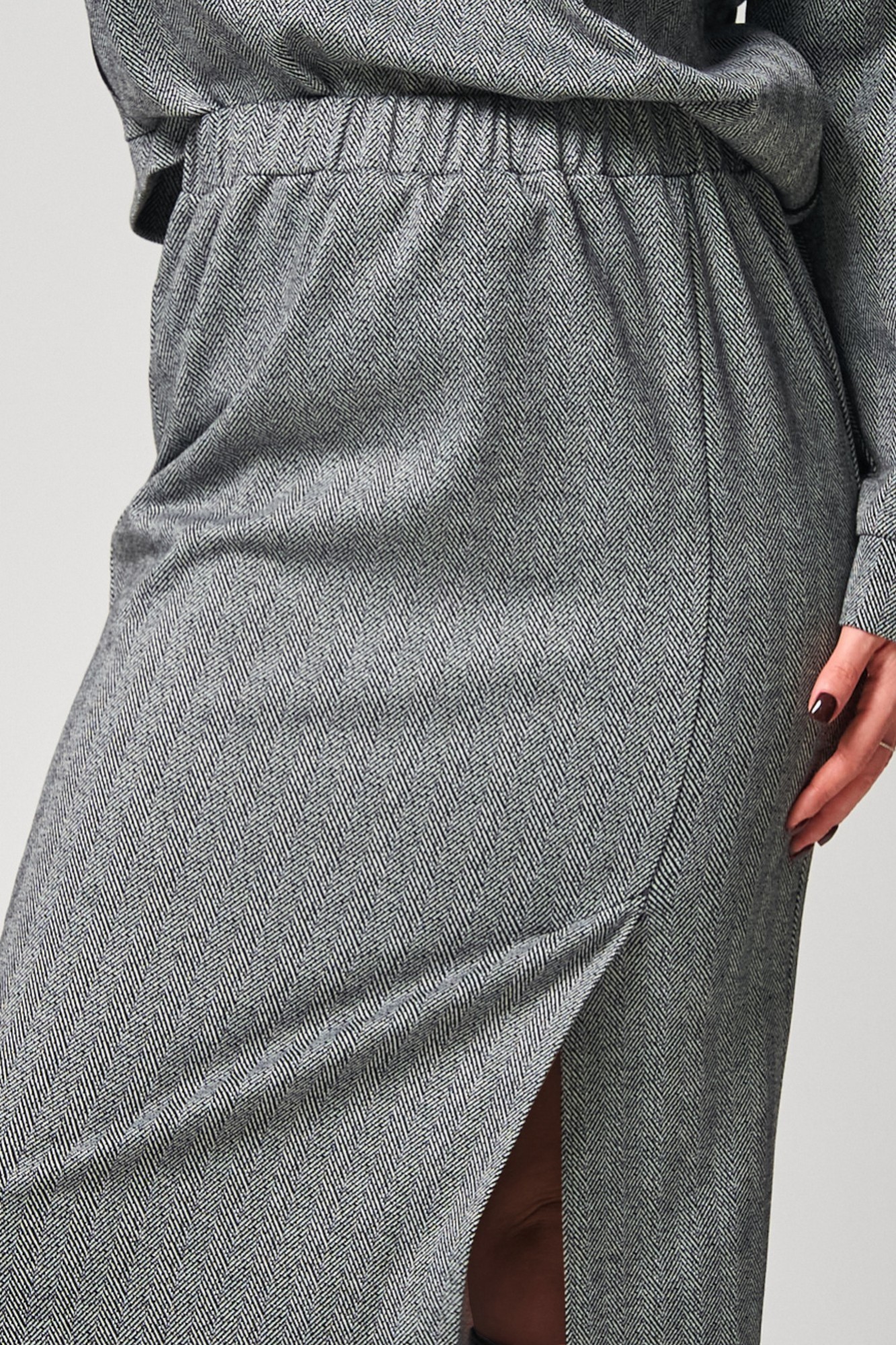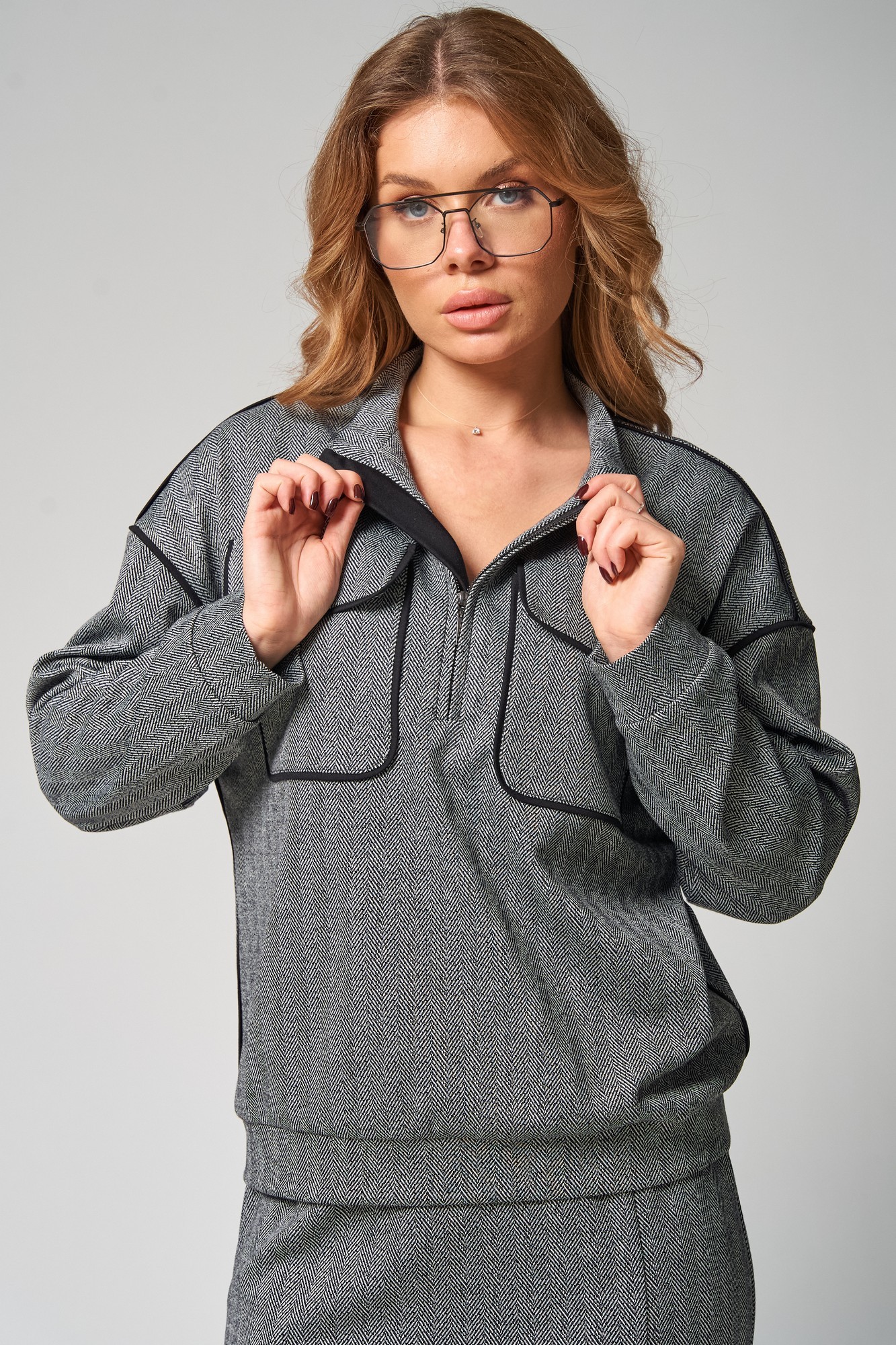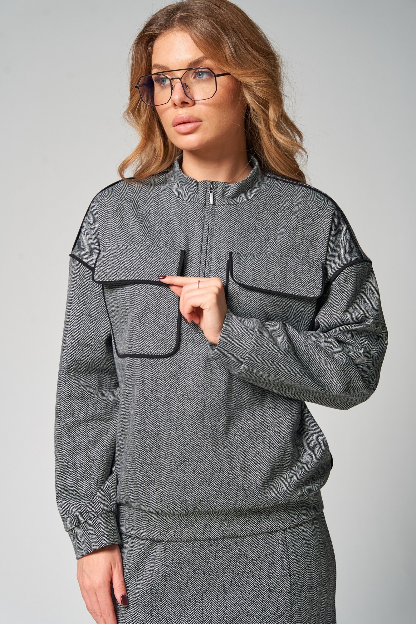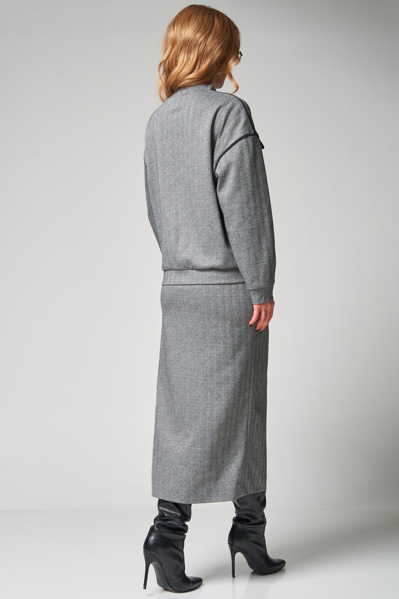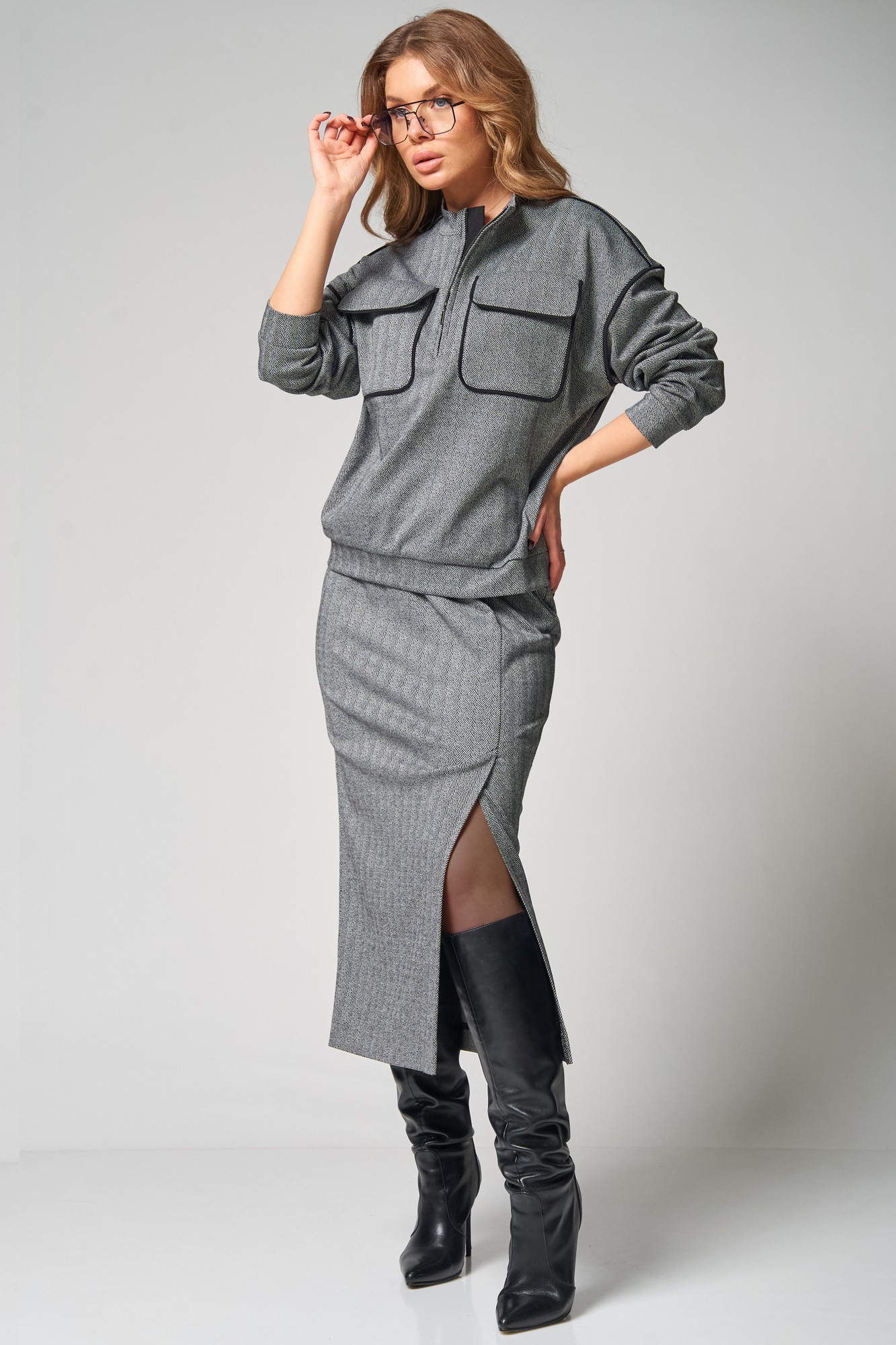 Стильный трикотажный комплект от LAIKONY свободного силуэта, состоящий из джемпера и брюк. Джемпер длиной до линии бедер. Воротник-стойка втачной, застежка на тесьму-молнию по центру. Спереди расположены карманы с клапанами фигурной формы и с отделочными кантами. Спинка цельная. Рукава втачные одношовные, с притачными манжетами. Линия плача спущена. По плечевым и по боковым швам, по швам втачивания рукавов вставлен отделочный кант. По низу джемпера идет притачная планка. Юбка плотно облегающая вверху и прямая к низу, длиной до середины икр. Пояс притачной, в который вставлена эластичная тесьма. Переднее полотнище юбки с рельефным швом, который заканчивается шпицей. Декор может отличаться от представленного на фотографии. Трикотаж средней плотности, тянется. Наш модный комплект идеально подойдет для офиса и повседневного использования.
