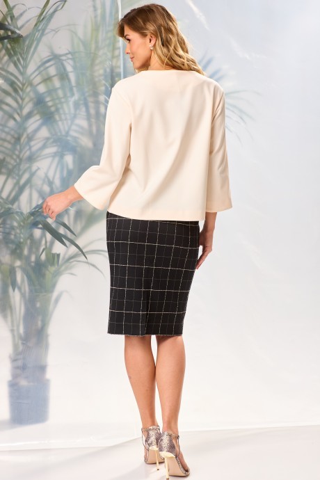 Жакет женский, полуприлегающего силуэта из поливискозной трикотажной ткани нежного персикового цвета, длиной до линии бедер, со спущенной линией плеча, с втачными рукавами. Деталь переда жакета с нагрудными вытачками, с накладными клапанами, вверху расположен съемный декор. Рукава втачные одношовные, длиной ¾, низ обработан обтачкой и вставлен декоративный кант. Вырез горловины округлой формы, обработан обтачкой, и вставлен декоративный кант. Юбка на бедрах из костюмной ткани в клетку, прямого силуэта, длиной до коленей, на подкладке, с притачным поясом, в который по боковым частям вставлена эластичная тесьма, с застежкой на потайную тесьму-молнию в среднем шве заднего полотнища. На деталях заднего полотнища по одной вытачке, внизу среднего шва обработан разрез. По поясу прикреплены 4 шлевки. Декор может отличаться от представленного на фотографии.