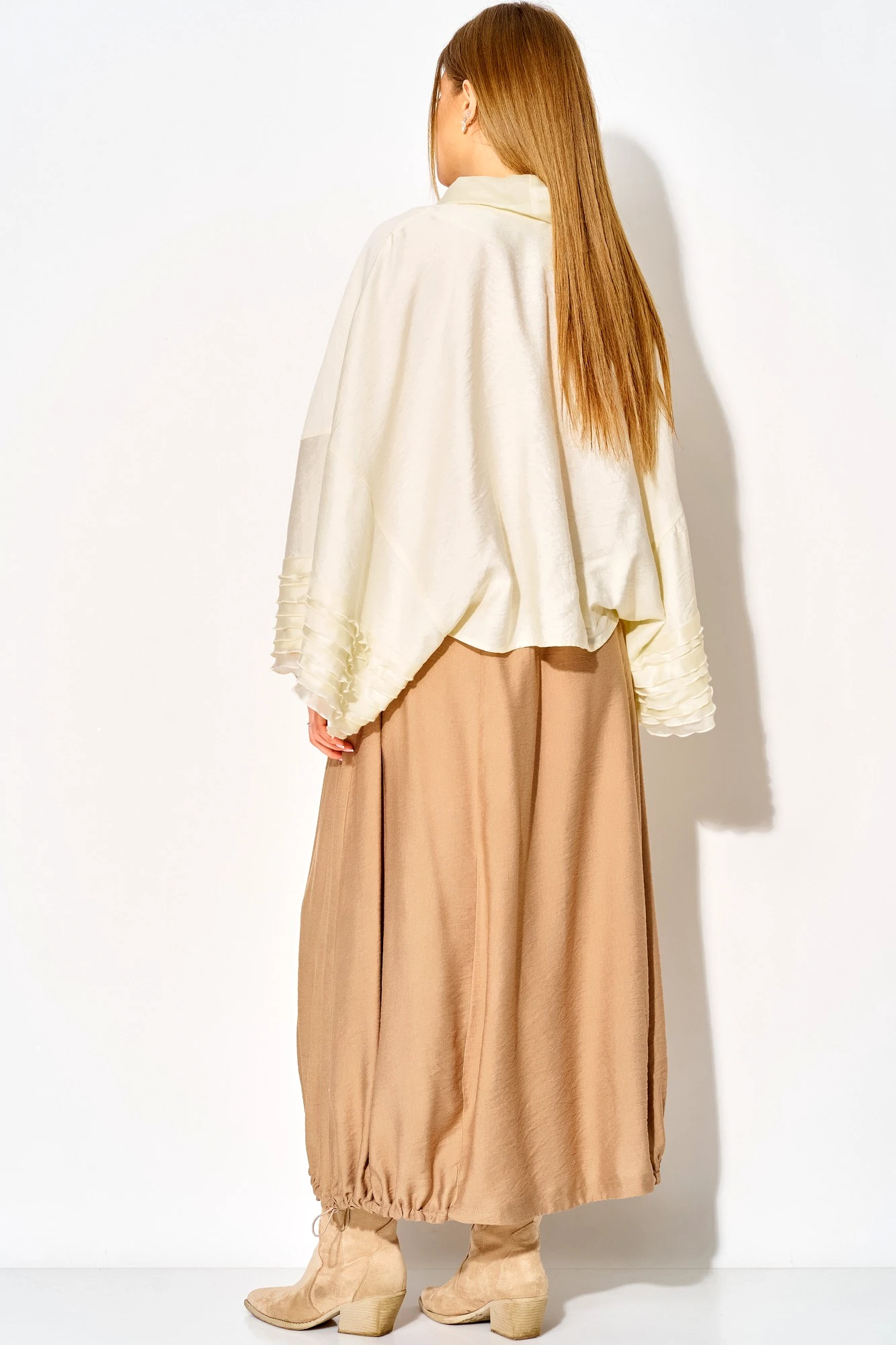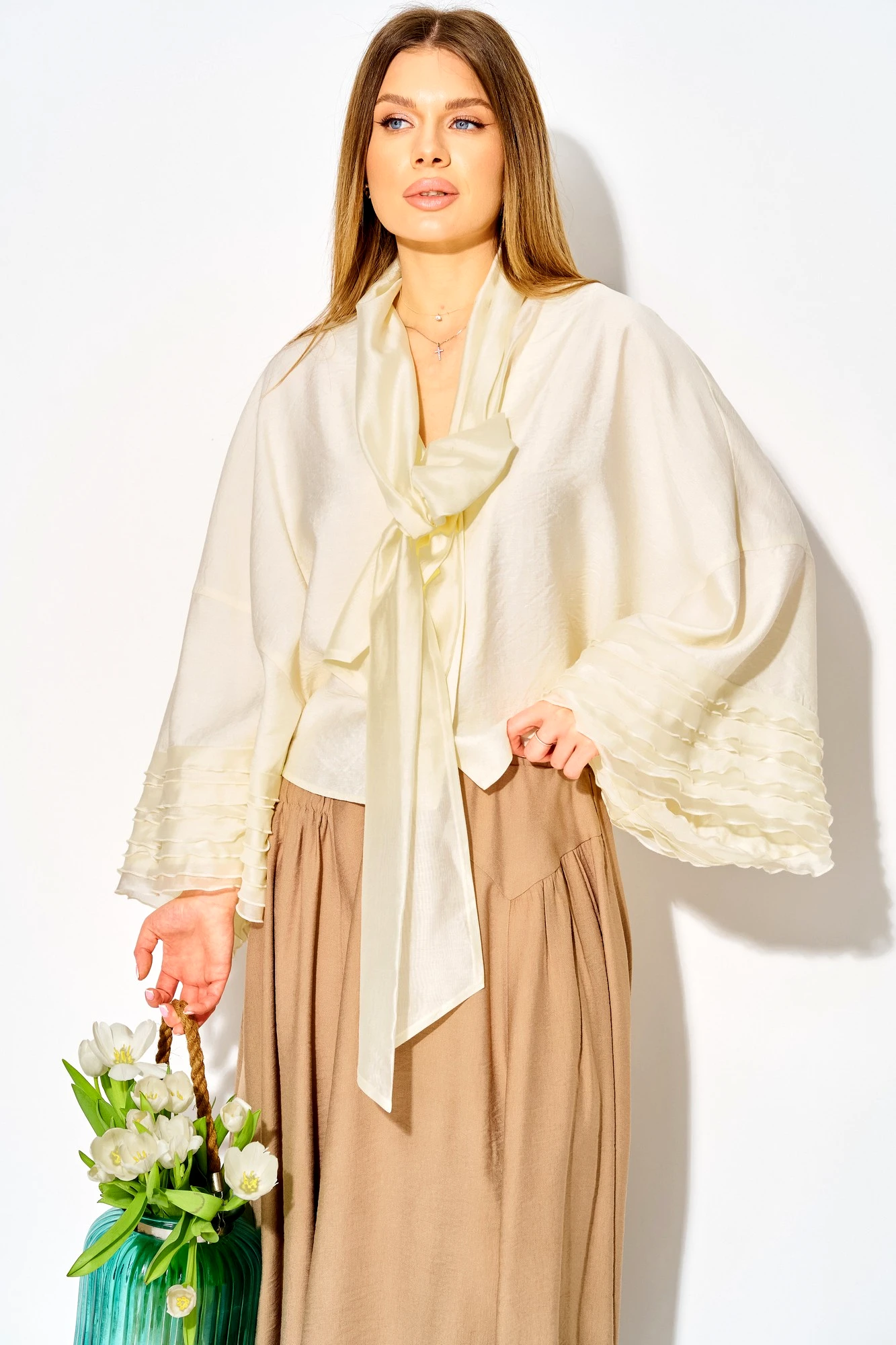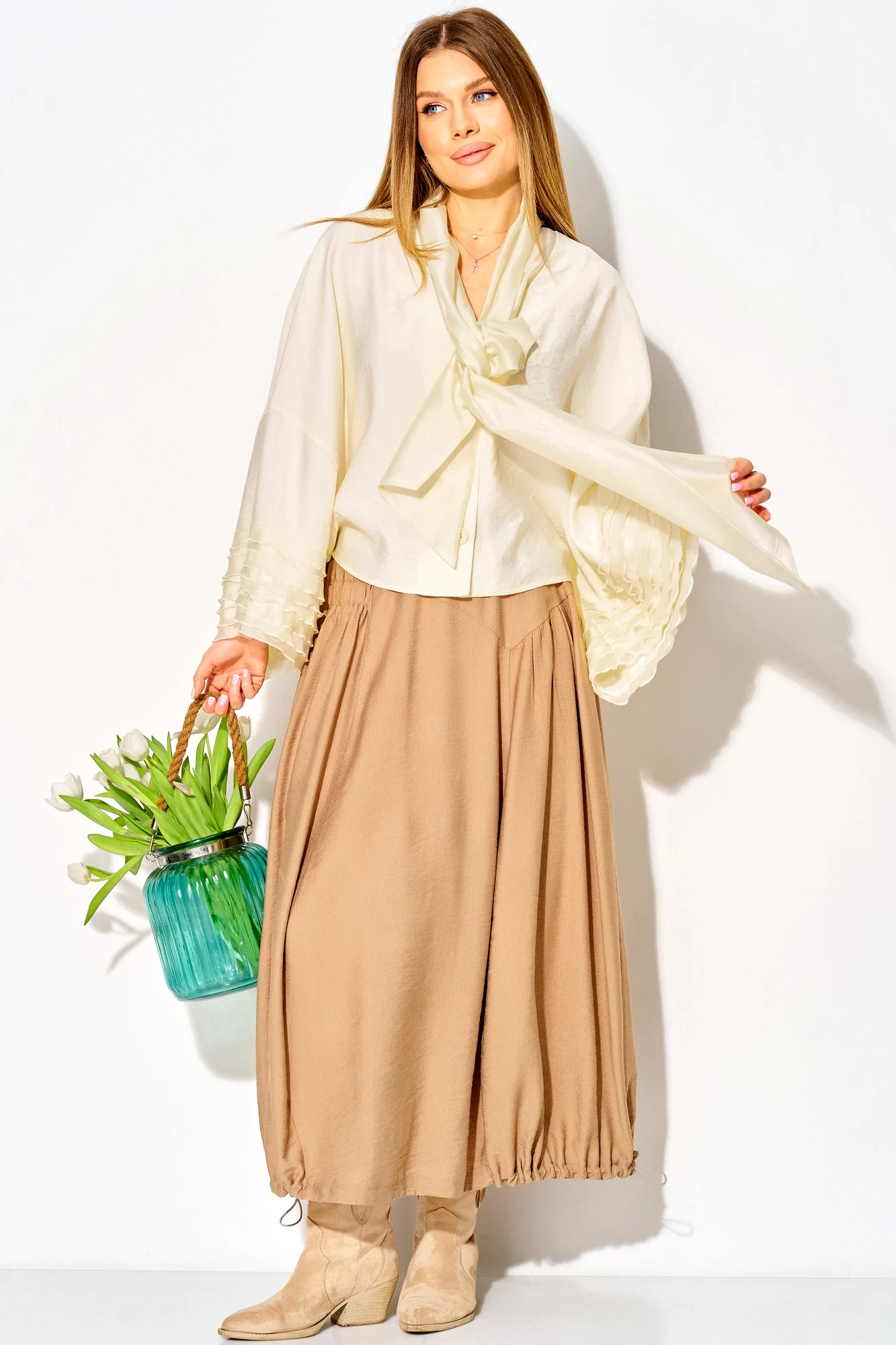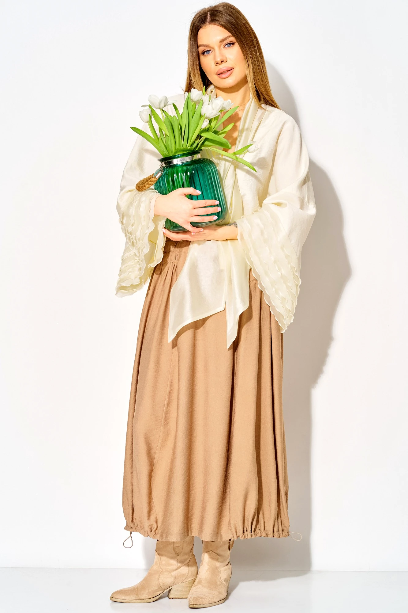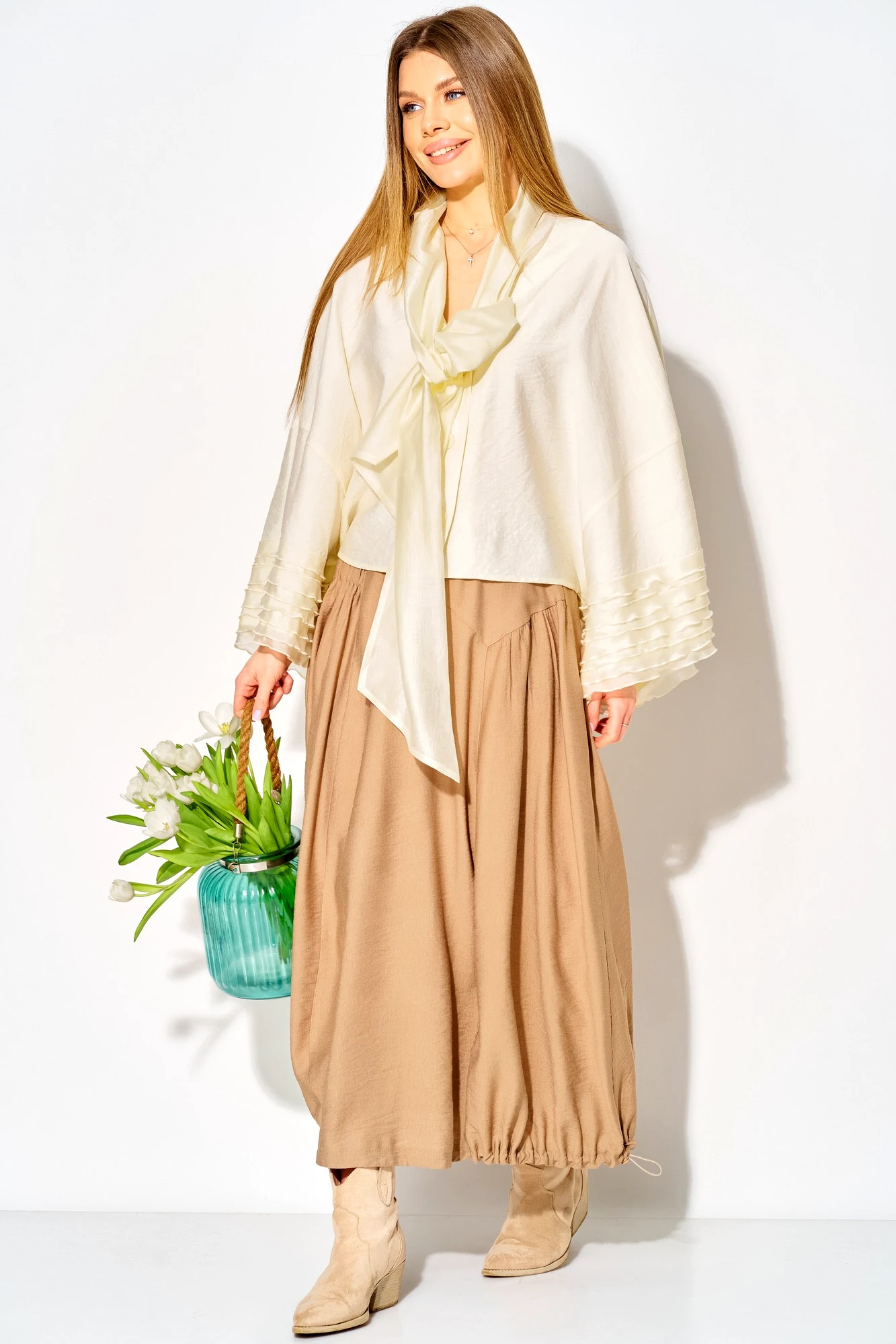 Изысканный комплект от LAIKONY в стиле бохо, состоящий из блузы и юбки. Блуза свободного силуэта длиной чуть выше линии бедер очаровывает своей легкостью и элегантностью. линия плеча спущена. Вырез горловины V-образный с элегантным шалевым воротником. Втачные рукава с изящными воланами, застежка центральная на три пуговицы. Юбка длиной в пол создана для тех, кто ценит комфорт и стиль. Силуэт свободный, плавно расширяющийся к низу. Притачной пояс с эластичной тесьмой обеспечивает идеальную посадку на талии. Рельефные швы и кокетки на переднем полотнище придают юбке структуру и оригинальность, на правой кокетке эластичная тесьма. Низ юбки оформлен фиксирующими элементами. Комплект выполнена из вискозы с крэш-эффектом. Ткань средней плотности, не тянется. Этот комплект — идеальный выбор для современных женщин, которые хотят выглядеть стильно и чувствовать себя комфортно в любой обстановке. Позвольте себе роскошь быть неповторимой!