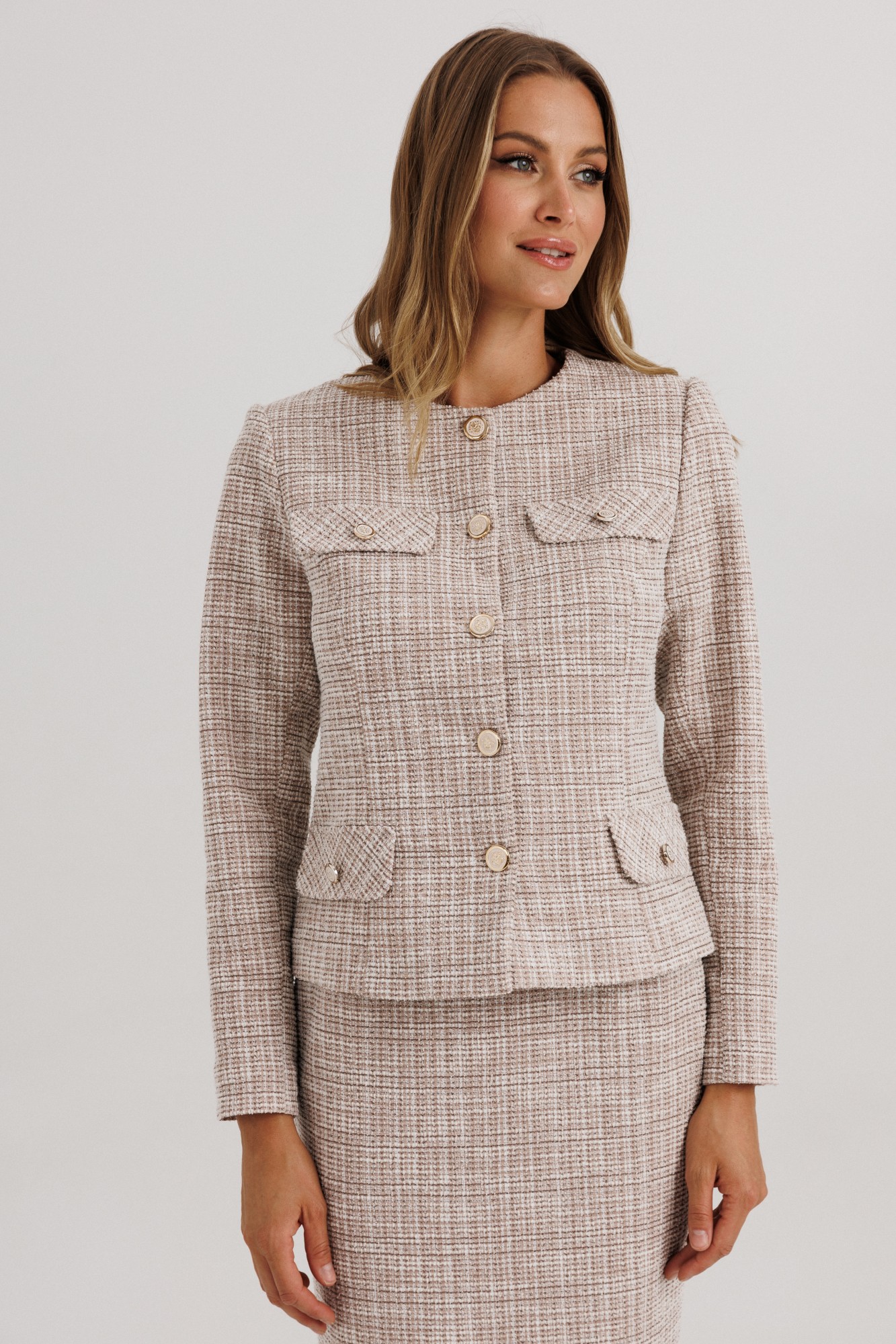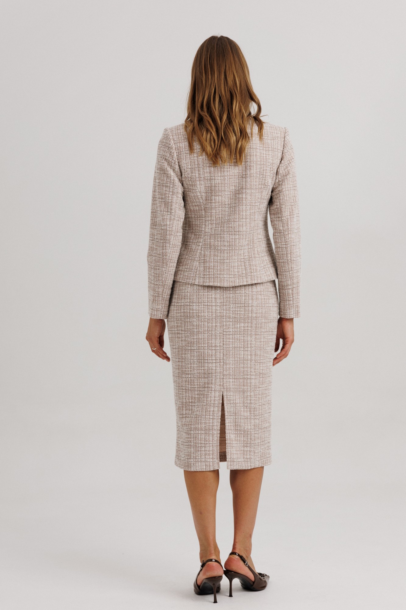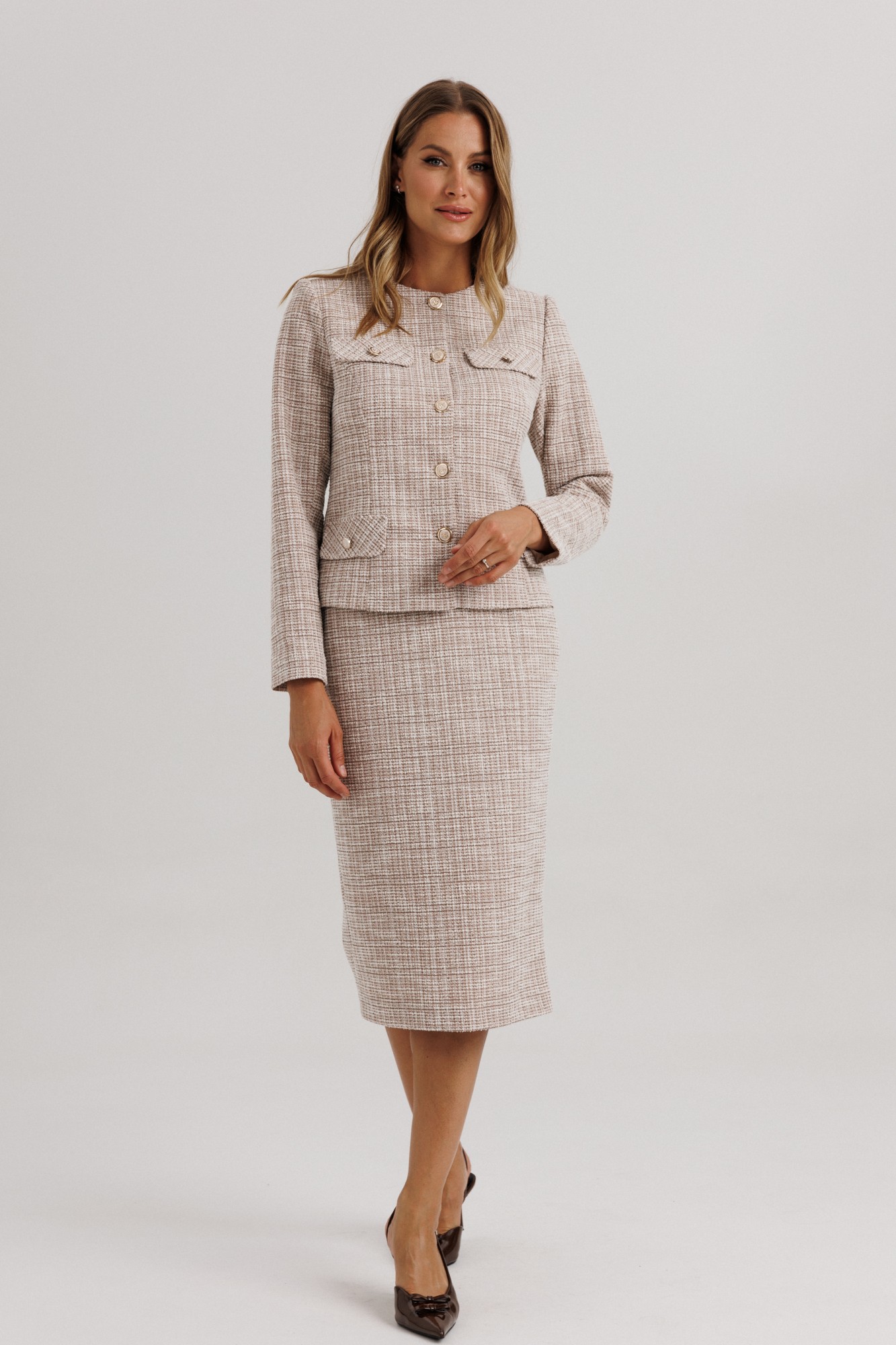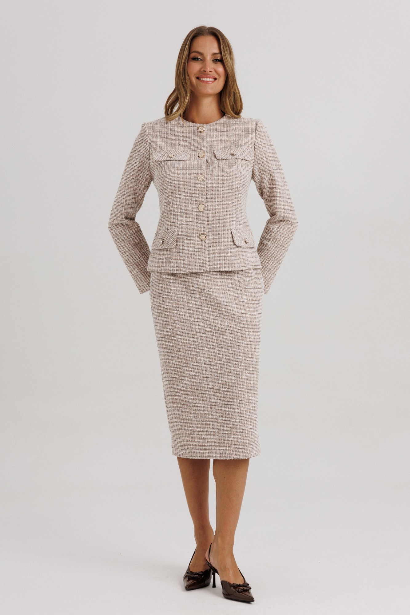 Классический комплект в стиле «Шанель», состоящий из жакета и юбки прилегающего силуэта на подкладке. Жакет с притачными бочками на спинке, полочке и ложными карманами-клапанами на линии груди и заниженной линии талии. Клапаны закреплены декоративными пуговицами. Застежка фронтально- вертикальная также на петли /пуговицы. Рукав втачной двухшовный. Длина жакета по спинке 54-55 см, длина рукава 61-62 см. Горловина округлой формы. Юбка зауженная к низу. В среднем шве расположена потайная молния и открытый разрез. Верхний край юбки обработан обтачным поясом. Длина юбки по боковому шву 69 см. Представленная фурнитура может отличаться от представленной на фото/видео материале. Особые рекомендации: рекомендуется холодная деликатная ручная стирка, без использования отбеливающих СМС, без интенсивного трения. Сушка в вертикальном положении. ВТО с минимальным паром.