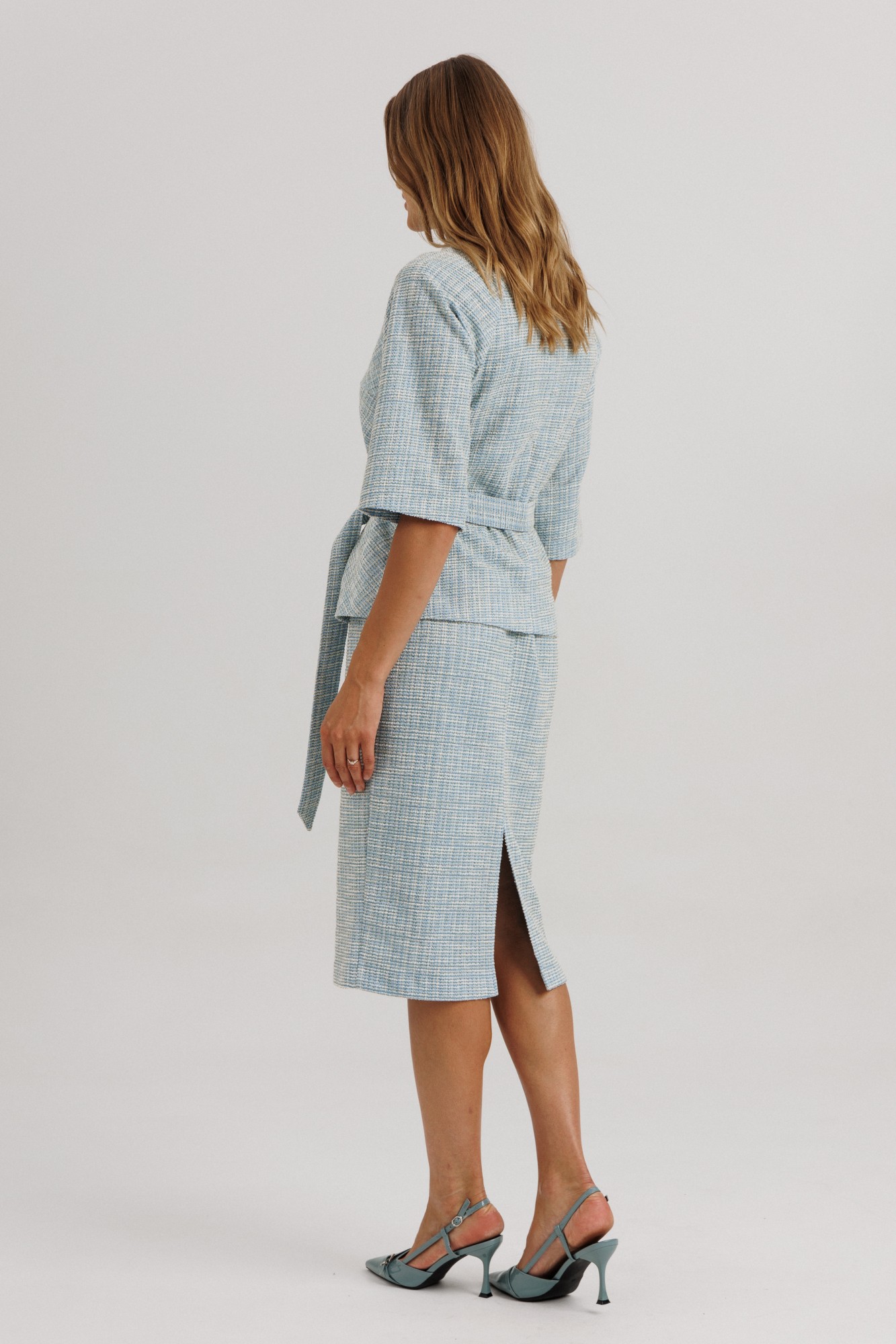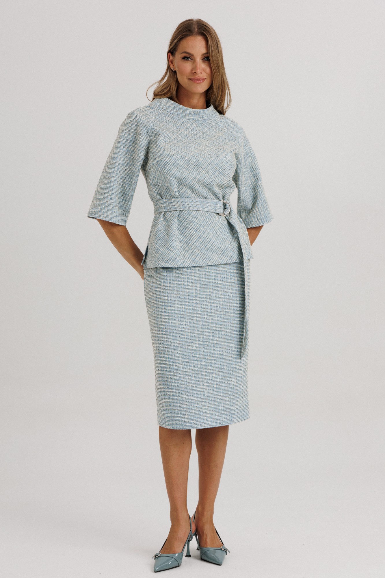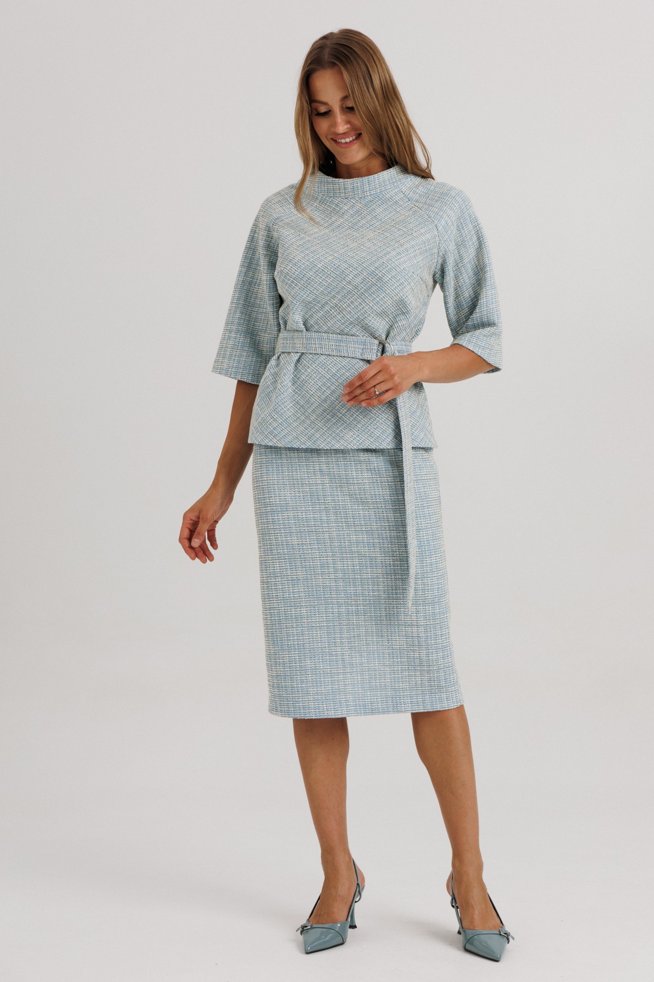 Блузон прилегающего силуэта с разрезами по боковым швам (по 7 см). На передней части изделия горизонтальные вытачки. В среднем шве спинки потайная застежка - молния. Горловина обработана стойкой-воронкой высотой 4,5 см. Длина блузона по спинке от стойки 54 см. Рукав-реглан, чуть расклешен к низу. Длина рукава от горловины-стойки 46 см. Юбка на подкладке прямого силуэта, чуть зауженная к низу. В среднем шве размещена потайная молния и открытый разрез. На линии талии размещены классические вытачки. Пояс внутренний, обтачной. Длина юбки по боковому шву 70 см. Высота разреза 21 см. Комплект дополнен съемным текстильным поясом на пряжке. Представленная фурнитура может отличаться от представленной на фото/видео материале. Особые рекомендации: рекомендуется холодная деликатная ручная стирка, без использования отбеливающих СМС, без интенсивного трения. Сушка в вертикальном положении. ВТО с минимальным паром.